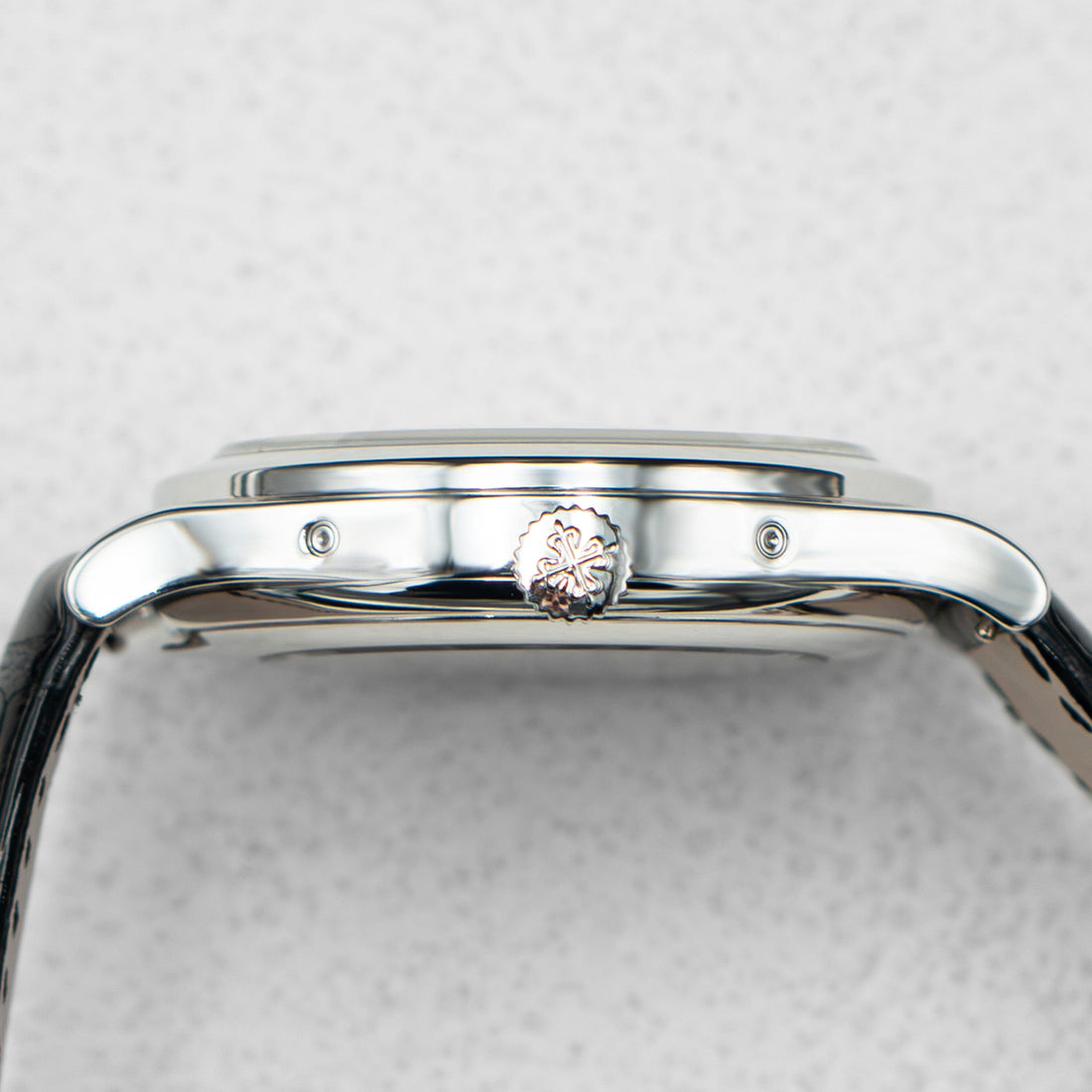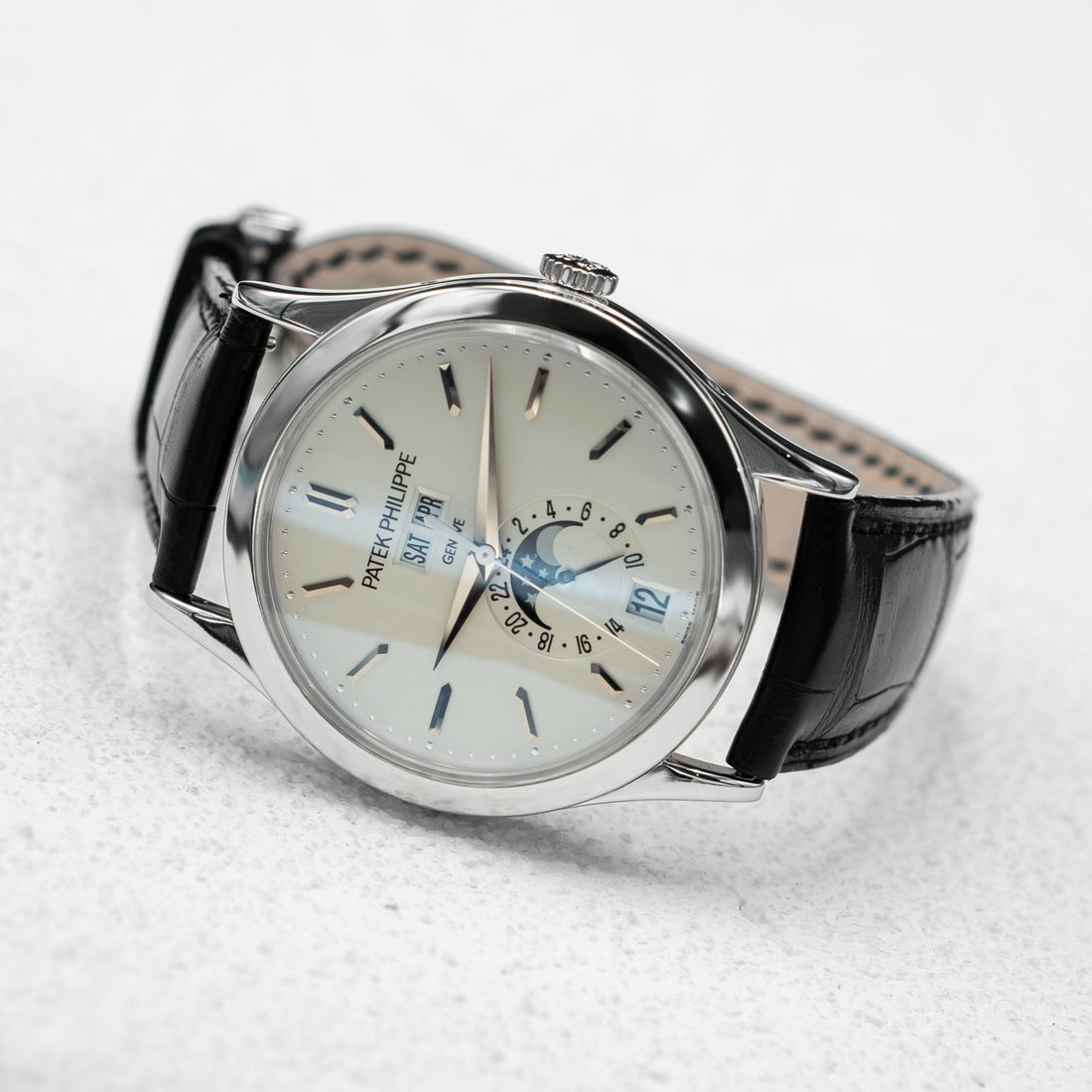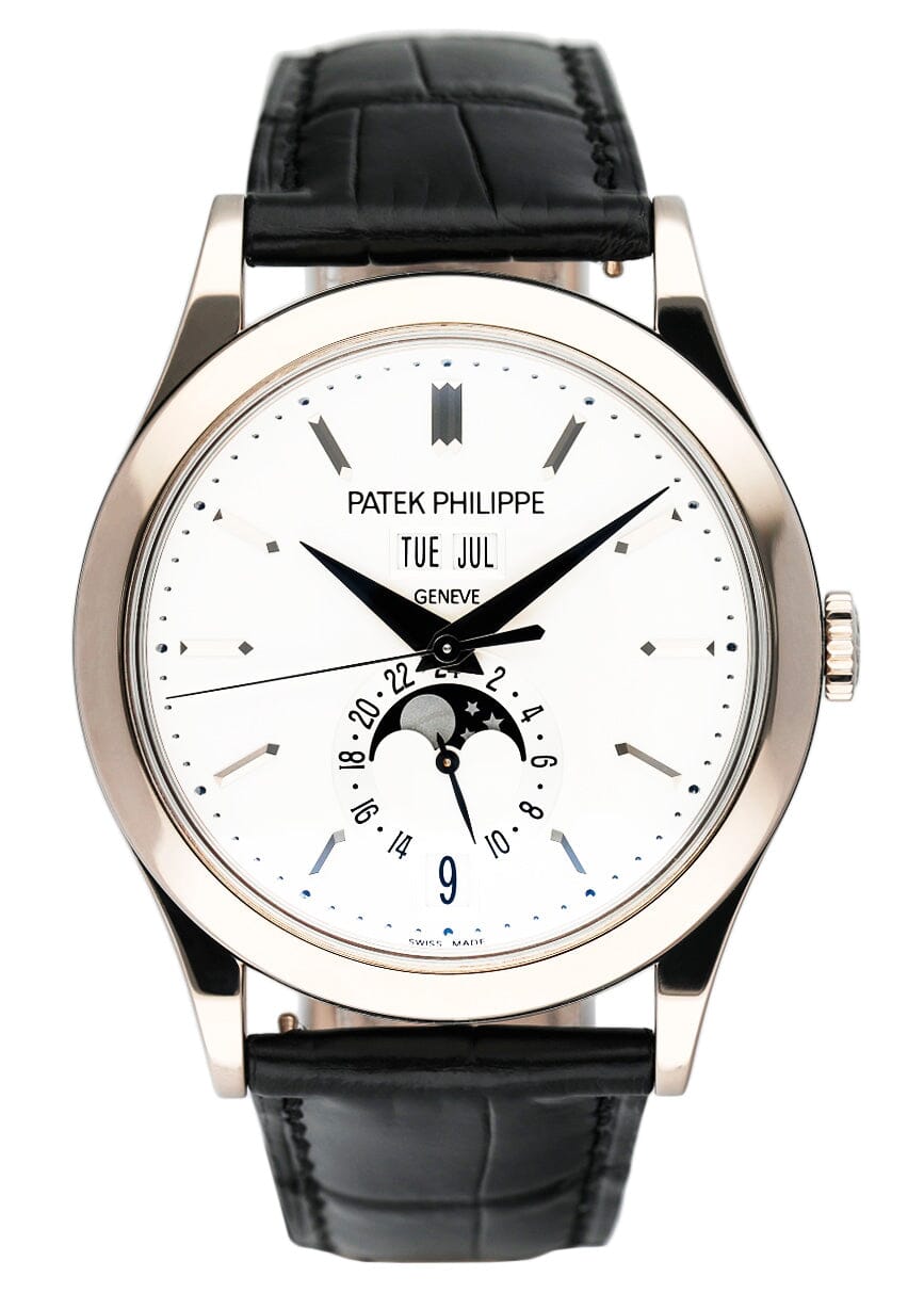 Patek Philippe Complications 5396G-011 Mens Watch. 38.5mm 18K white gold case and 18K white gold bezel. Silver dial with white gold hands and white gold index hour markers. Annual calendar displays with a moon phase indicator. Black leather strap with 18K white gold deployment buckle. Will fit up to a 7.5-inch wrist. Sapphire crystal. Transparent sapphire crystal case back. Automatic self-winding movement. This watch comes with original Box and Papers.