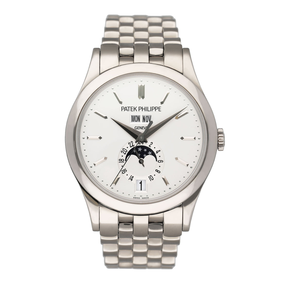 Patek Philippe Complications 5396/1G-010 Mens Watch. 38.5mm 18K white gold case. 18K white gold bezel. Silver dial with white gold hands and white gold index hour markers. Annual calendar displays with a moon phase indicator. 18K white gold bracelet with 18K white gold fold over clasp. Will fit up to a 7.25-inch wrist. Sapphire crystal. Transparent sapphire crystal case back. Automatic self-winding movement. This watch comes with original Box and Papers.