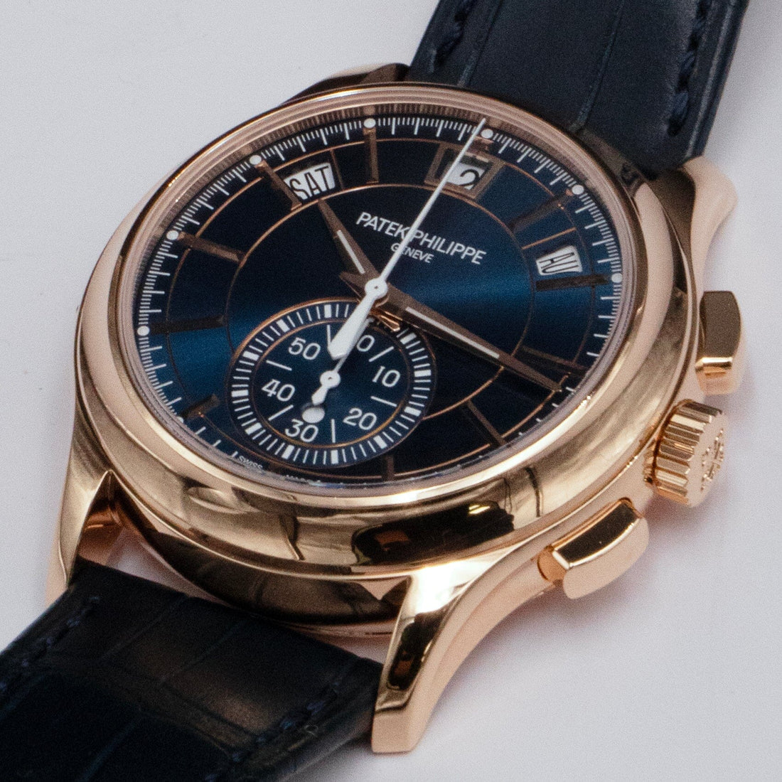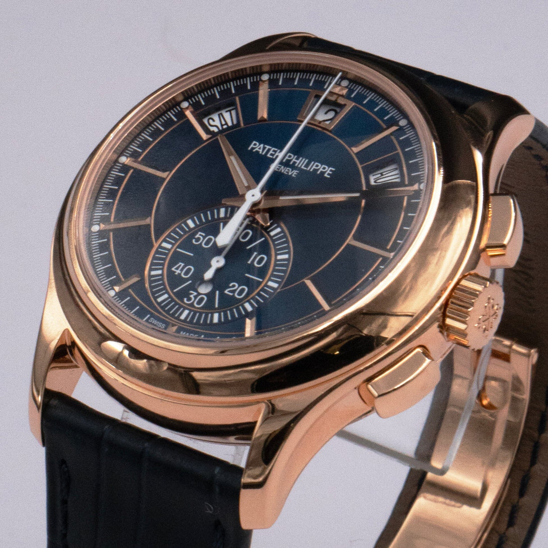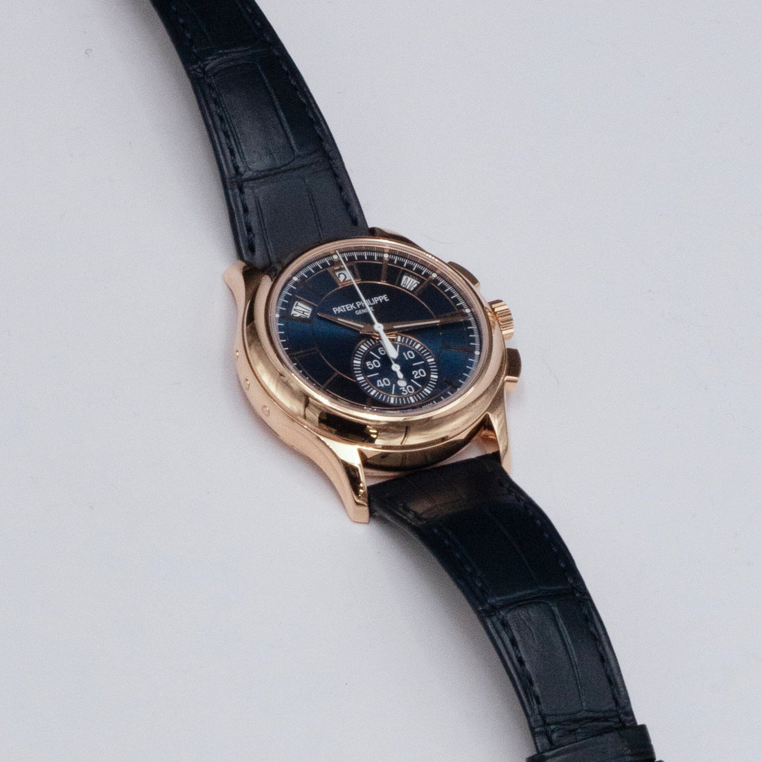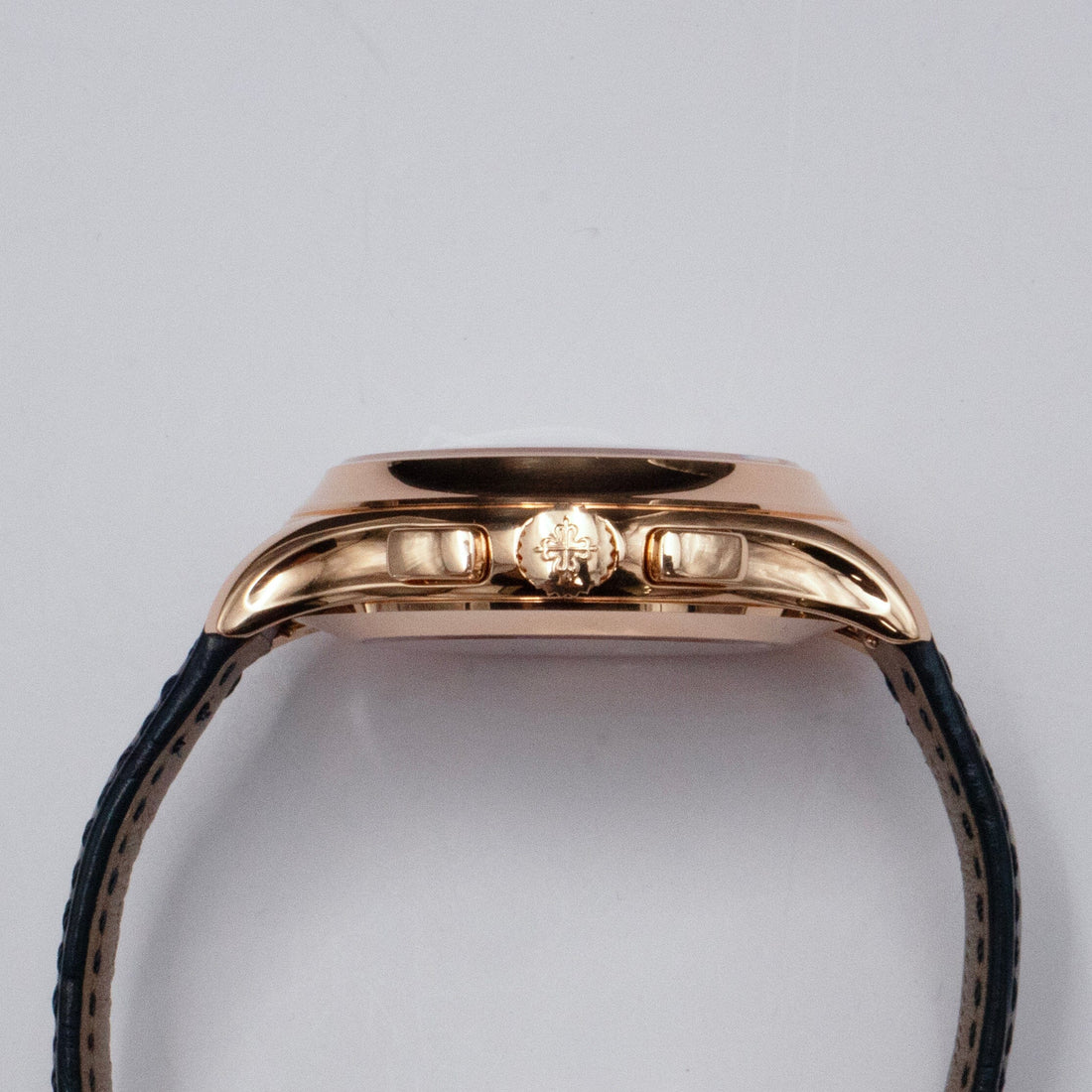 Patek Philippe Complications 5905R-001 Mens Watch. 42mm 18K rose gold case. 18K rose gold hobnail bezel. Blue sunburst dial with rose gold hands and index hour markers. Small second dial display at 6 o'clock position. Annual calendar. The date is displayed at 12 o'clock. The day is displayed between 10 & 11 o'clock. The month is displayed between 1 & 2 o'clock. Blue leather Patek strap with 18K rose gold buckle. Will fit up to a 7.5-inch wrist. Sapphire crystal. Transparent sapphire crystal case back. Caliber CH 28-520 QA 24H automatic self-winding movement. This watch comes with original Box and Papers.