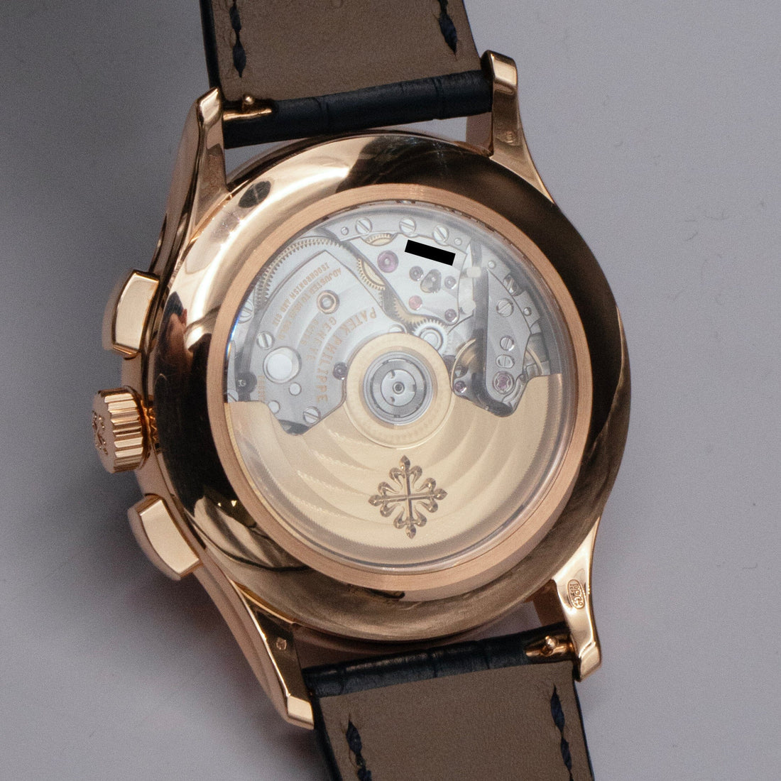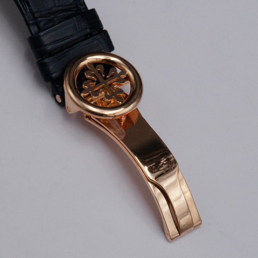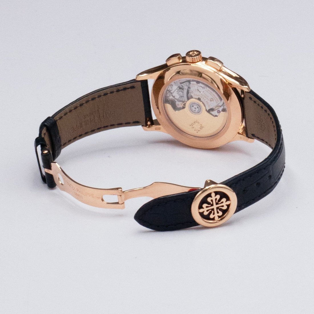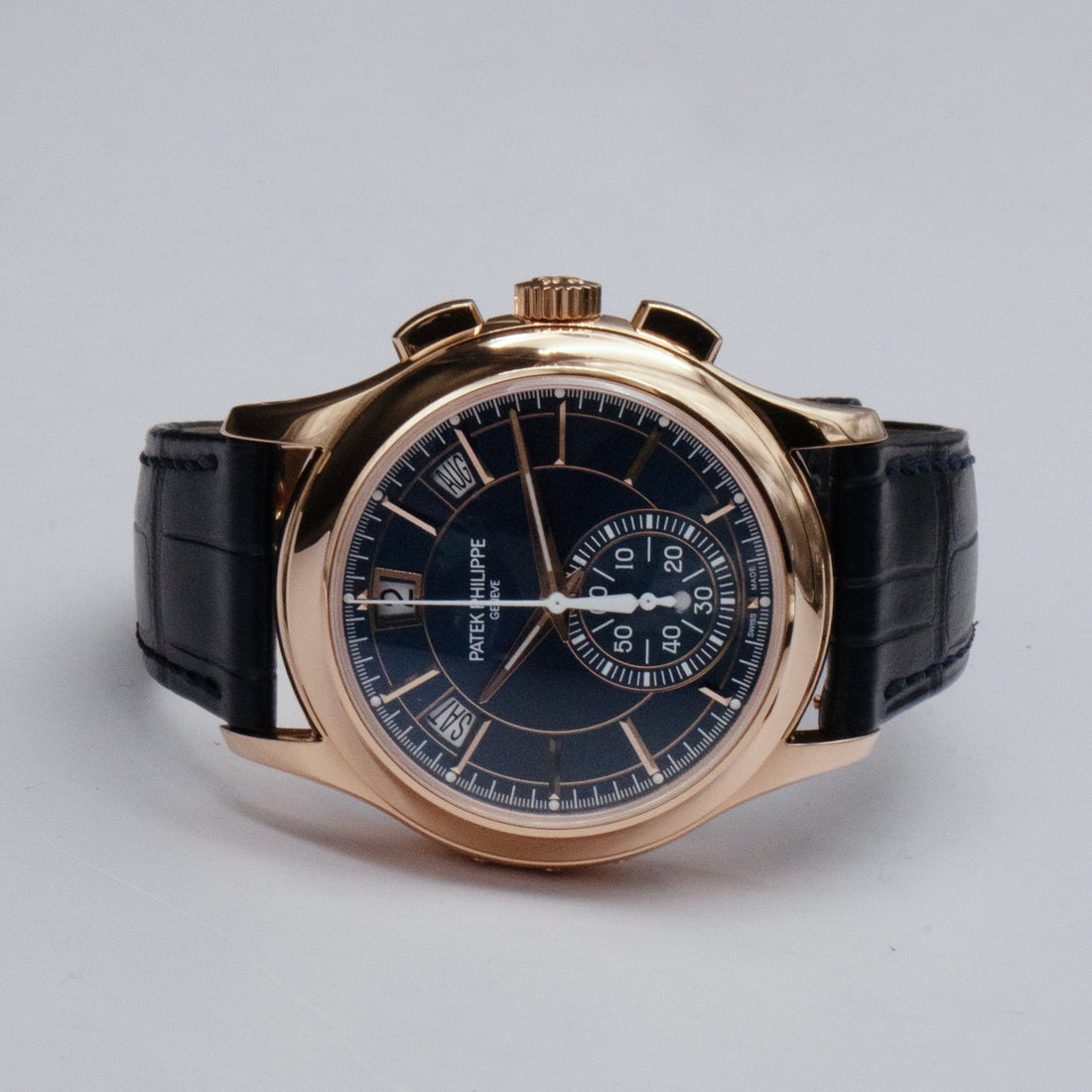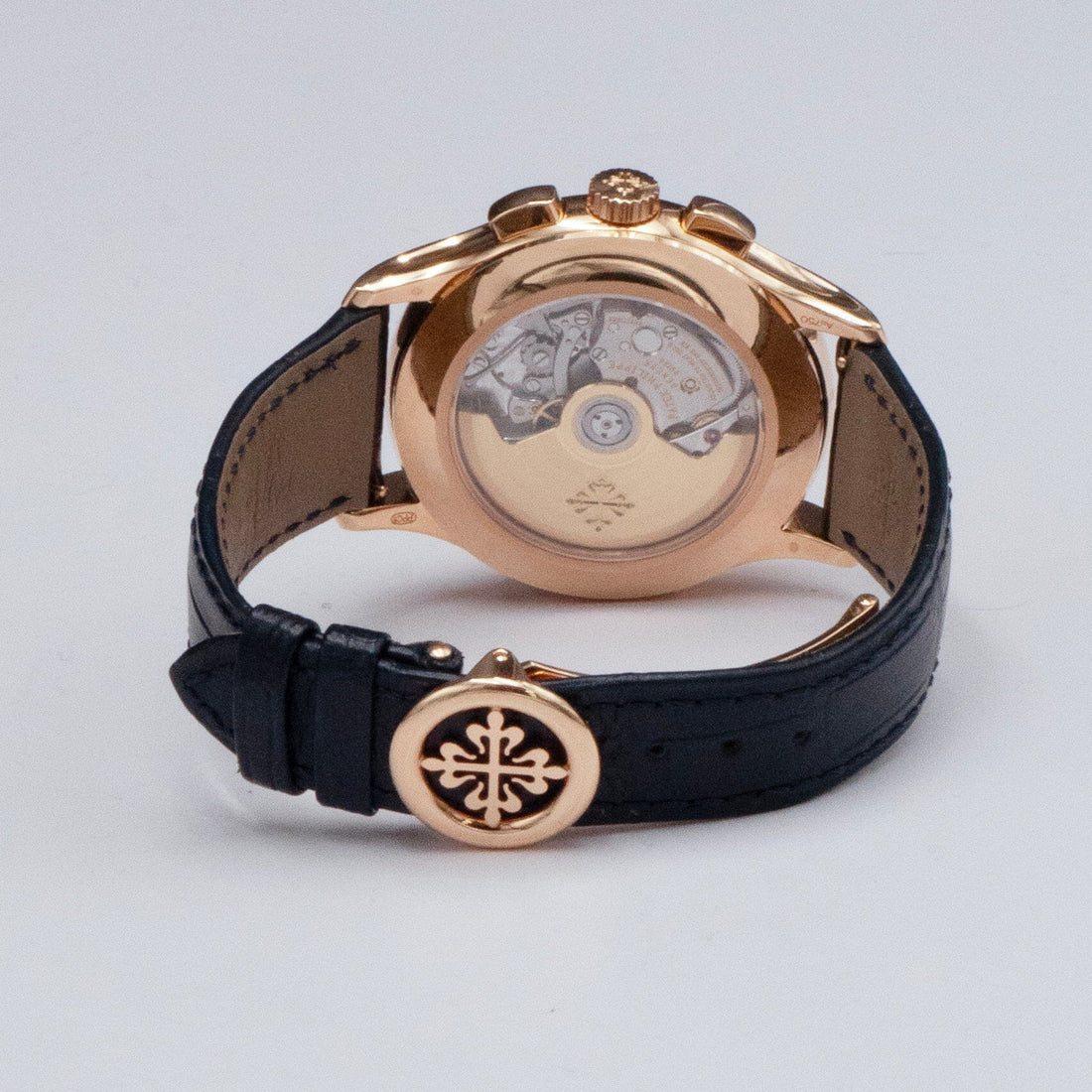 Patek Philippe Complications 5905R-001 Mens Watch. 42mm 18K rose gold case. 18K rose gold hobnail bezel. Blue sunburst dial with rose gold hands and index hour markers. Small second dial display at 6 o'clock position. Annual calendar. The date is displayed at 12 o'clock. The day is displayed between 10 & 11 o'clock. The month is displayed between 1 & 2 o'clock. Blue leather Patek strap with 18K rose gold buckle. Will fit up to a 7.5-inch wrist. Sapphire crystal. Transparent sapphire crystal case back. Caliber CH 28-520 QA 24H automatic self-winding movement. This watch comes with original Box and Papers.