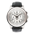 Patek Philippe Complications Chronograph 5070G-001 Mens Watch. 42mm 18K white gold case. 18K white gold smoothed bezel. Silver dial with black hands and Arabic numeral hour markers. Small second display at 9 o'clock. 30 minute counter display at 3 o'clock. Black leather strap with 18K white gold deployment buckle. Will fit up to 7-inch wrist. Sapphire crystal. Transparent sapphire case back. Mechanical hand wind movement. This watch comes with original Box and Papers.