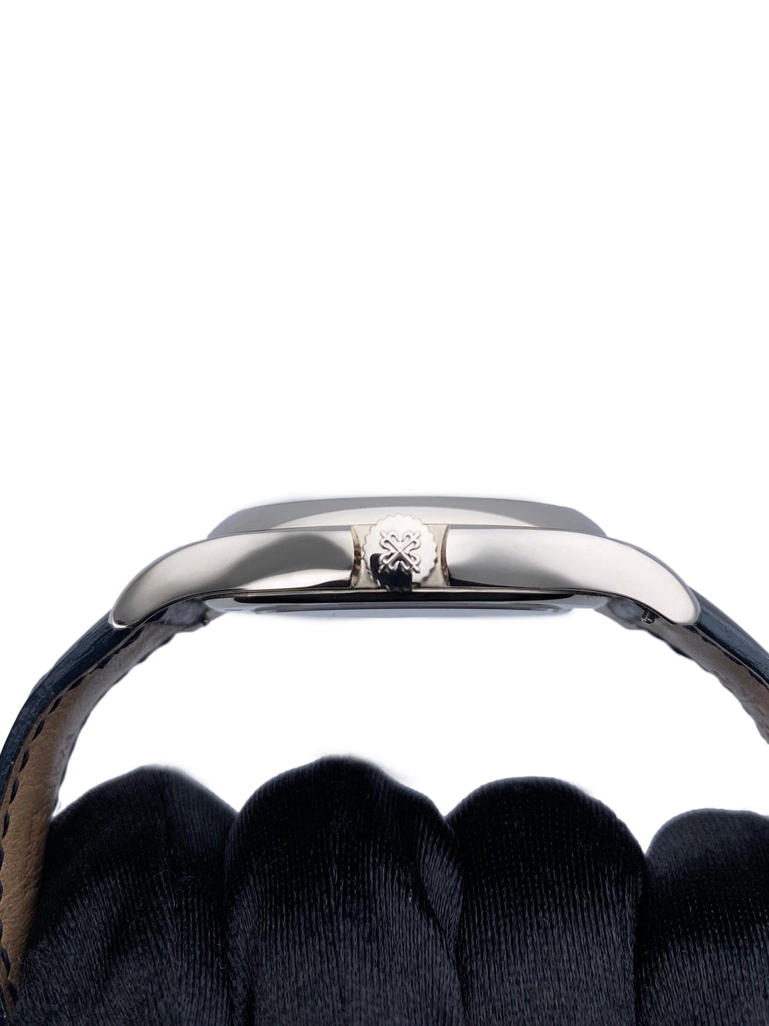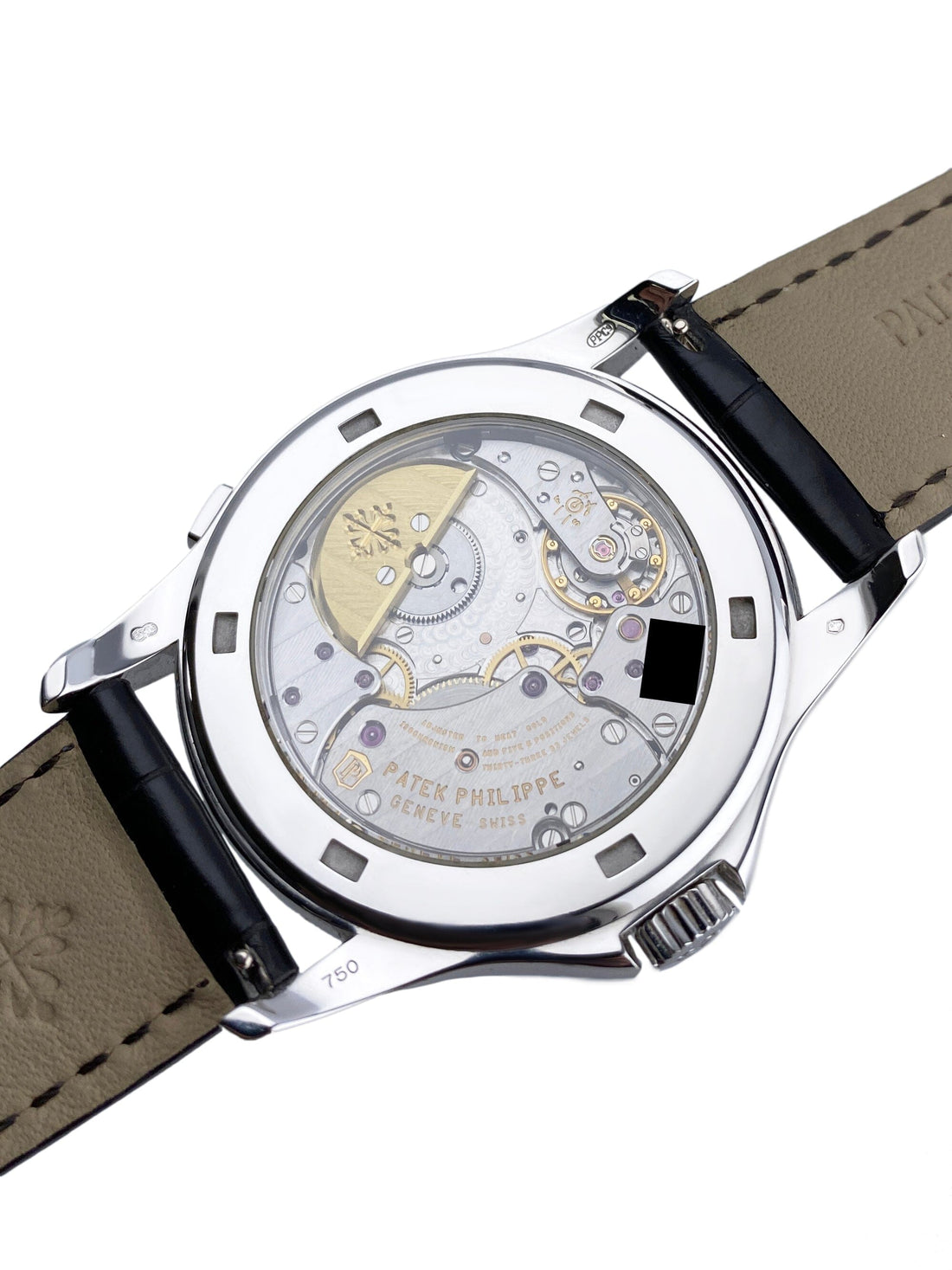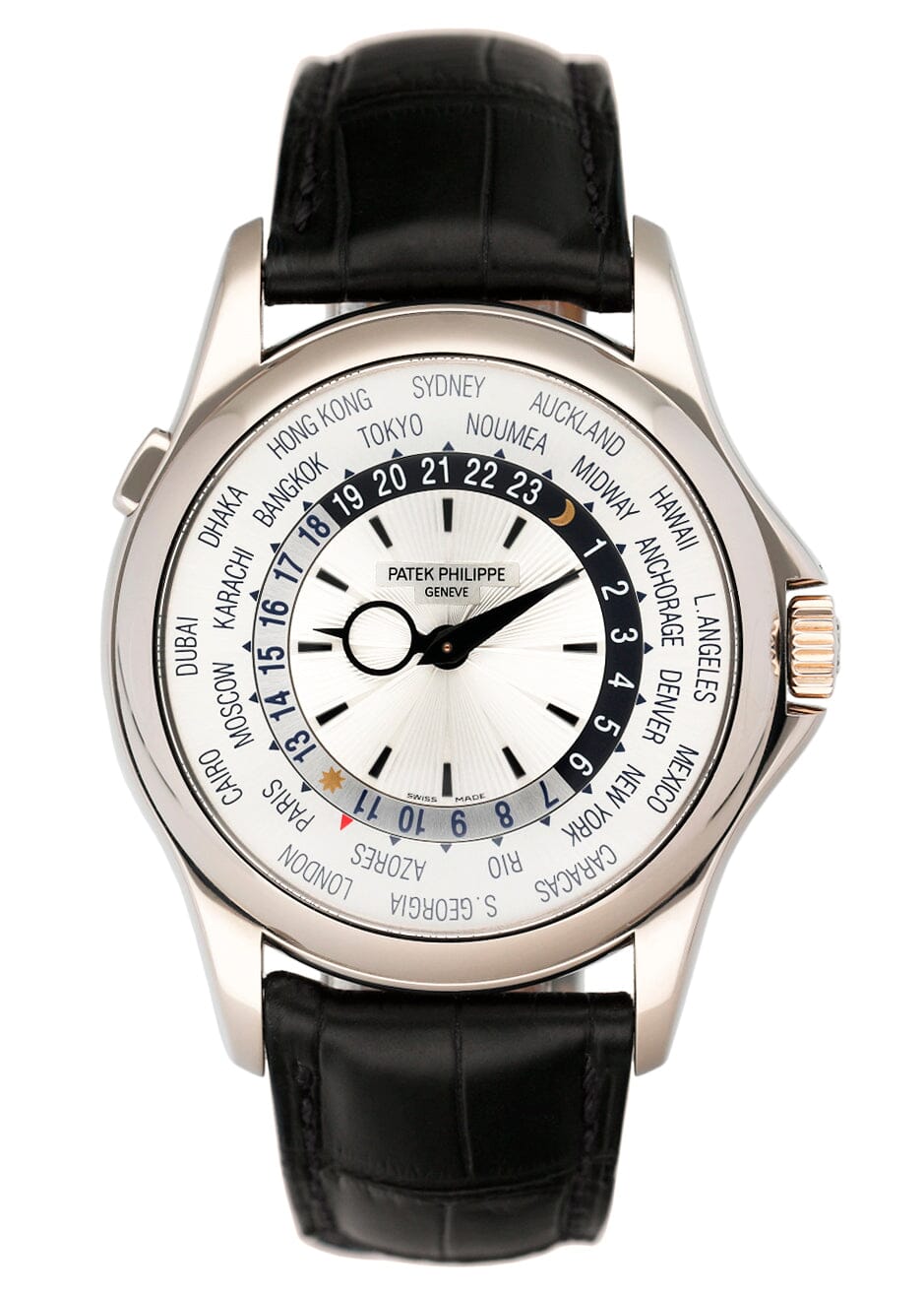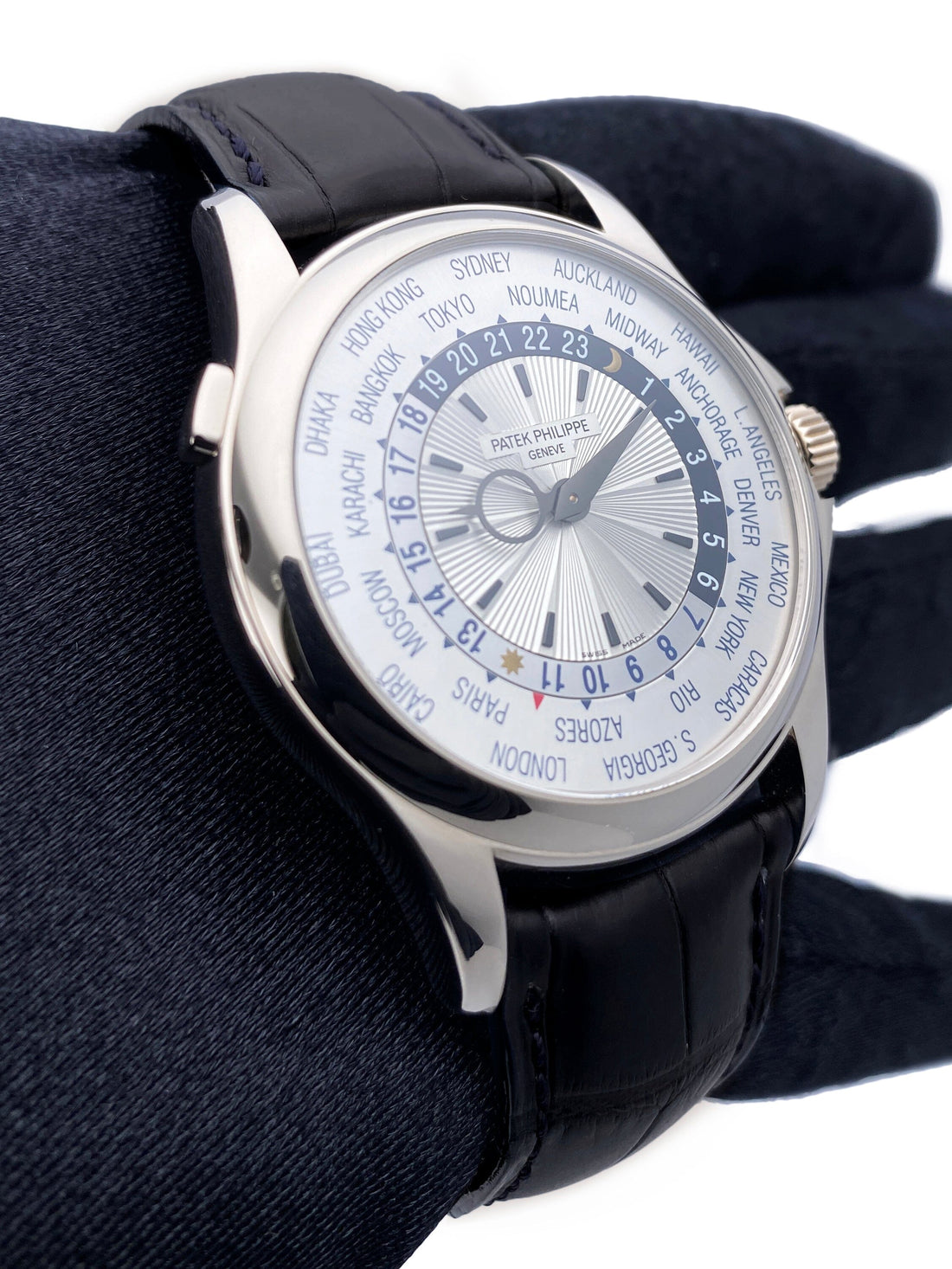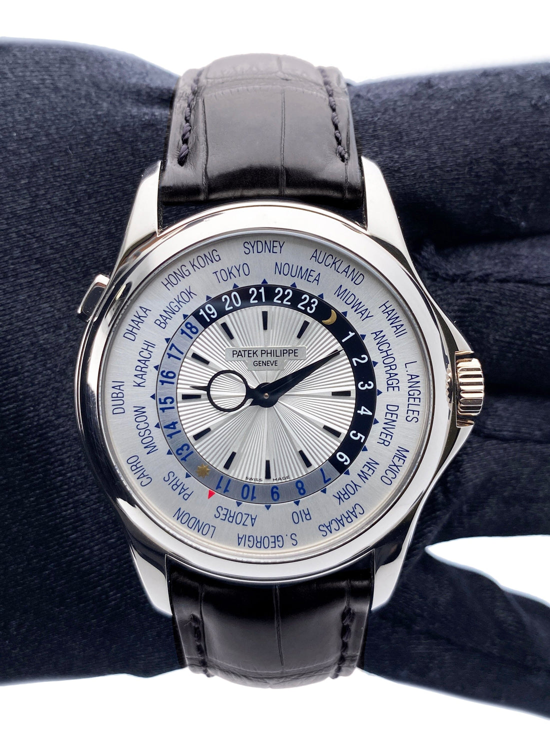 Patek Philippe World Time 5130G-001 Mens Watch. 39mm 18K white gold case. 18K white gold smooth bezel. World Time dial with white gold hands and index hour marker. World Time dial: the inner face is Guilloche silver. The settable disc in silver and black making both the nocturnal and diurnal hours. The outer dial show reference city represents one of the 24 principal time zones. Black leather strap with 18K white gold deployment buckle. Will fit up to 7.5-Inch wrist. Sapphire crystal. Transparent sapphire crystal case back. Automatic self-winding movement.