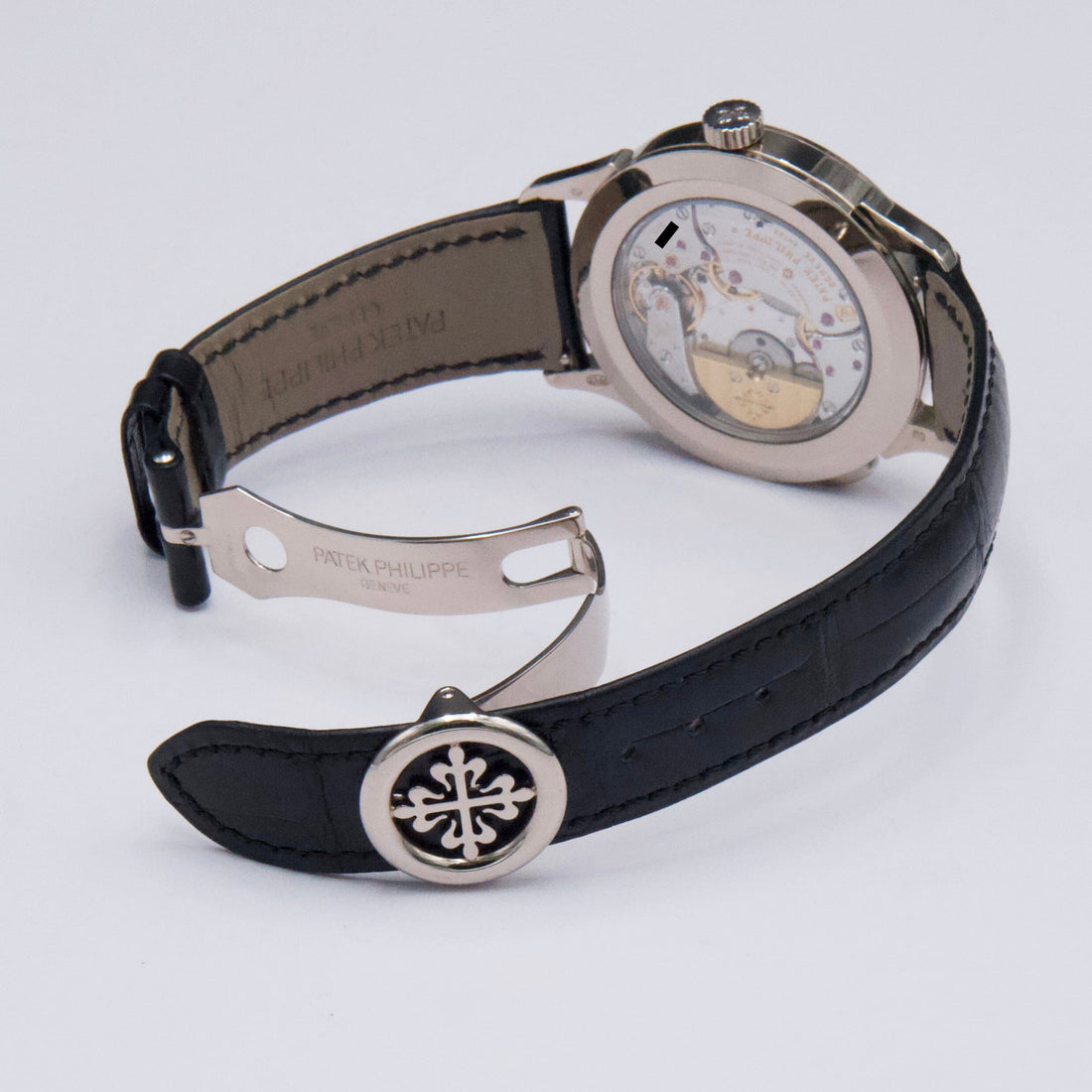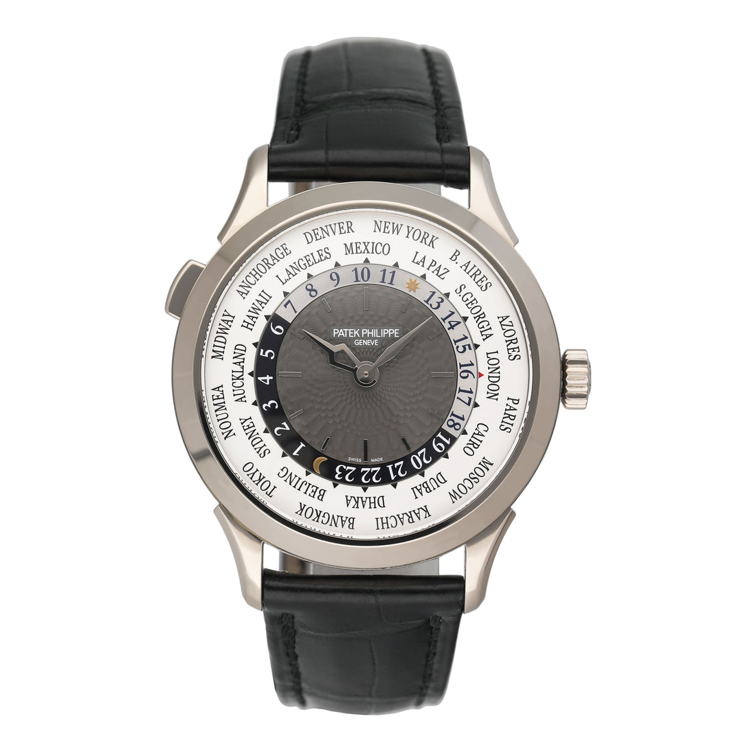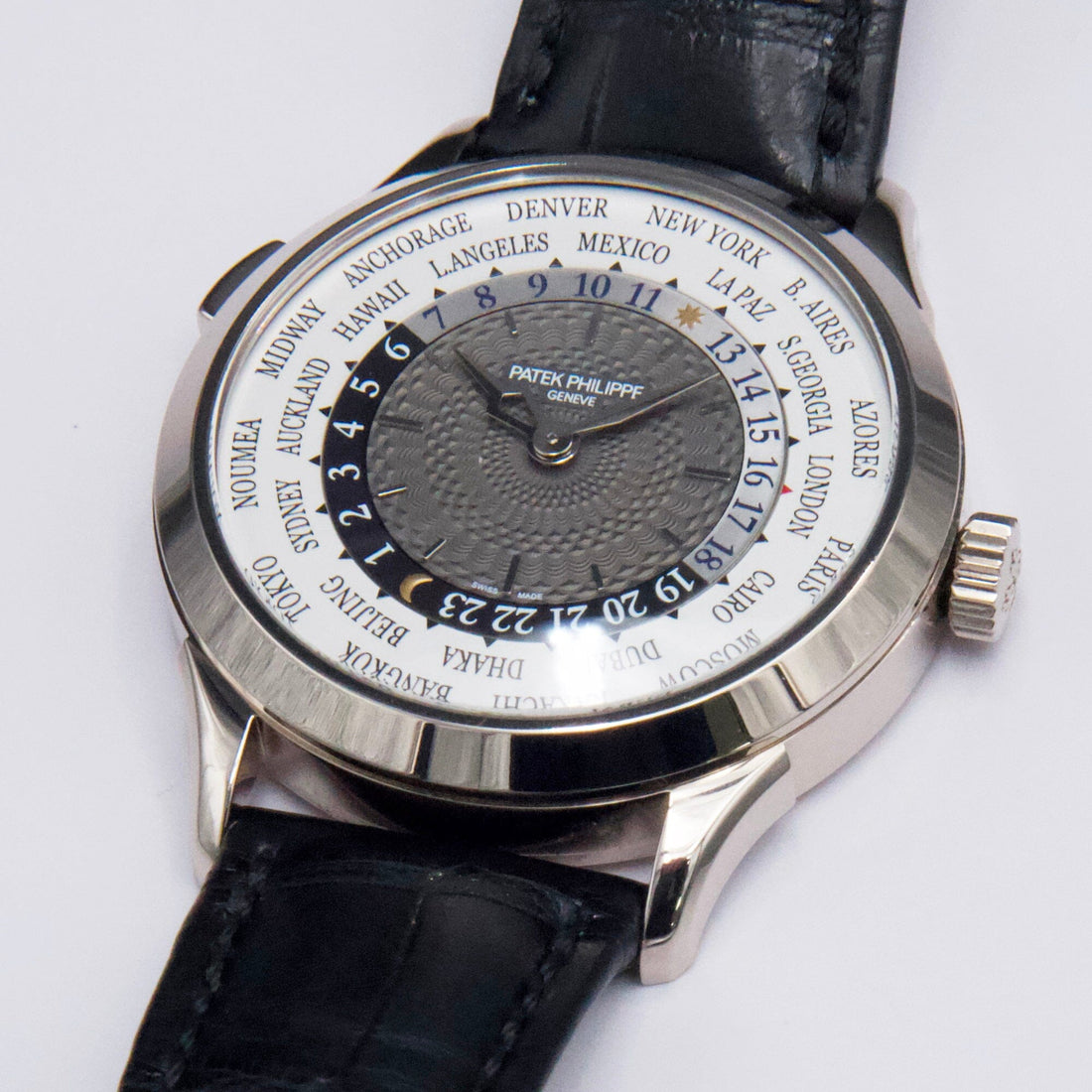 Patek Philippe World Time 5230G-014 Mens Watch. 39mm 18K white gold case. 18K white gold smooth bezel. World Time dial with white gold hands and index hour marker. World Time dial: the inner face is Guilloche silver. The settable disc in silver and black making both the nocturnal and diurnal hours. The outer dial show reference city represents one of the 24 principal time zones. Black leather strap with 18K white gold deployment buckle. Will fit up to 7.5-Inch wrist. Sapphire crystal. Transparent sapphire crystal case back. Automatic self-winding movement. This watch comes with original Box and Papers.
