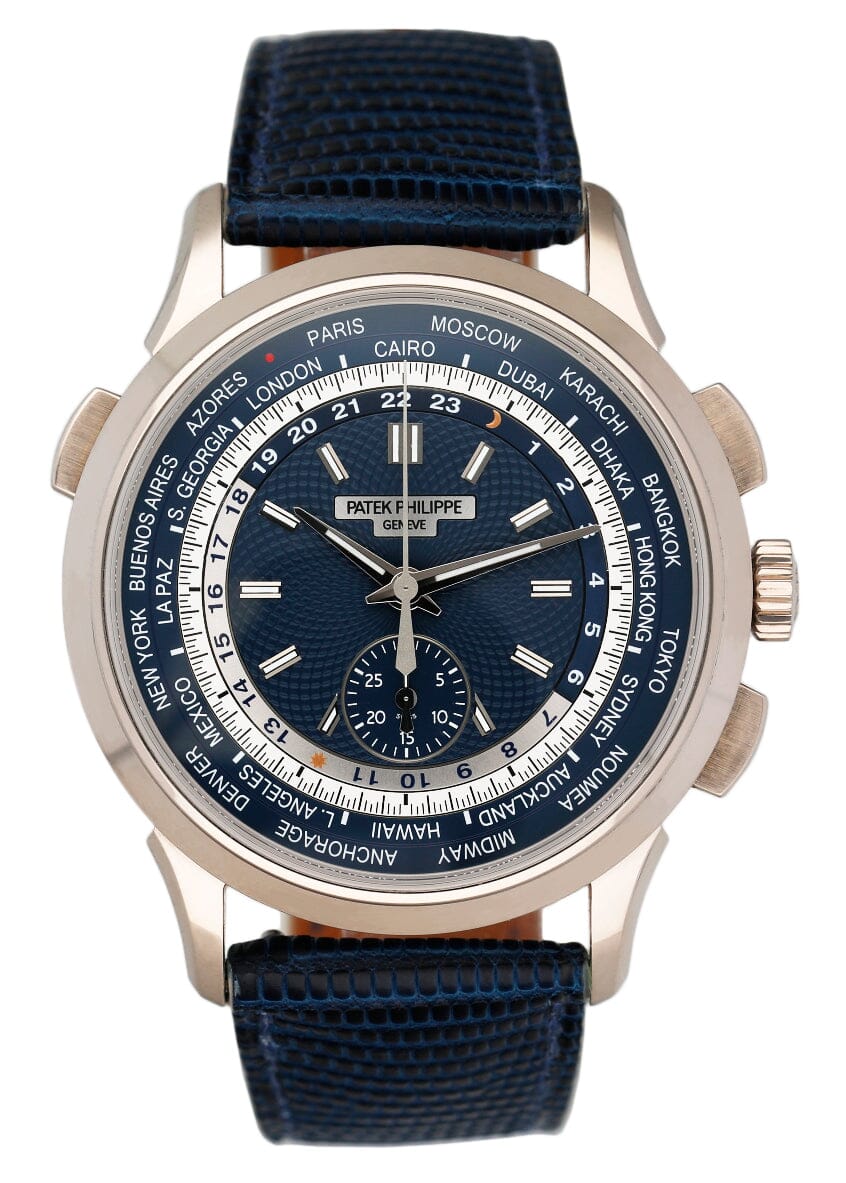 Patek Philippe World Time 5930G-001 Mens Watch. 39.5mm 18K white gold case. 18K white gold smooth bezel. World Time dial with white gold hands and index hour marker. World Time dial: the inner face is Guilloche blue. The settable disc in silver and blue making both the nocturnal and diurnal hours. The outer dial show reference city represents one of the 24 principal time zones. Blue leather strap with 18K white gold deployment buckle. Will fit up to 7.5-Inch wrist. Sapphire crystal. Transparent sapphire crystal case back. Automatic self-winding movement. This watch comes with original Box and Papers.