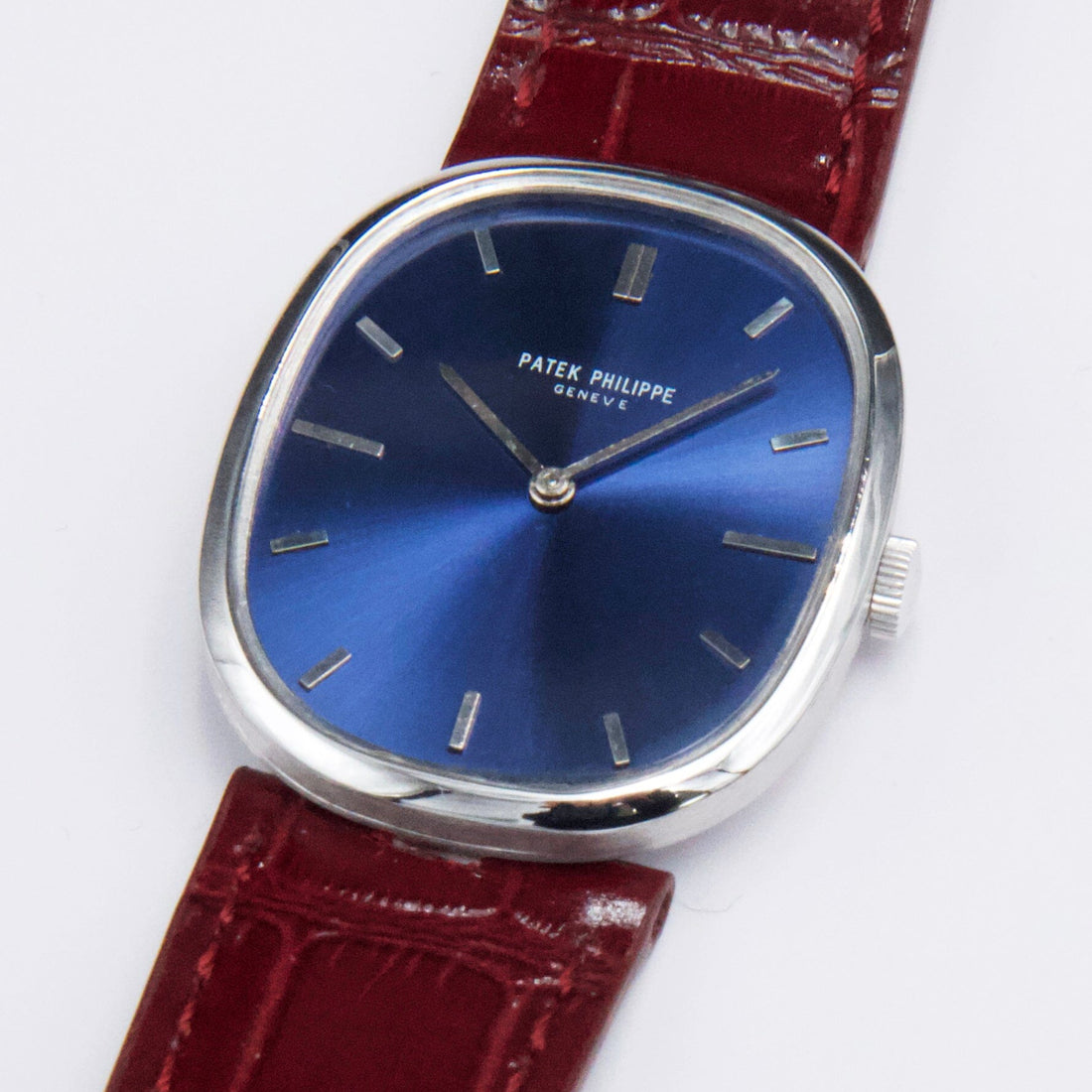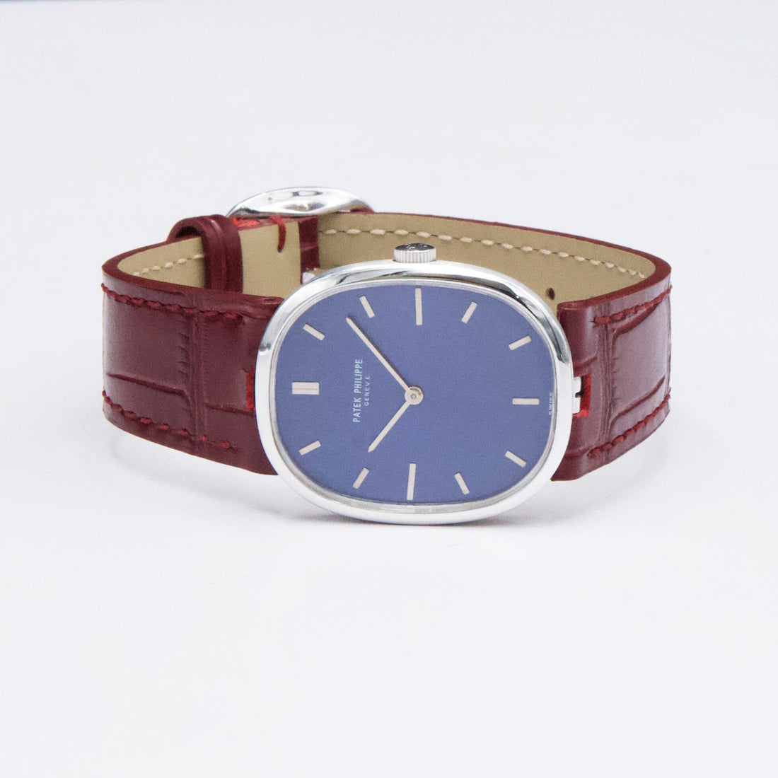 Patek Philippe Golden Ellipse 3584G Ladies Watch. 27mm 18K white gold case. 18K white gold bezel. Blue dial with silver-tone hand and index hour markers. Burgundy aftermarket leather strap with 18K white gold buckle. Will fit up to 7-inch wrist. Sapphire crystal. 18K white gold case back. Mechanical hand-winding movement.