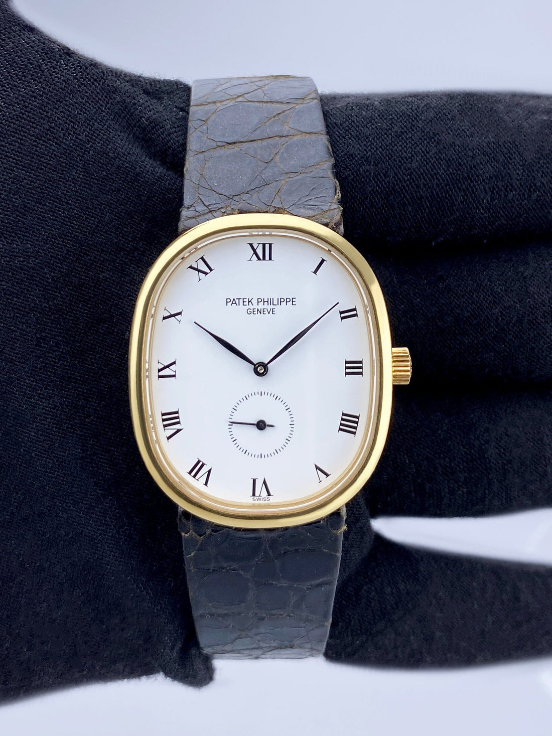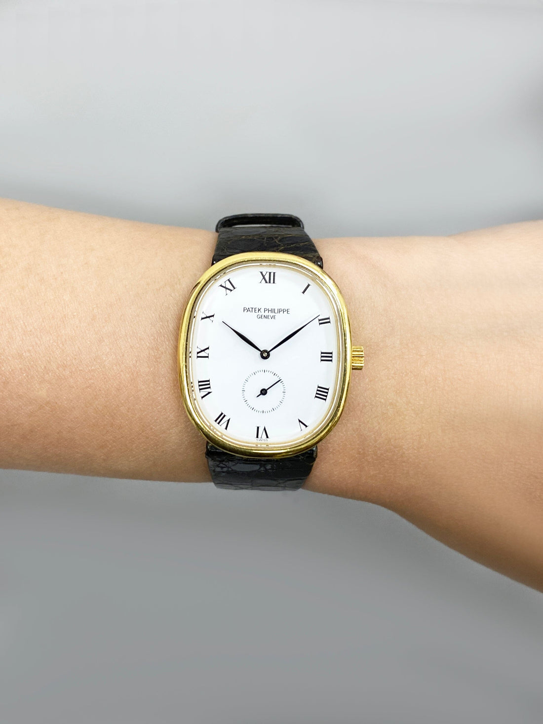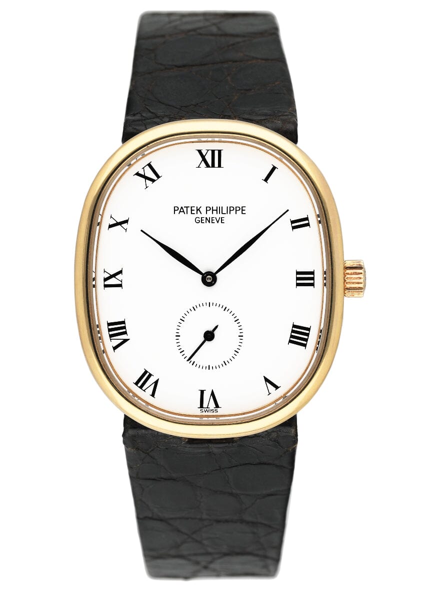 Patek Philippe Ellipse 3978J Ladies Watch. 29mm 18K yellow gold case. 18K yellow gold bezel. White dial with gold hands and index hour markers. Small second at 6 o'clock. Black leather strap with 18K yellow gold buckle. Will fit up to 7-Inch wrist. Sapphire crystal. 18K yellow gold back case. Mechanical hand winding movement.