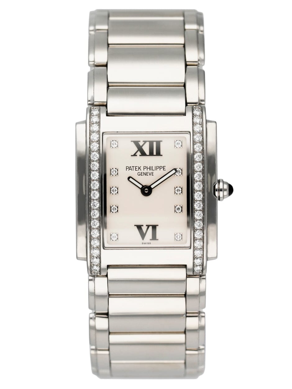 Patek Philippe Twenty-4 4910/10A-011 Ladies Watch. 25mm stainless steel case. Stainless steel with original factory diamond set bezel. White dial with steel hands and Roman numeral & original factory diamond set hour markers. Stainless steel bracelet with butterfly clasp. Will fit up to a 6-inch wrist. Sapphire crystal. Stainless steel case back. Quartz: Battery powered movement. This watch comes with original Papers.
