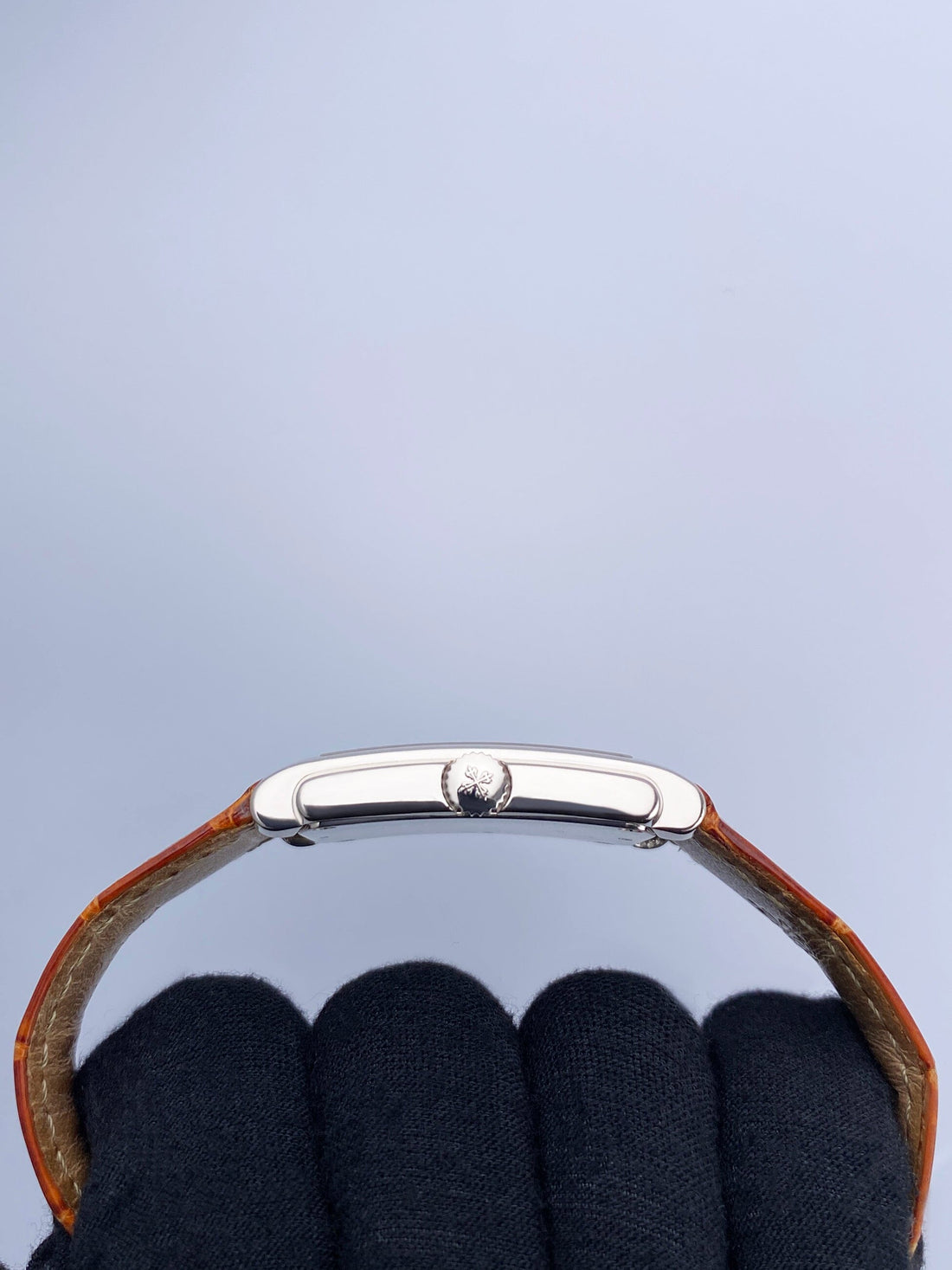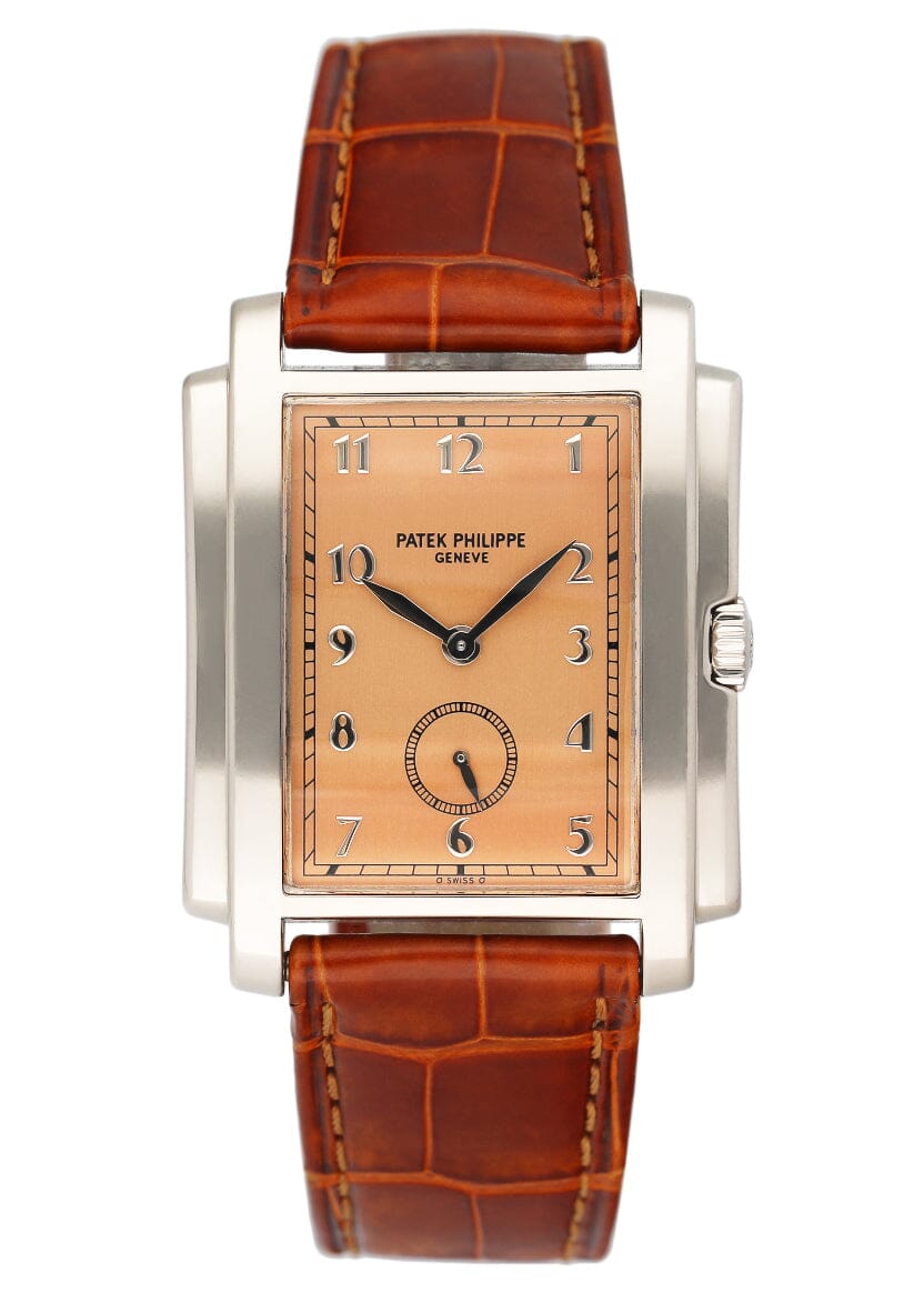 Patek Philippe Gondolo 5024G Mens Watch. 30.00mm 18k white gold case. 18k white gold bezel. Salmon dial and arabic numeral hour markers. Sapphire Crystal. Small Second. bracelet with 18k white gold buckle. Will fit up to 7.00-inch wrist. Sapphire crystal. 18k white gold case back. Mechanical movement.
