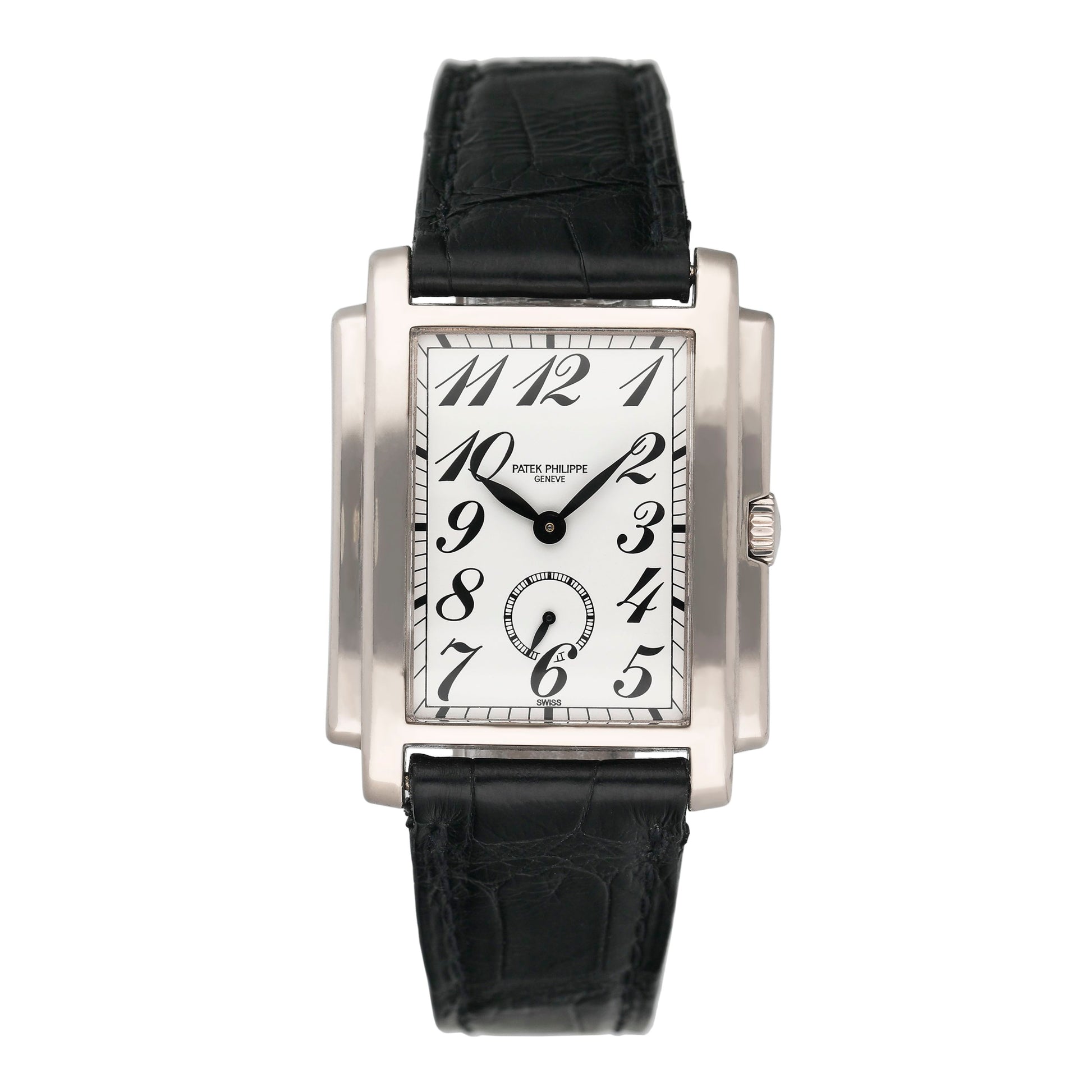 Patek Philippe Gondolo 5024G-010 Mens Watch. 30mm 18K white gold case. White dial with black hands and Arabic numeral hour marker. Small second sub-dial display between 5 & 7 o'clock position. Black leather strap with 18K white gold buckle. Will fit up to 7.5-inch wrist. Sapphire crystal. 18K white gold case back. Calibre 215 mechanical hand winding movement.