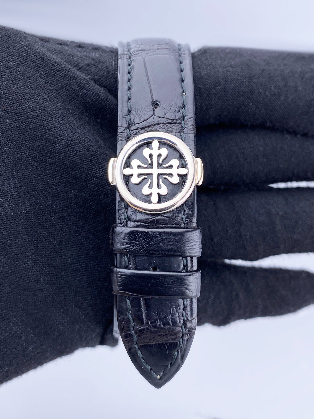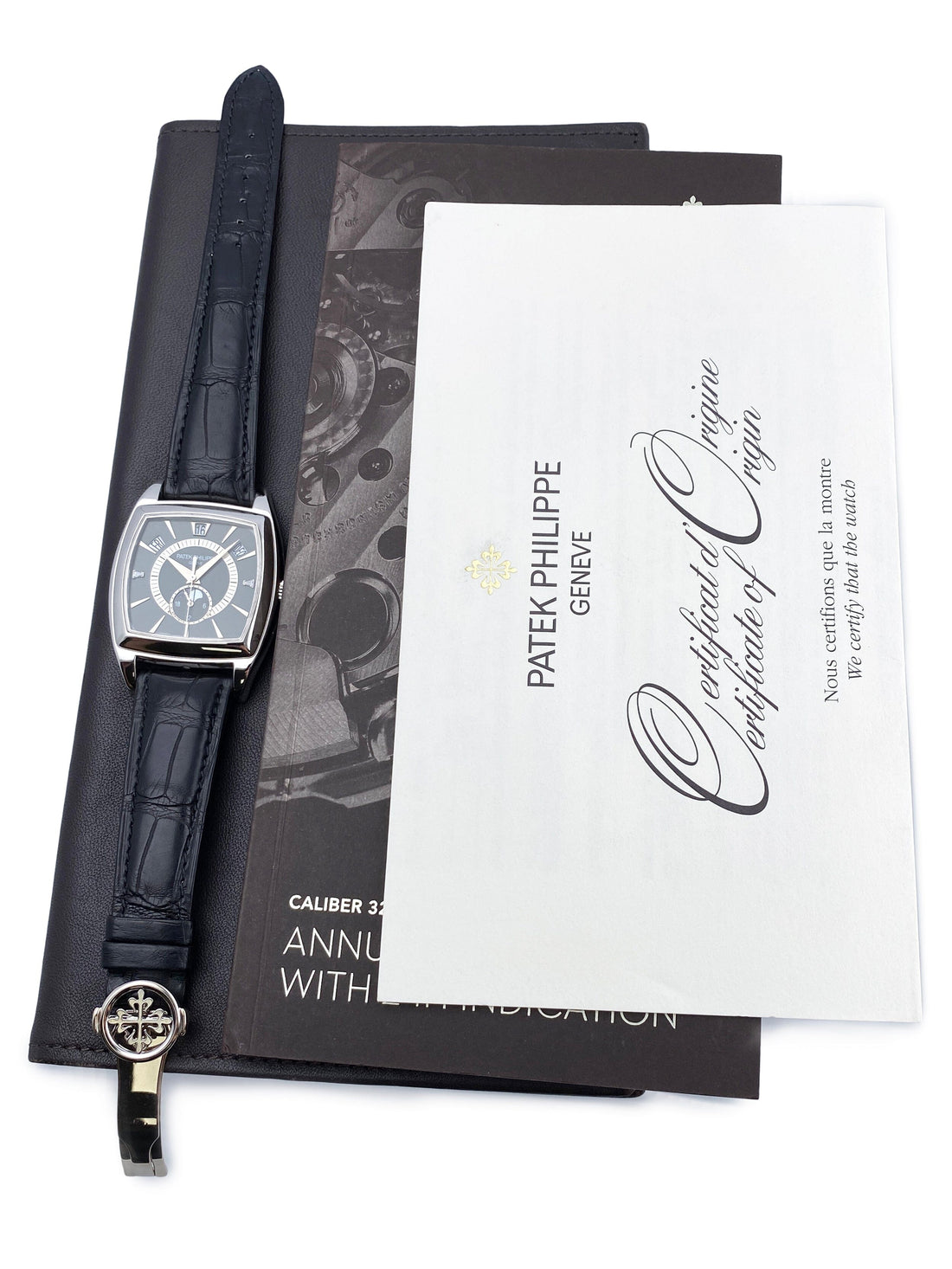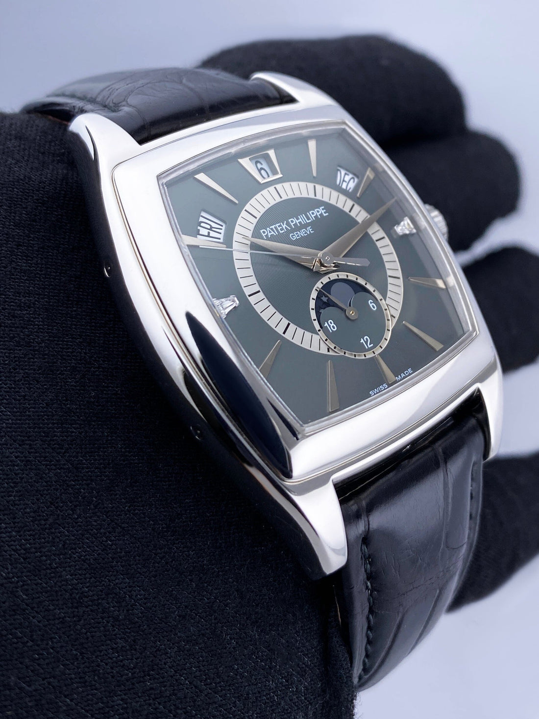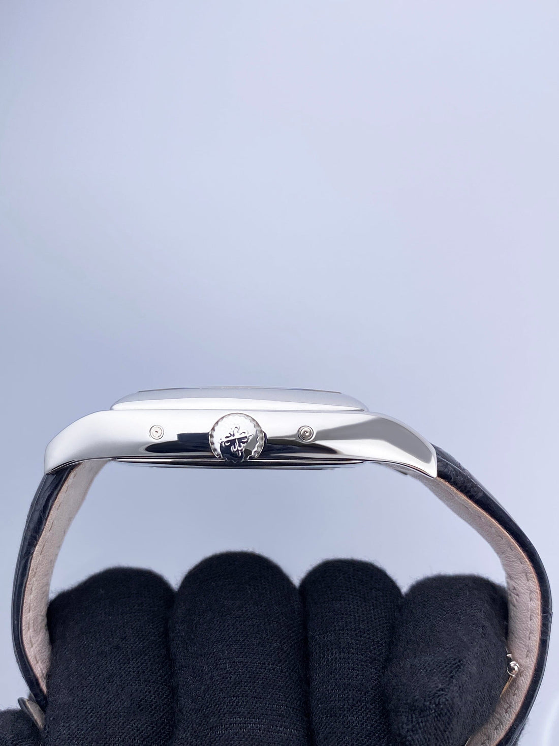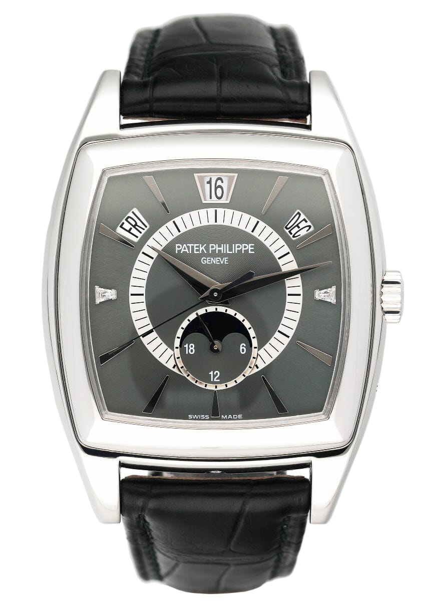 Patek Philippe Complications 5135P-001 Mens Watch. 38mm platinum case. Platinum bezel. Gray dial with silver-tone hands and factory diamond & index hour markers. Annual calendar. The date is displayed at 12 o'clock. The day is displayed between 10 & 11 o'clock. The month is displayed between 1 & 2 o'clock. Moon phase is displayed between 5 & 7 o'clock. Black leather Patek strap with 18K rose gold buckle. Will fit up to a 7.5-inch wrist. Sapphire crystal. Transparent sapphire crystal case back. Automatic self-winding movement. This watch comes with original Box and Papers.