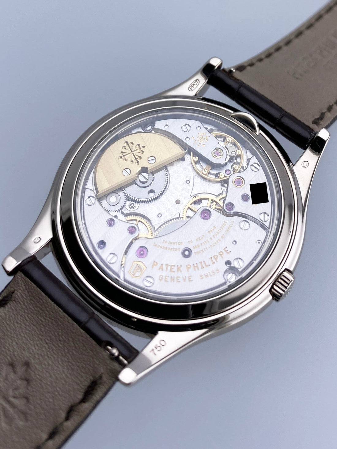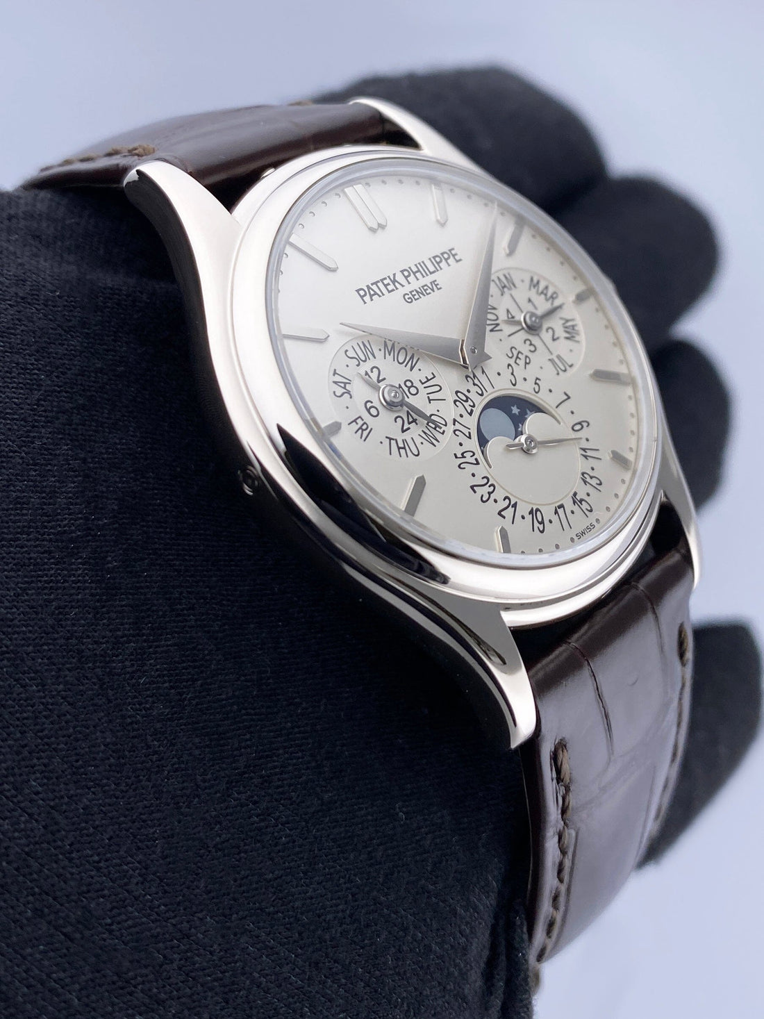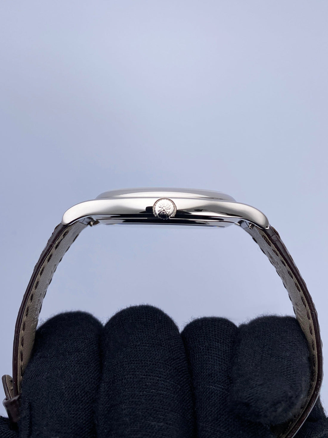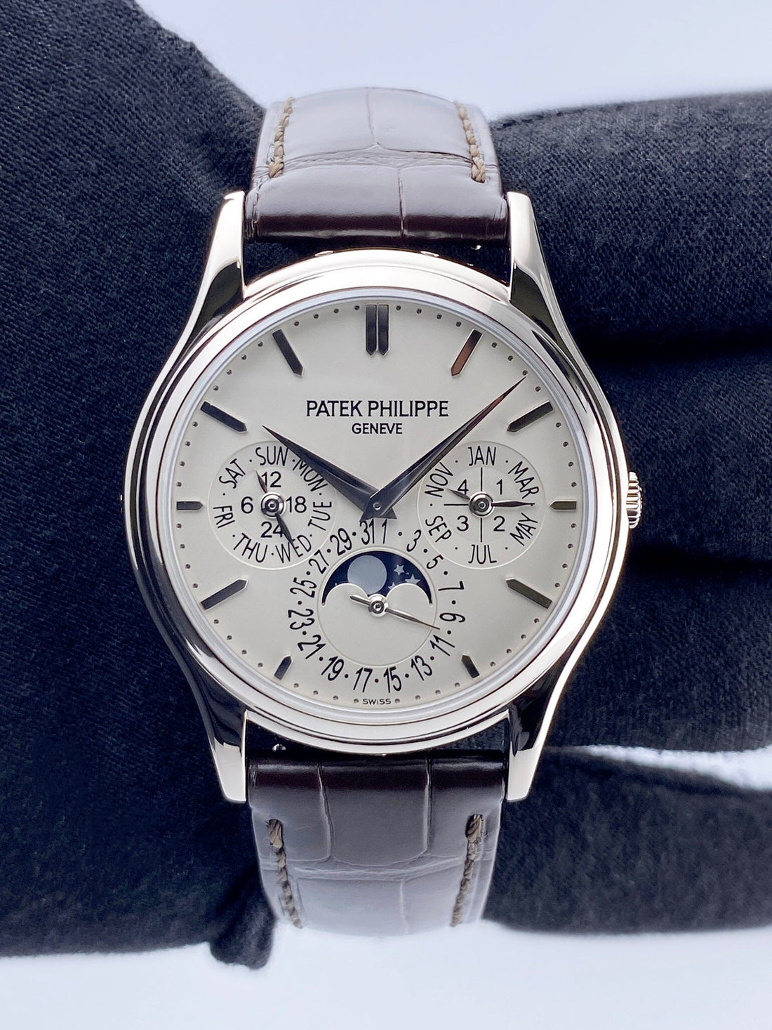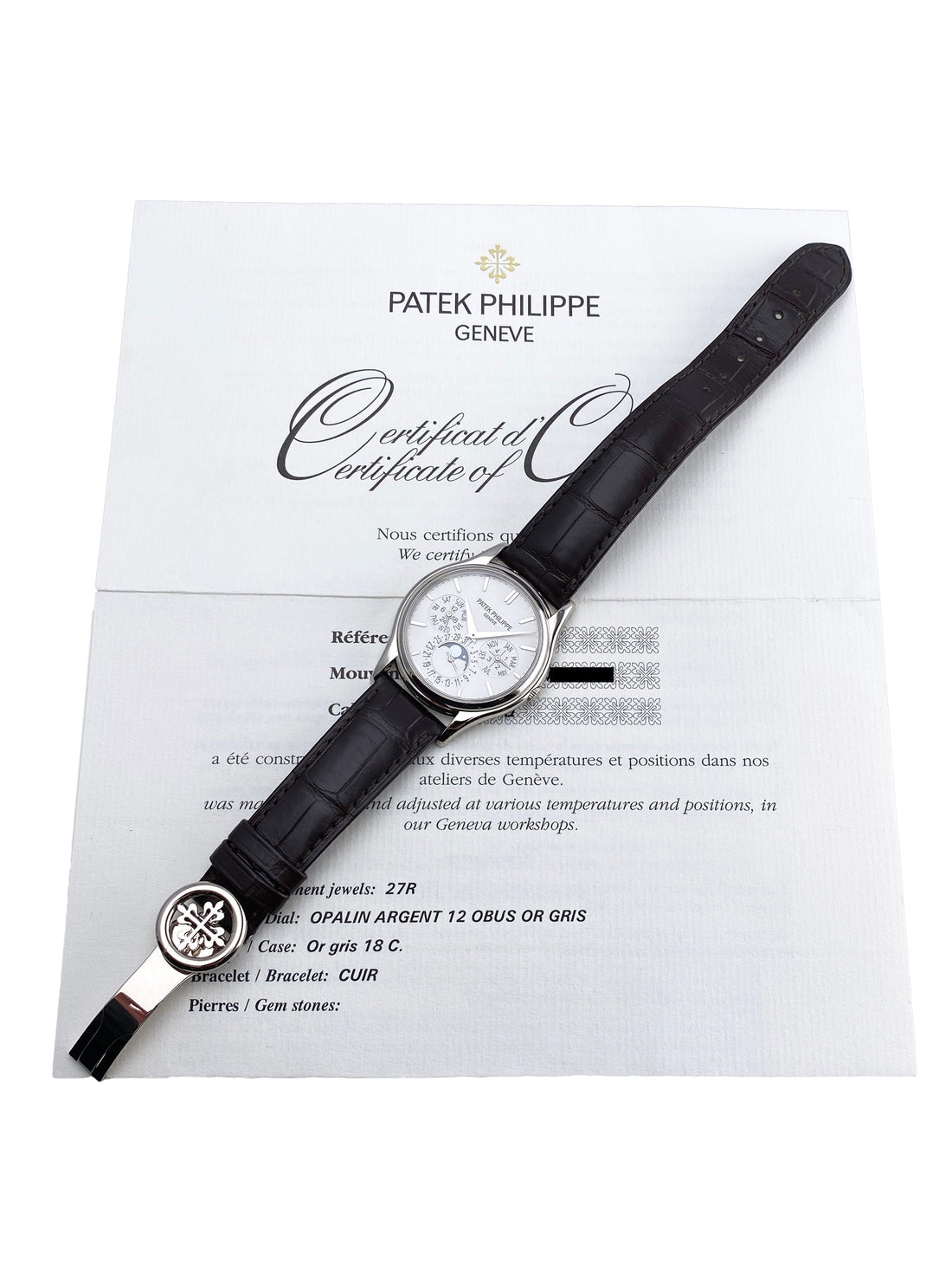 Patek Philippe Grand Complications 5140G-001 Mens Watch. 37mm 18K white gold case. 18K white gold bezel. Opaline dial with silver-tone hands and index hour markers. Annual calendar displays with a moon phase indicator. Brown leather strap with 18K white gold deployment buckle. Will fit up to a 7.5-inch wrist. Sapphire crystal. Transparent sapphire crystal case back. Automatic self-winding movement. This watch comes with original Box and Papers.