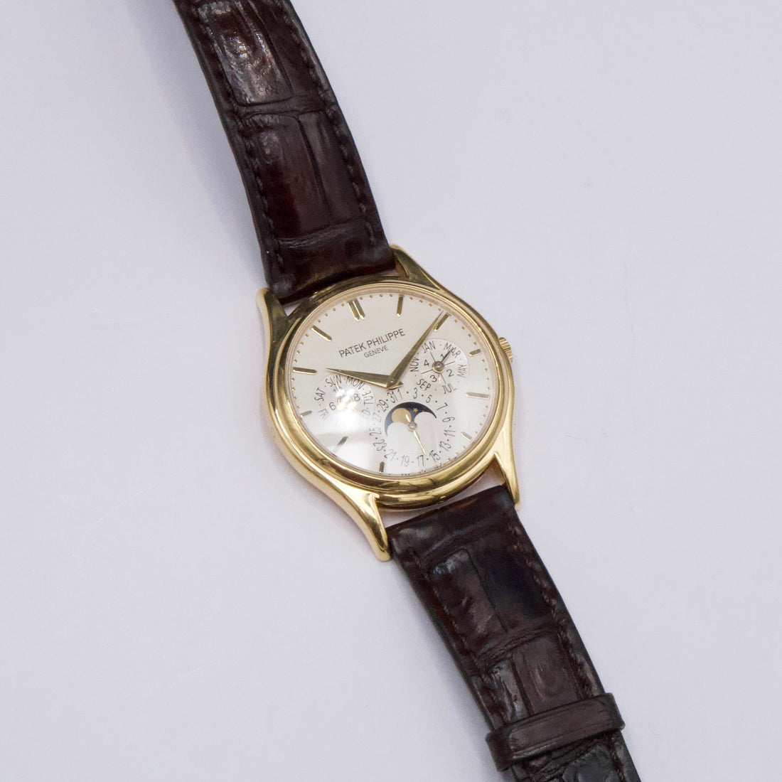 Patek Philippe Grand Complications 5140J-001 Mens Watch. 37.2mm 18K yellow gold case. 18K yellow gold bezel. Silver dial with gold hands and index hour markers. Annual calendar displays with a moon phase indicator. Brown leather strap with 18K yellow gold deployment buckle. Will fit up to a 7-inch wrist. Sapphire crystal. Transparent sapphire crystal case back. Automatic self-winding movement.