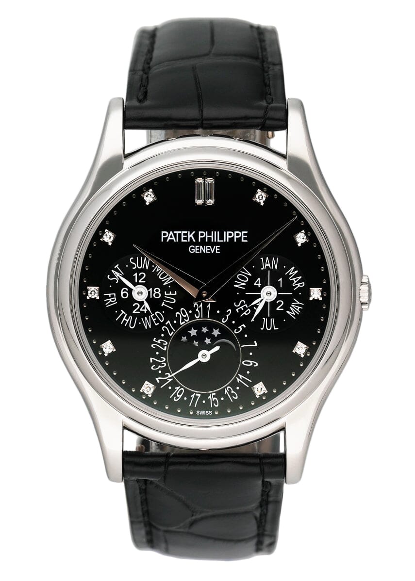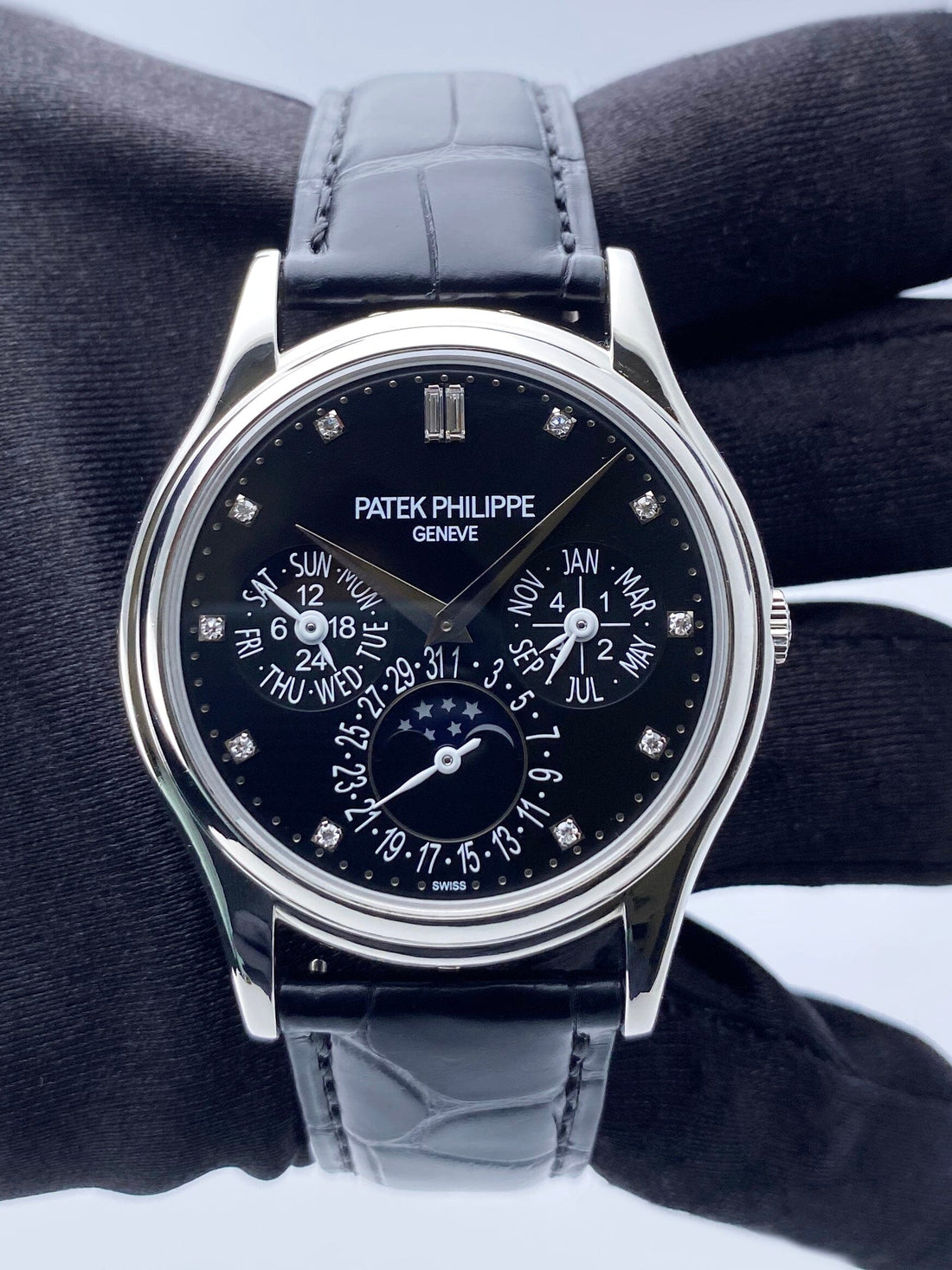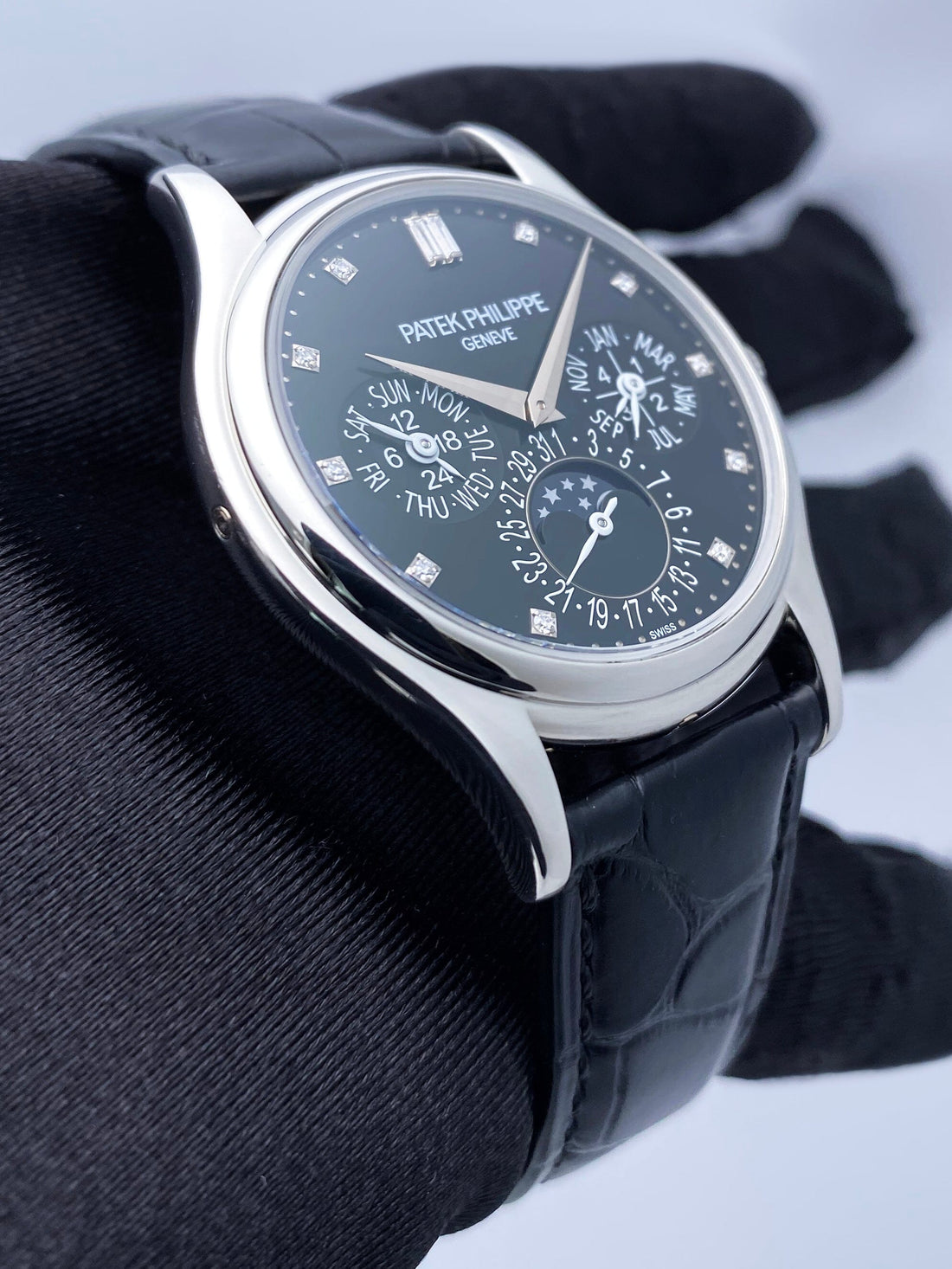Patek Philippe Grand Complications 5140P-013 Mens Watch. 37mm platinum case. Platinum fixed bezel. Black dial with Silver-tone hands and factory diamond hour marker. Perpetual calendar displays with a moon phase indicator. Black leather strap with platinum deployment buckle. Will fit up to 7.5-Inch wrist. Sapphire crystal. Transparent sapphire crystal case back. Automatic self-winding movement. This watch comes with original Box and Papers.