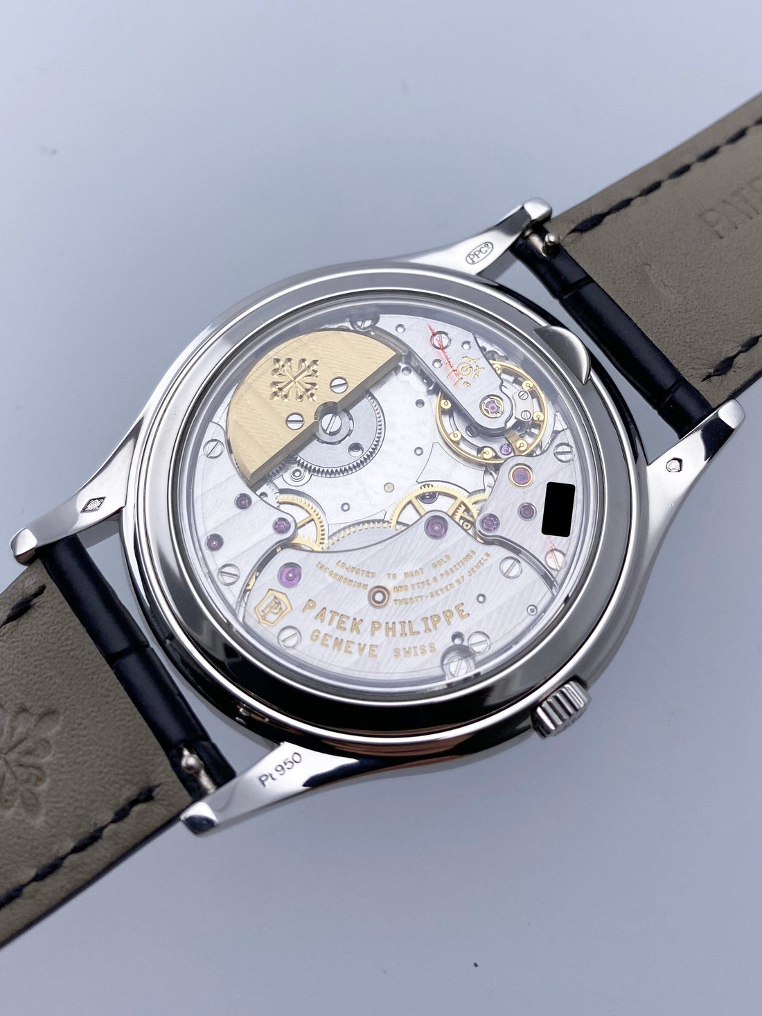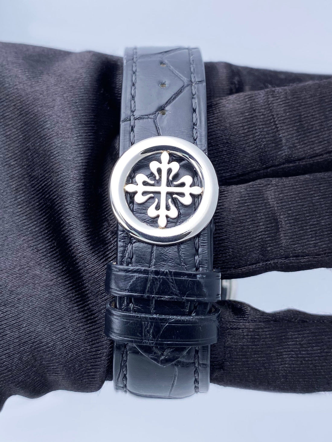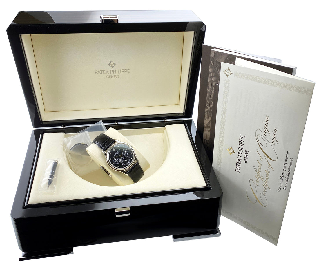Patek Philippe Grand Complications 5140P-013 Mens Watch. 37mm platinum case. Platinum fixed bezel. Black dial with Silver-tone hands and factory diamond hour marker. Perpetual calendar displays with a moon phase indicator. Black leather strap with platinum deployment buckle. Will fit up to 7.5-Inch wrist. Sapphire crystal. Transparent sapphire crystal case back. Automatic self-winding movement. This watch comes with original Box and Papers.