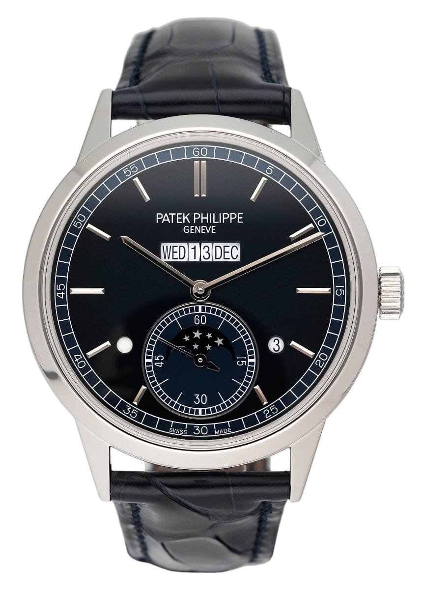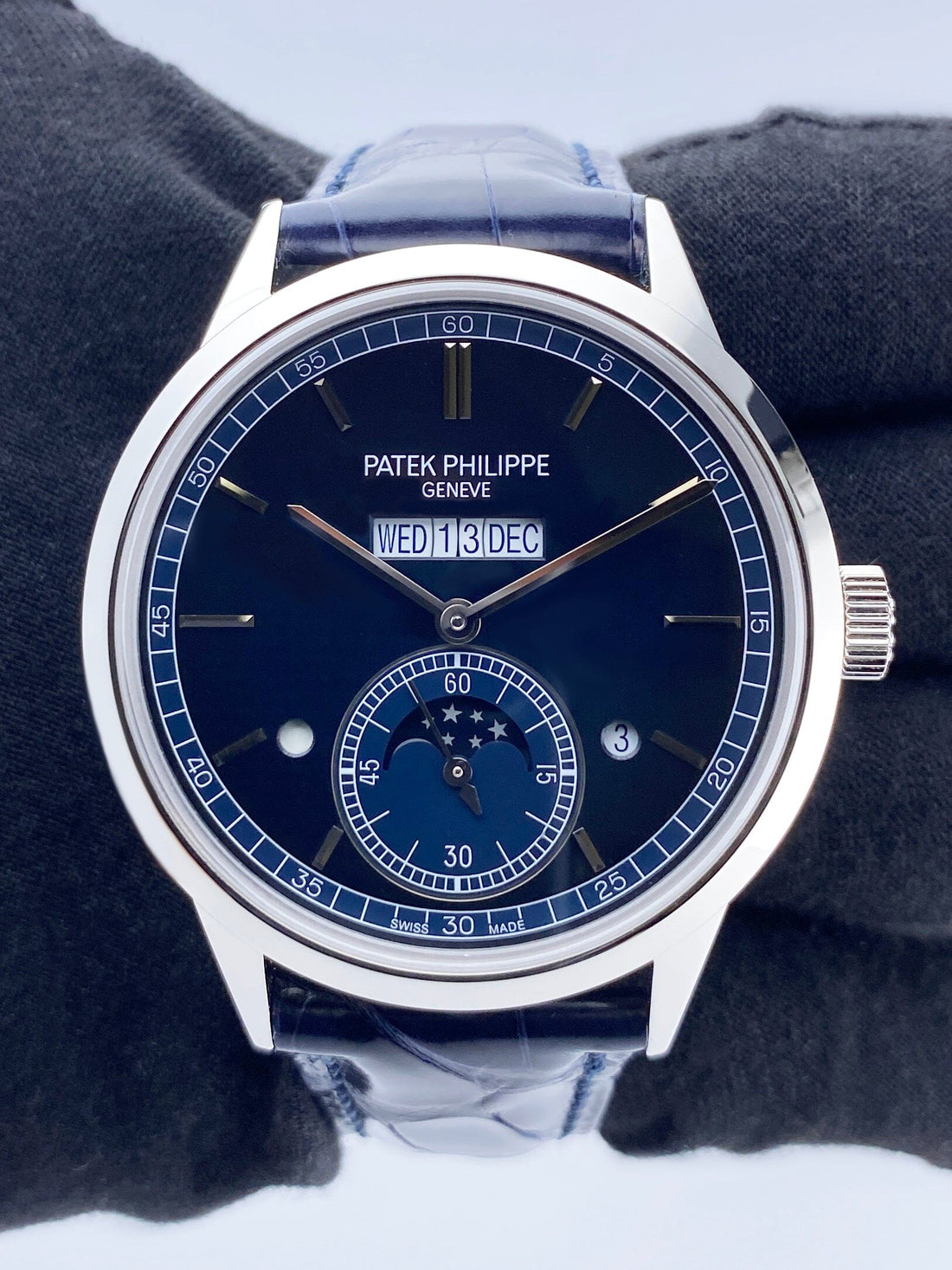 Patek Philippe Complications 5236P-001 Mens Watch. 41.3mm platinum case. Platinum bezel. Blue dial with silver-tone hands and index hour markers. Perpetual calendar displays with a moon phase indicator. Blue leather strap with platinum deployment buckle. Will fit up to a 7.5-inch wrist. Sapphire crystal. Transparent sapphire crystal case back. Automatic self-winding movement. This watch comes with original Box and Papers.