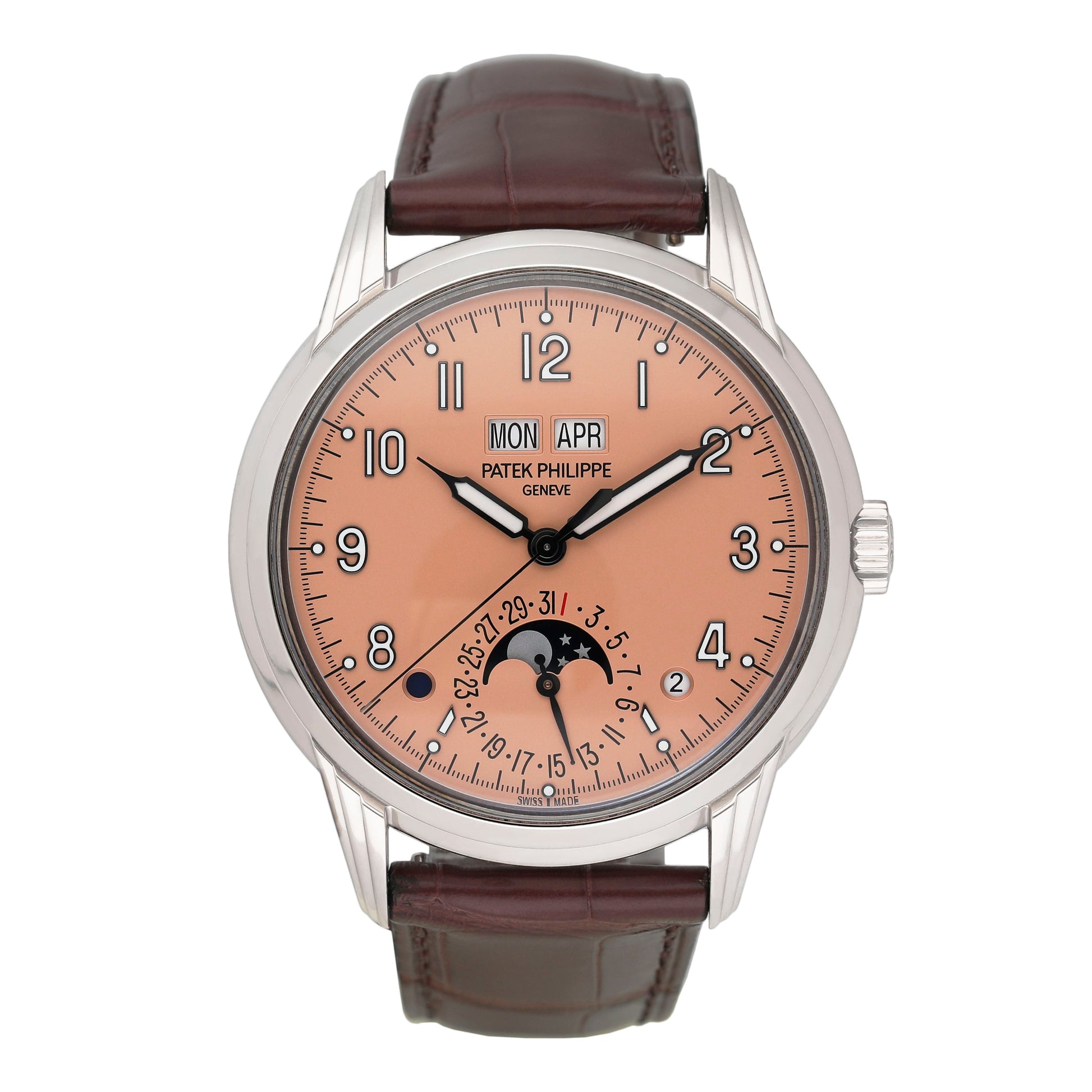 Patek Philippe Grand Complications 5320G-011 Mens Watch. 40mm 18K white gold case. 18K white gold fixed bezel. Rose-gilt opaline dial with luminescent hands and Arabic numeral and index hour marker. Date/moon-phase display at 6 o'clock position. Minute maker on the outer dial. Day and Month display at 12 o'clock position. Brown leather strap with deployment clasp. Will fit up to 7.5-Inch wrist. Sapphire crystal. Transparent sapphire crystal case back. Automatic self-winding chronometer movement. This watch comes with original Box and Papers.