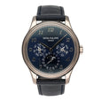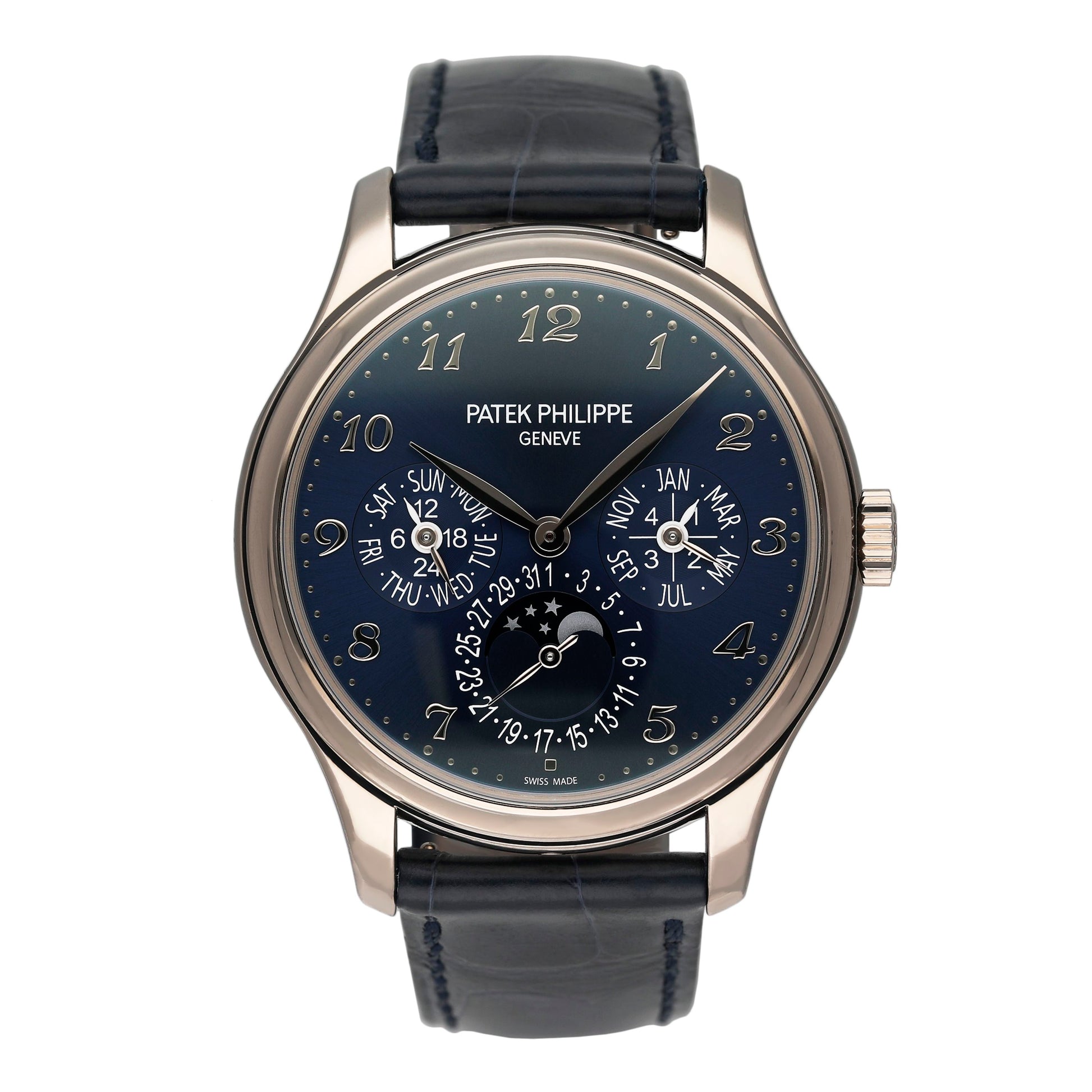 Patek Philippe Grand Complications 5327G-001 Mens Watch. 39mm 18K white gold case. 18K white gold bezel. Blue dial with silver-tone hands and Arabic numeral hour markers. Perpetual calendar displays with a moon phase indicator. Blue leather strap with 18K white gold deployment clasp. Will fit up to a 7.5-inch wrist. Sapphire crystal. Transparent sapphire crystal case back. Automatic self-winding movement. This watch comes with original Box and Papers.