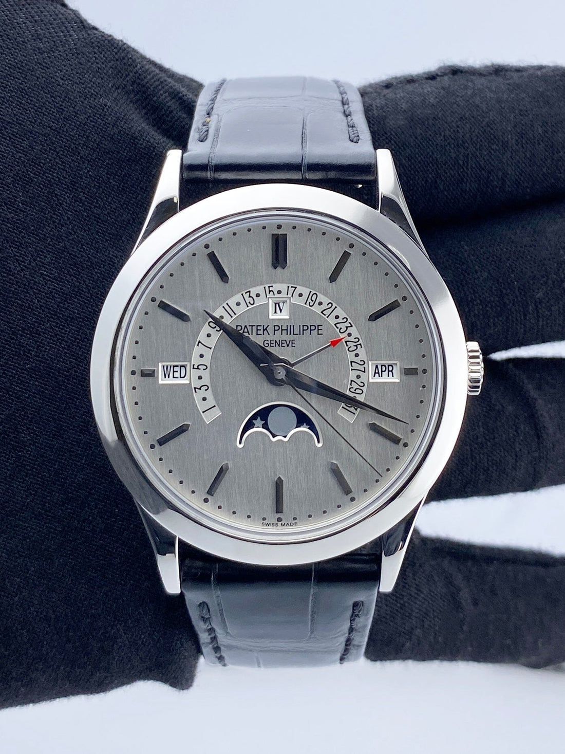 Patek Philippe Grand Complications 5496P-001 Mens Watch. 39.5mm platinum case. Platinum stationary bezel. Silver dial with platinum hands and index hour markers. Minute markers on the outer dial. Date display on the inner dial position. Day display at 9 o'clock position. Month display at 3 o'clock position. Brown leather strap with deployment buckle. Will fit up to a 7.5-inch wrist. Sapphire crystal. Transparent sapphire crystal case back. Calibre 324 S QR Automatic self-winding movement. This watch comes with original Box and Papers.