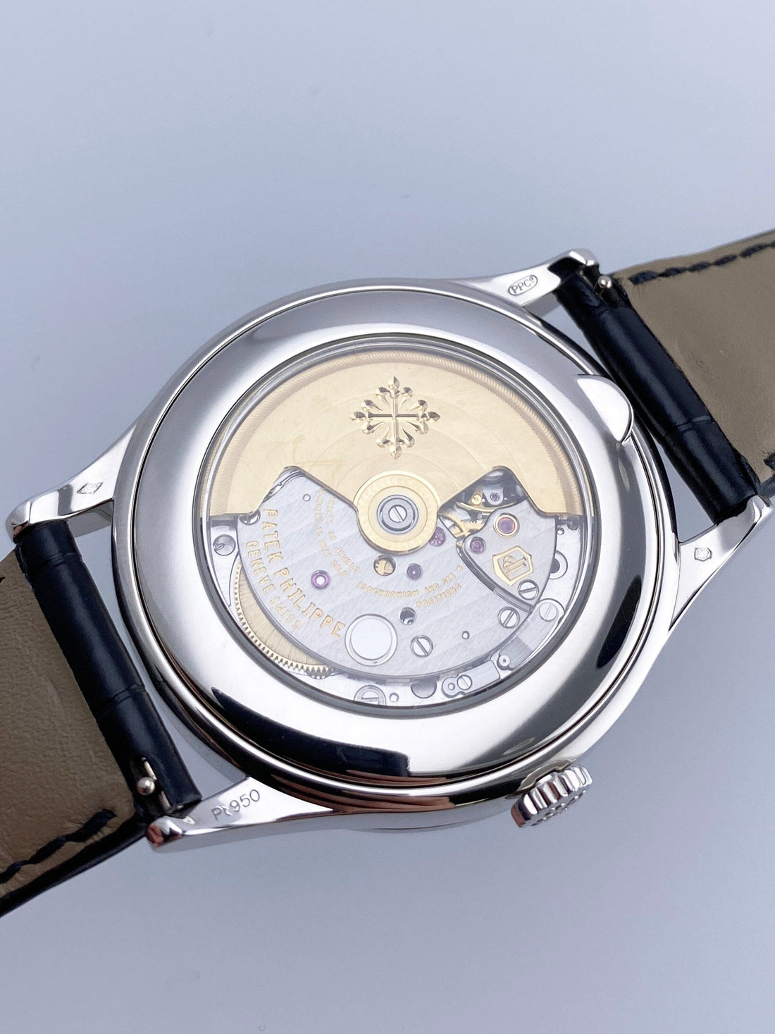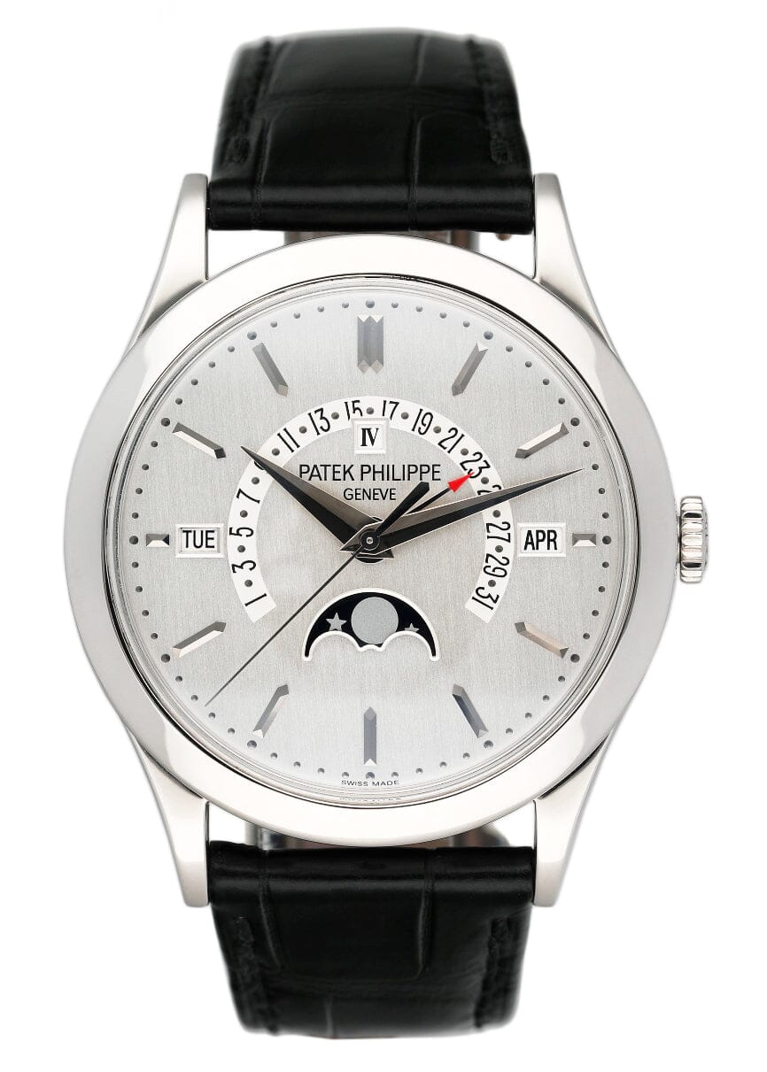 Patek Philippe Grand Complications 5496P-001 Mens Watch. 39.5mm platinum case. Platinum stationary bezel. Silver dial with platinum hands and index hour markers. Minute markers on the outer dial. Date display on the inner dial position. Day display at 9 o'clock position. Month display at 3 o'clock position. Brown leather strap with deployment buckle. Will fit up to a 7.5-inch wrist. Sapphire crystal. Transparent sapphire crystal case back. Calibre 324 S QR Automatic self-winding movement. This watch comes with original Box and Papers.