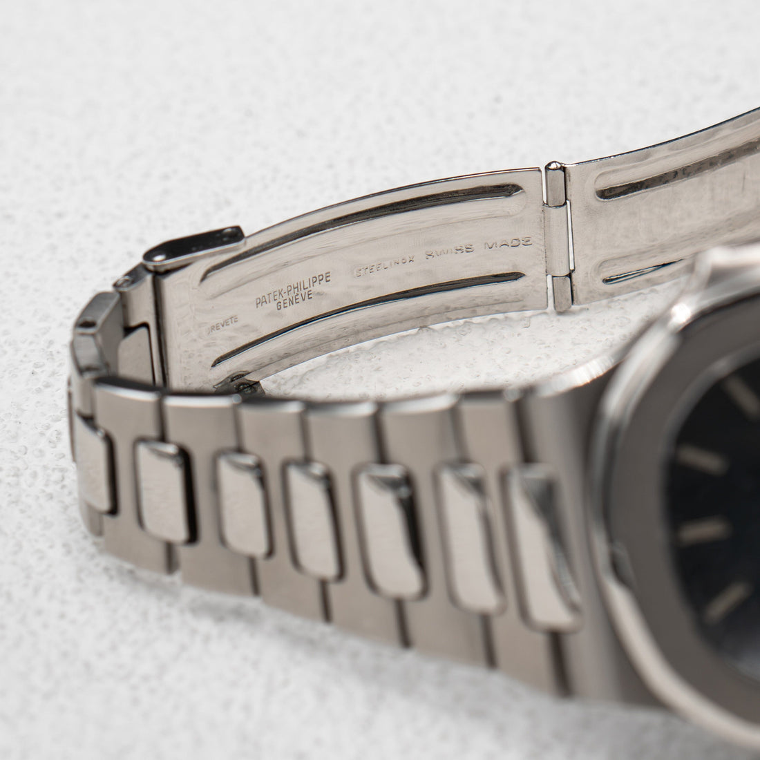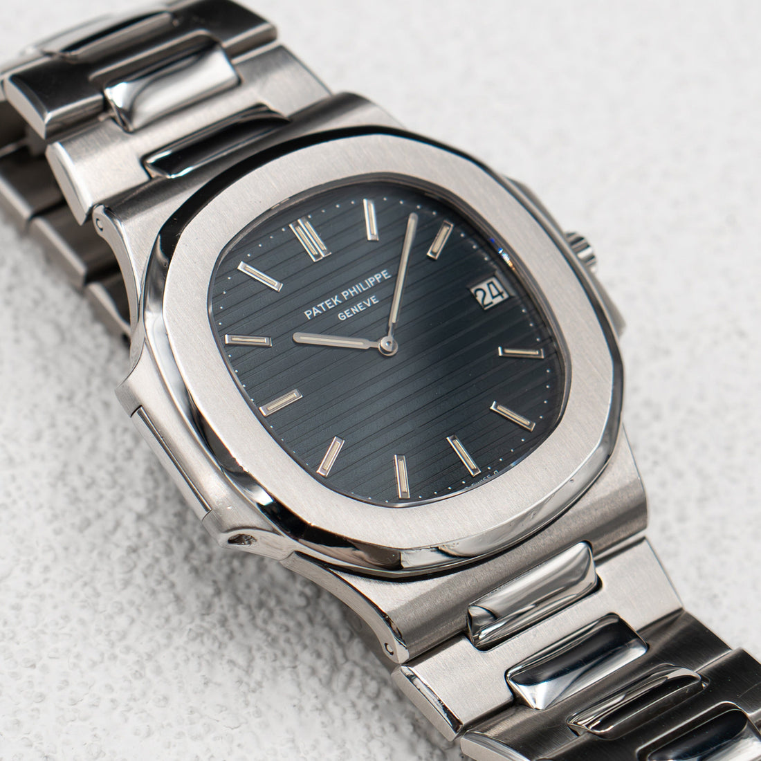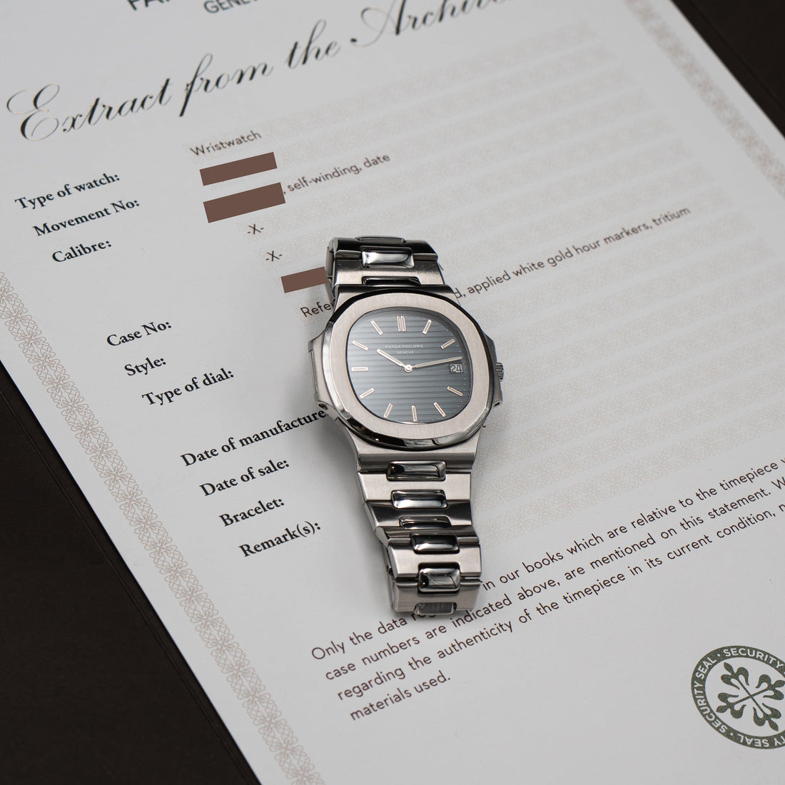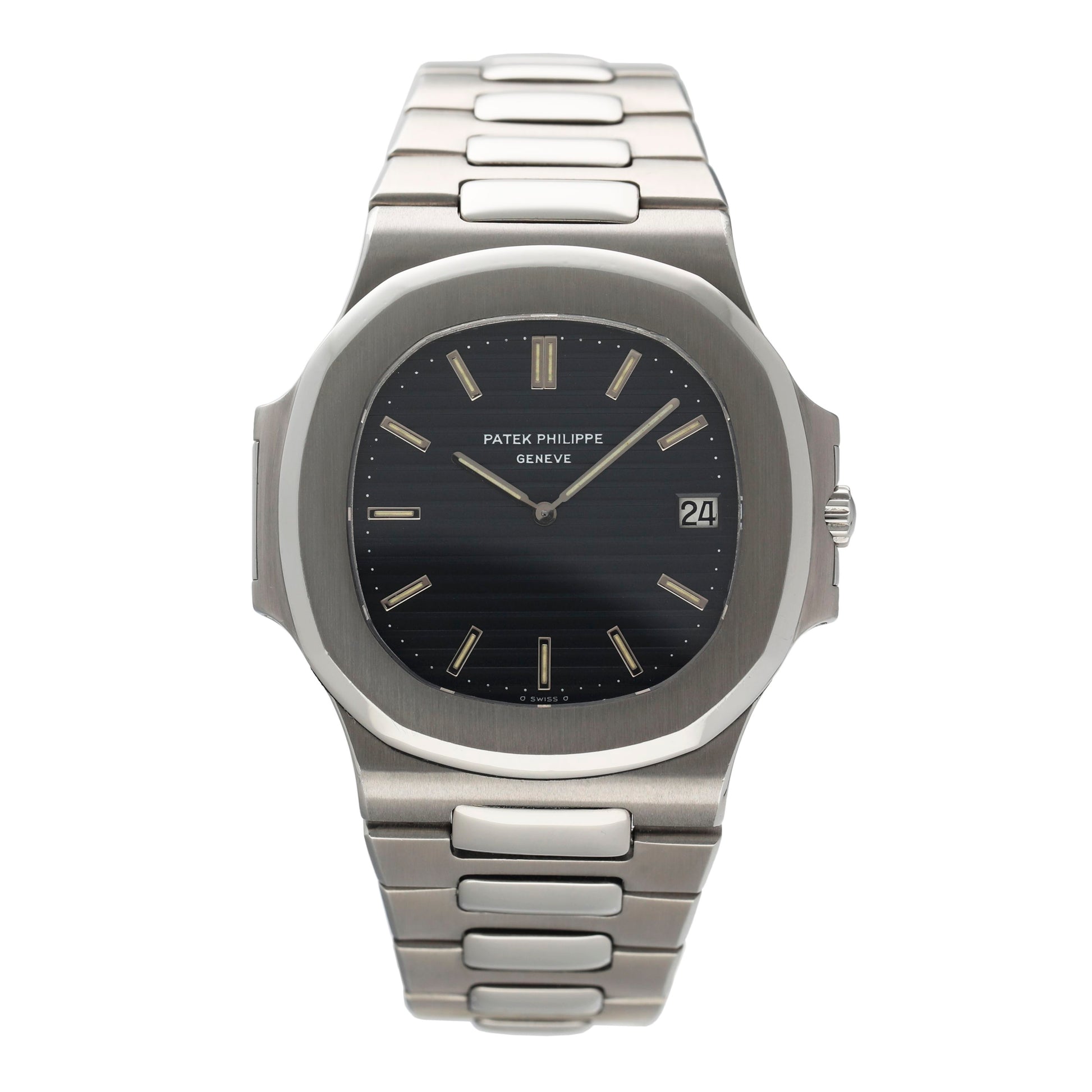 Patek Philippe Nautilus 3700/1A Mens Watch. 42mm stainless steel case. Stainless steel bezel. Blue dial with silver-tone hands and index hour marker. Date display at 3 o'clock position. Stainless steel bracelet with stainless steel fold over clasp with safety. Will fit up to 7-Inch wrist. Sapphire crystal. Stainless steel case back. Automatic self winding movement. This watch comes with Archives.