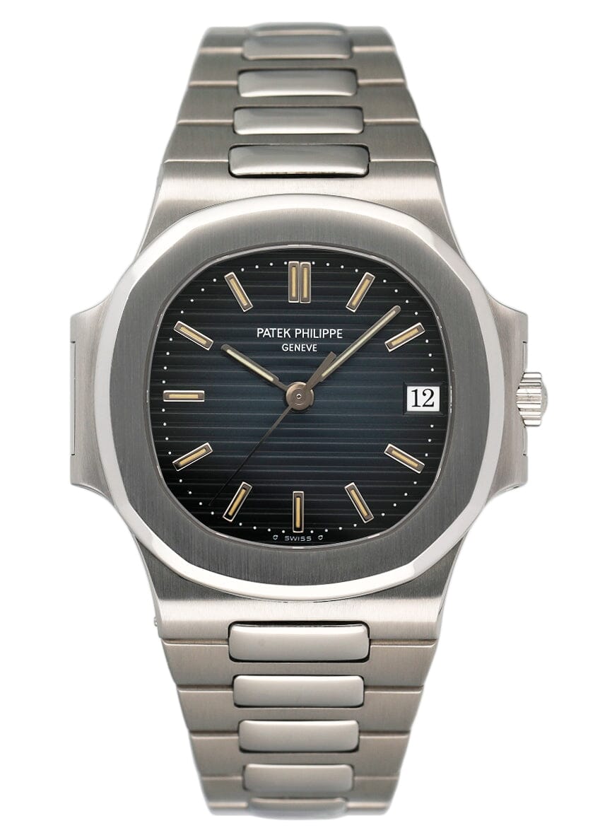 Patek Philippe Nautilus 3800/1A-001 Mens Watch. 37mm stainless steel case with stainless steel smooth bezel. Blue dial with steel hands and index hour marker. The date is displayed at 3 o'clock position. Stainless steel bracelet with fold over clasp with safety. Will fit up to 6.5-Inch wrist. Automatic self-winding movement.