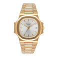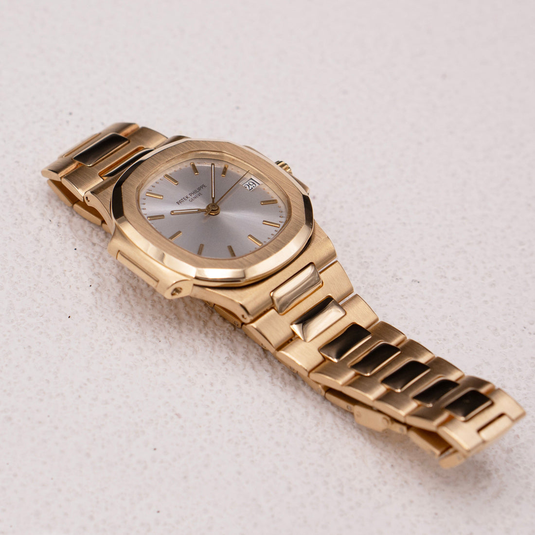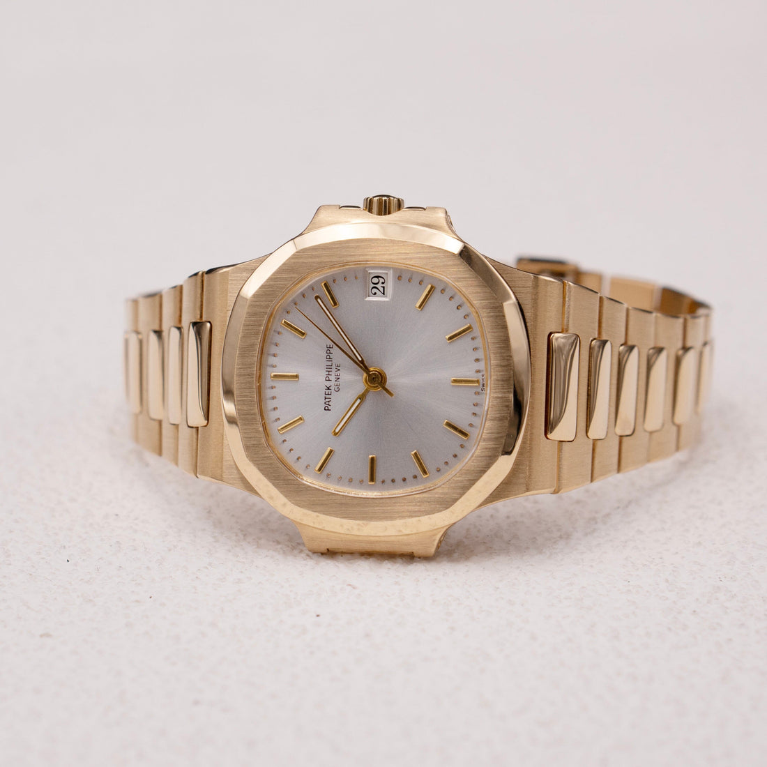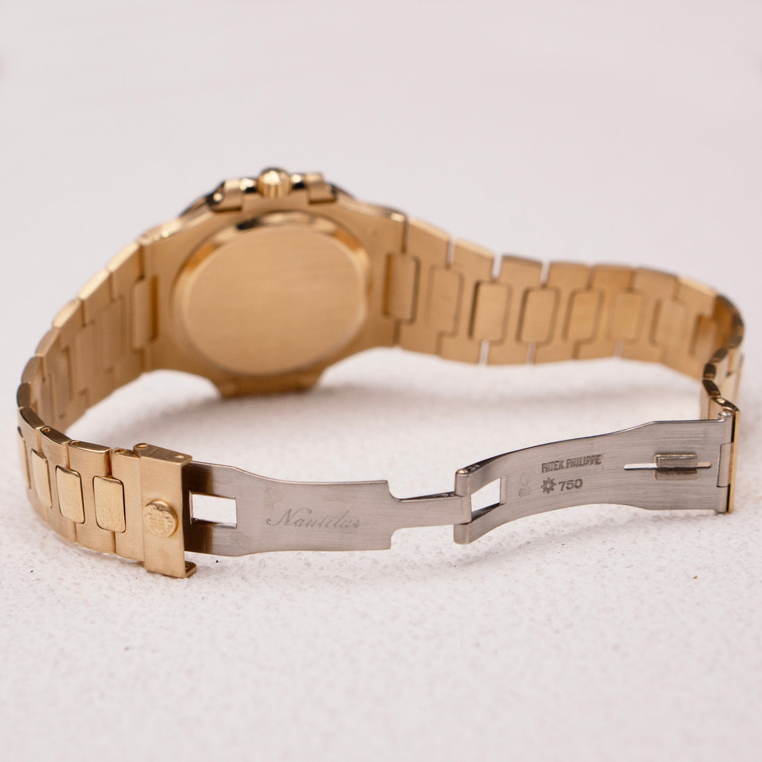 Patek Philippe Nautilus 3800/1J Mens Watch. 37mm 18K yellow gold case. 18K yellow gold bezel. Silver dial wit gold hands and golden index hour marker. Date display at 3 o'clock position. 18K yellow gold bracelet with 18K white gold hidden fold over clasp with safety. Will fit up to 7-Inch wrist. Sapphire crystal and 18K yellow gold case back. Automatic self winding movement.