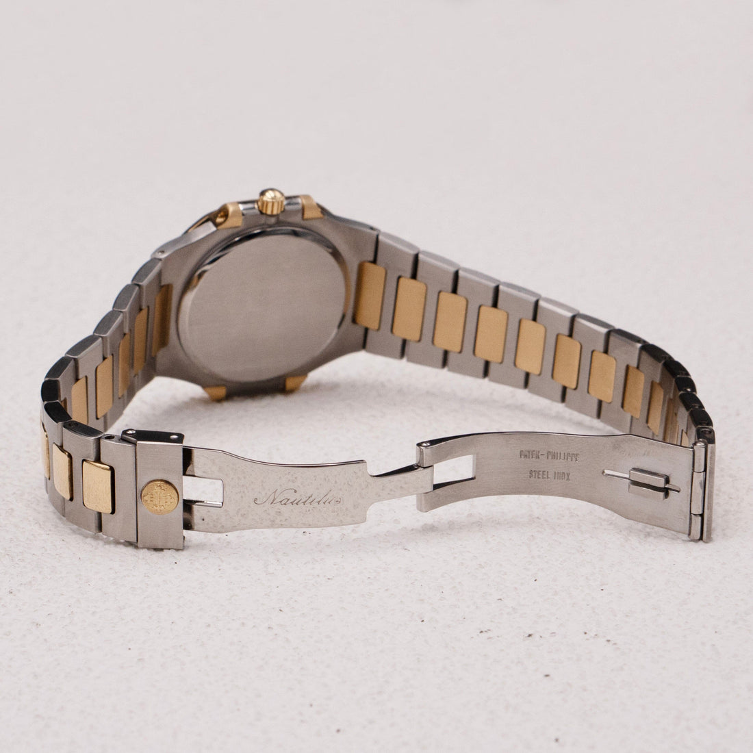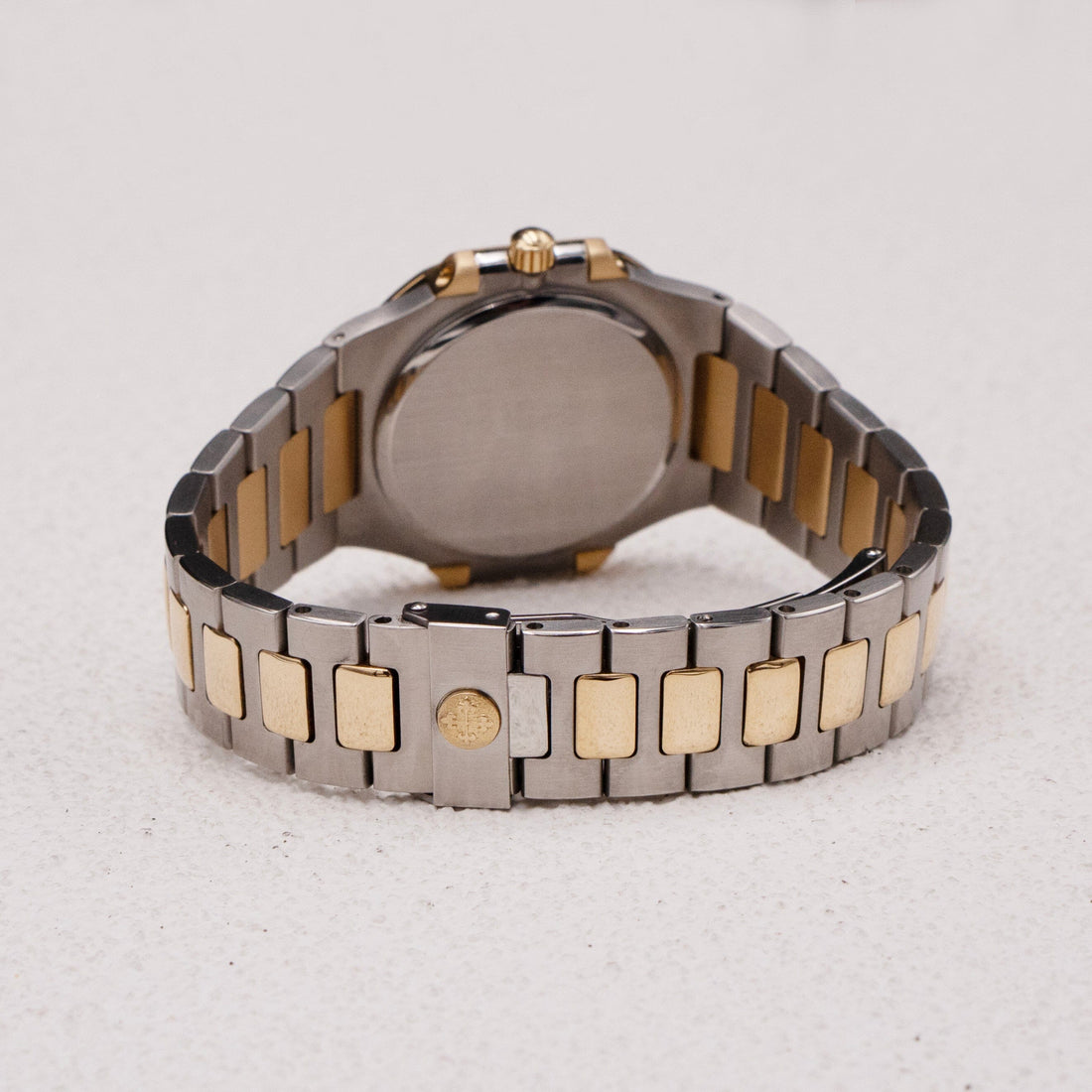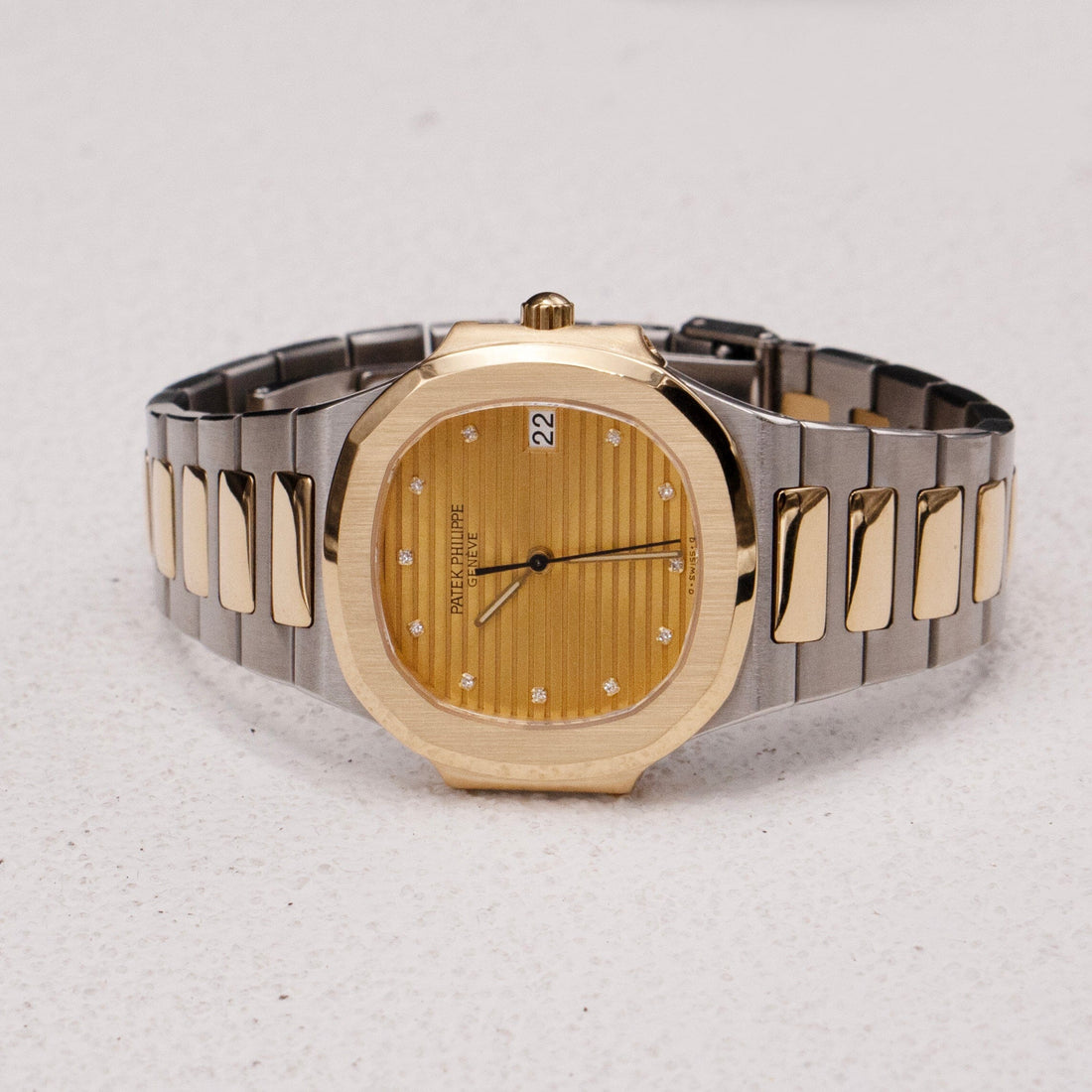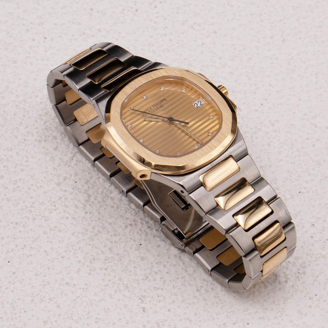 Patek Philippe Nautilus 3900/1 Ladies Watch. 33mm stainless steel case. 18K yellow gold bezel. Champagne dial with gold hands and factory diamond hour marker. The date is displayed at 3 o'clock position. 18K yellow gold bracelet with fold over clasp with safety. Will fit up to 6.5-Inch wrist. Quartz : battery powered movement.