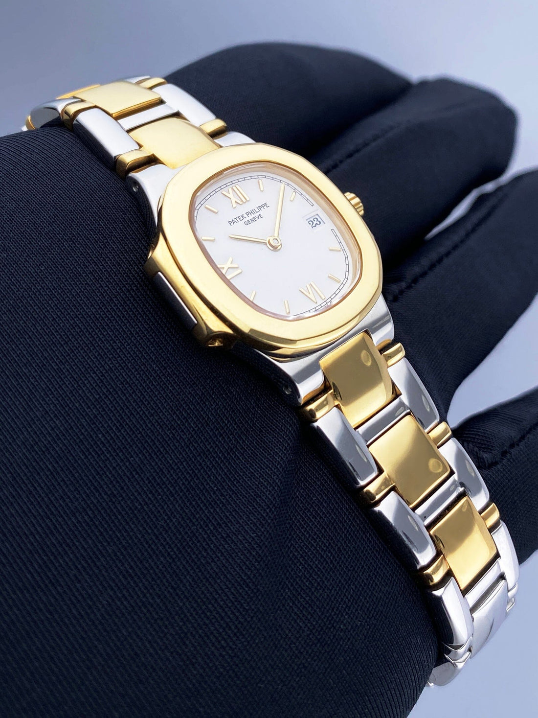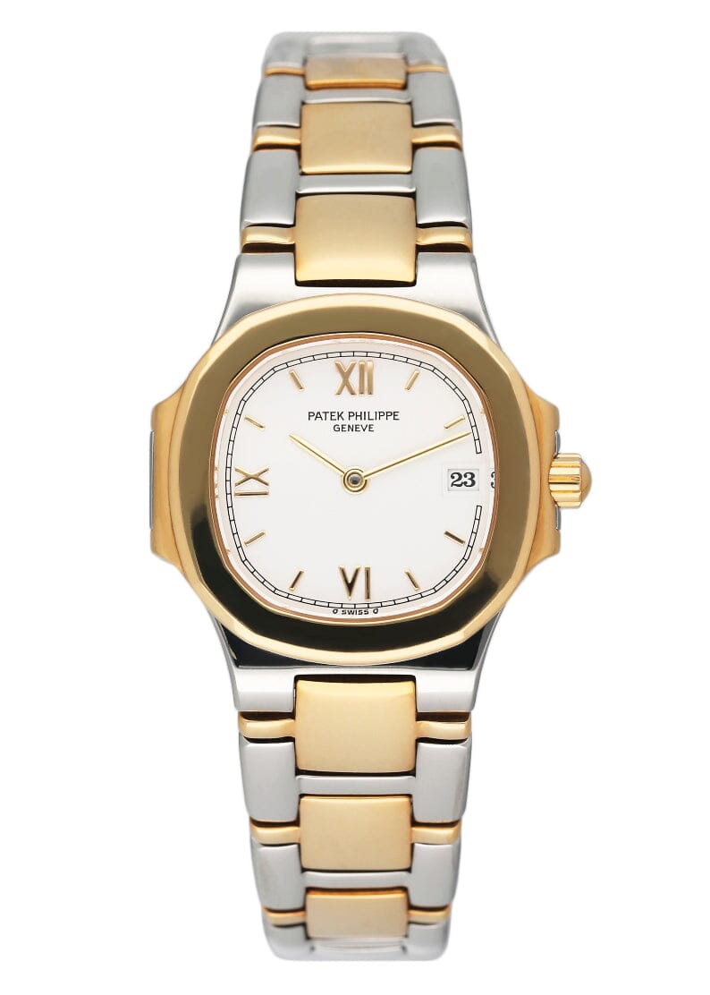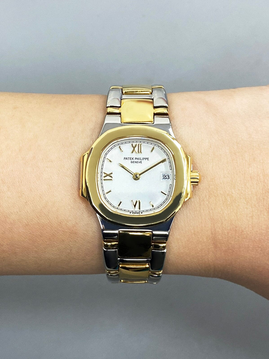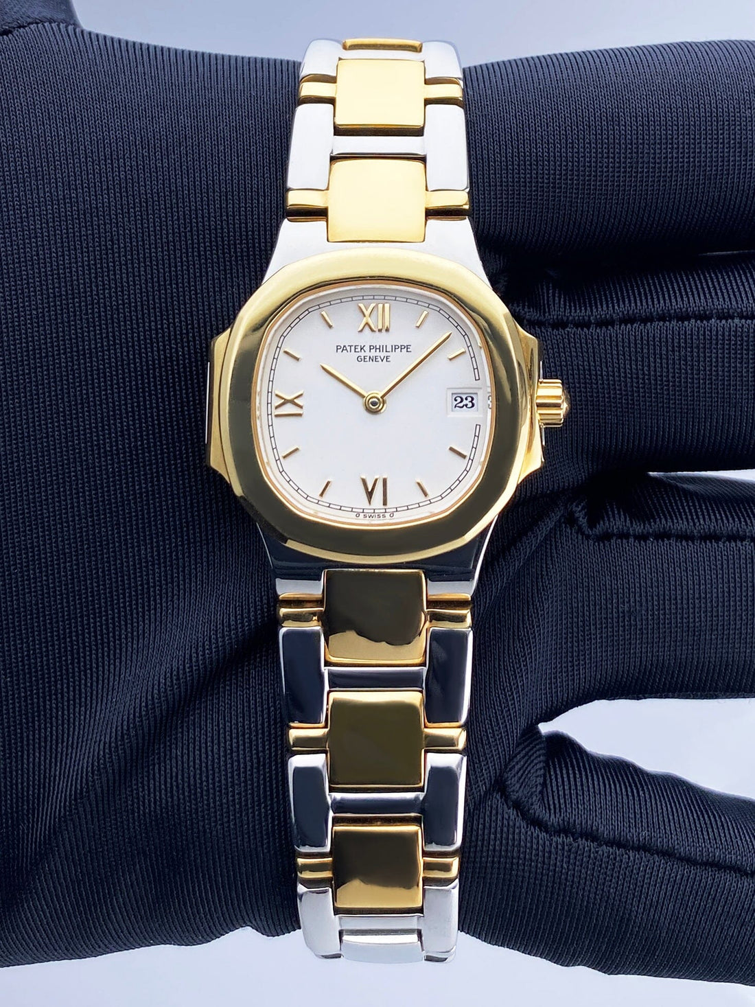 Patek Philippe Nautilus 4700/51 Ladies Watch. 27mm stainless steel case. 18K yellow gold smooth bezel. White dial with gold hands and index hour marker. Date display at 3 o'clock position. 18K yellow gold & stainless steel bracelet with fold over clasp with safety. Will fit up to 6.5-Inch wrist. Sapphire Crystal. 18K yellow gold case back. Quartz: Battery powered movement.