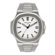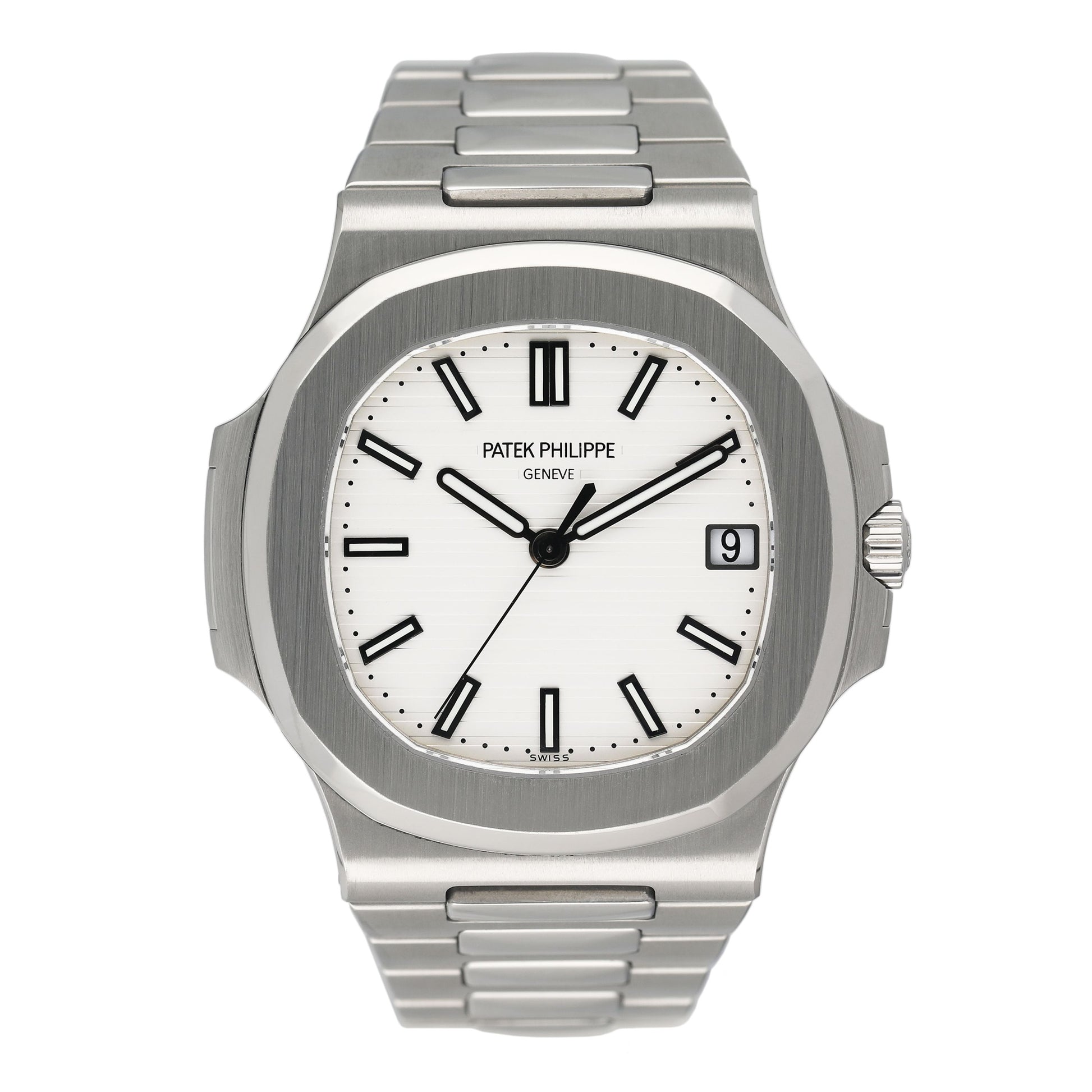Patek Philippe Nautilus 5711/1A-011 Mens Watch. 40mm stainless steel case. Stainless steel smooth bezel. White dial with black luminous hands and index hour markers. Minute markers on the outer dial. Date display at the 3 o'clock position. Stainless steel bracelet with butterfly fold clasp with Safety. Will fit up to a 6.75-inch wrist. Sapphire crystal. Transparent sapphire crystal case back. Automatic self-winding movement. This watch comes with original Box and Papers.