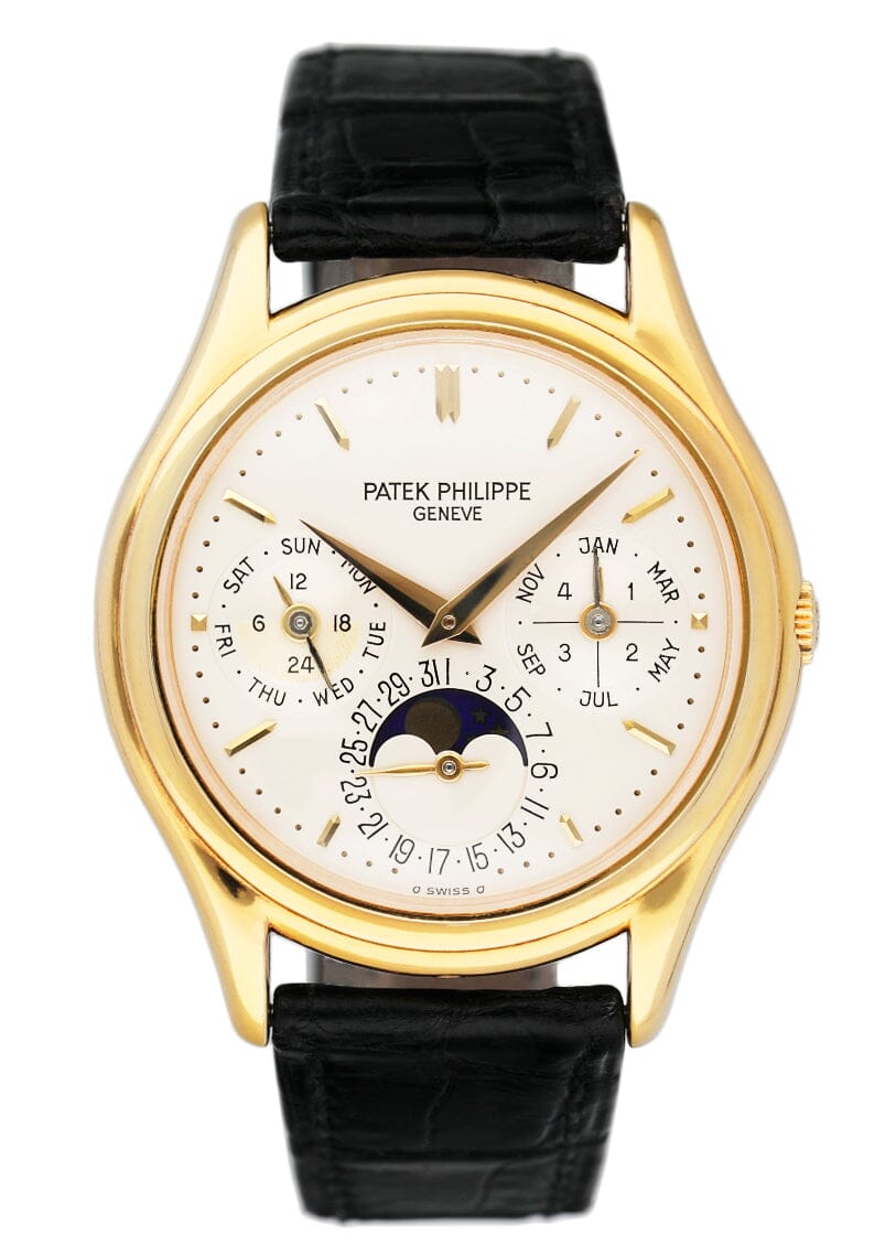 Patek Philippe Perpetual Calendar 3940J Mens Watch. 36mm 18K yellow gold case. 18K yellow gold bezel. Silver dial with gold hands and index hour markers. Perpetual calendar displays with a moon phase indicator. Black leather strap with 18K yellow gold buckle. Will fit up to a 7.5-inch wrist. Sapphire crystal. Transparent sapphire crystal case back. Automatic self-winding movement. This watch comes with Archives.