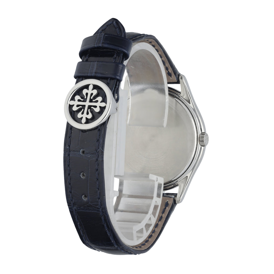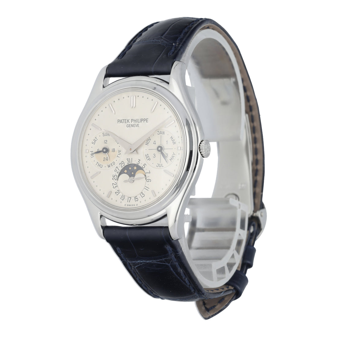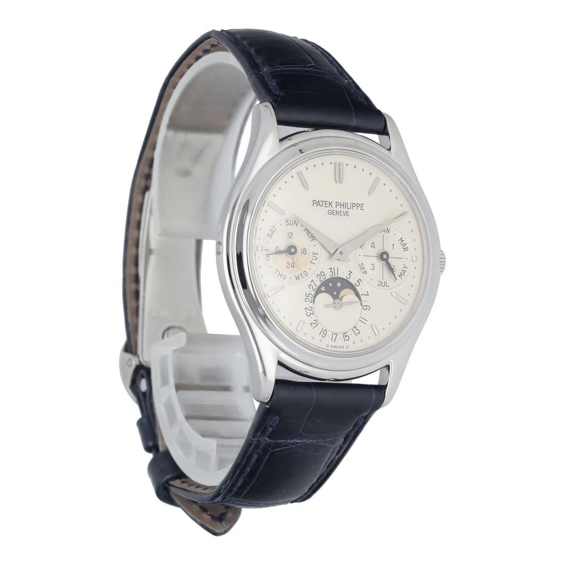 Patek Philippe Perpetual Calendar 3940P Men Watch. 36mm 18k Platinum case. Silver dial with gold hands and index hour markers. Alligator Leather Strap with Platinum Deployant buckle. Will fit up to a 7.25-inch wrist. Sapphire Crystal, platinum case back. Patek archive papers and service papers included.