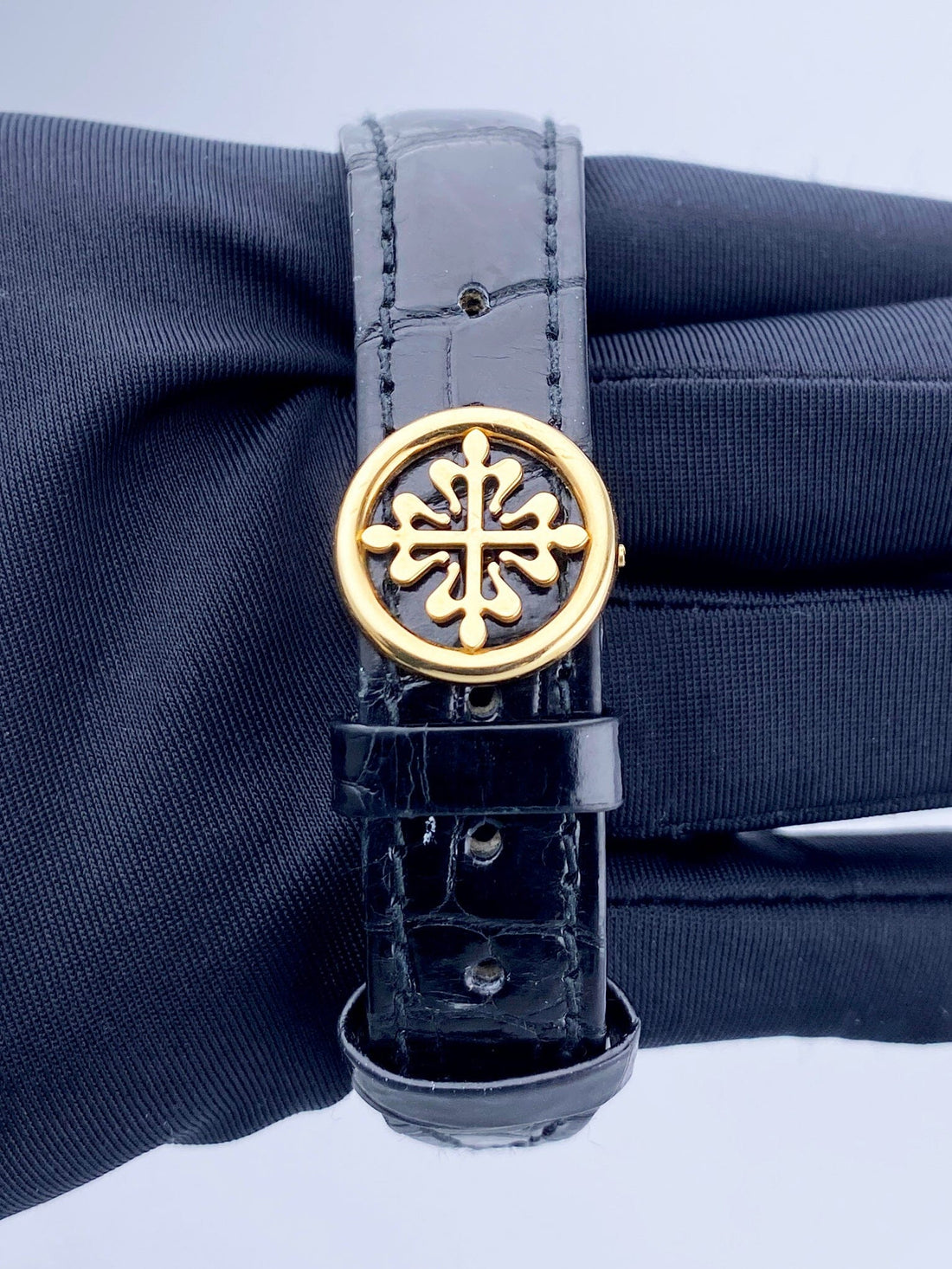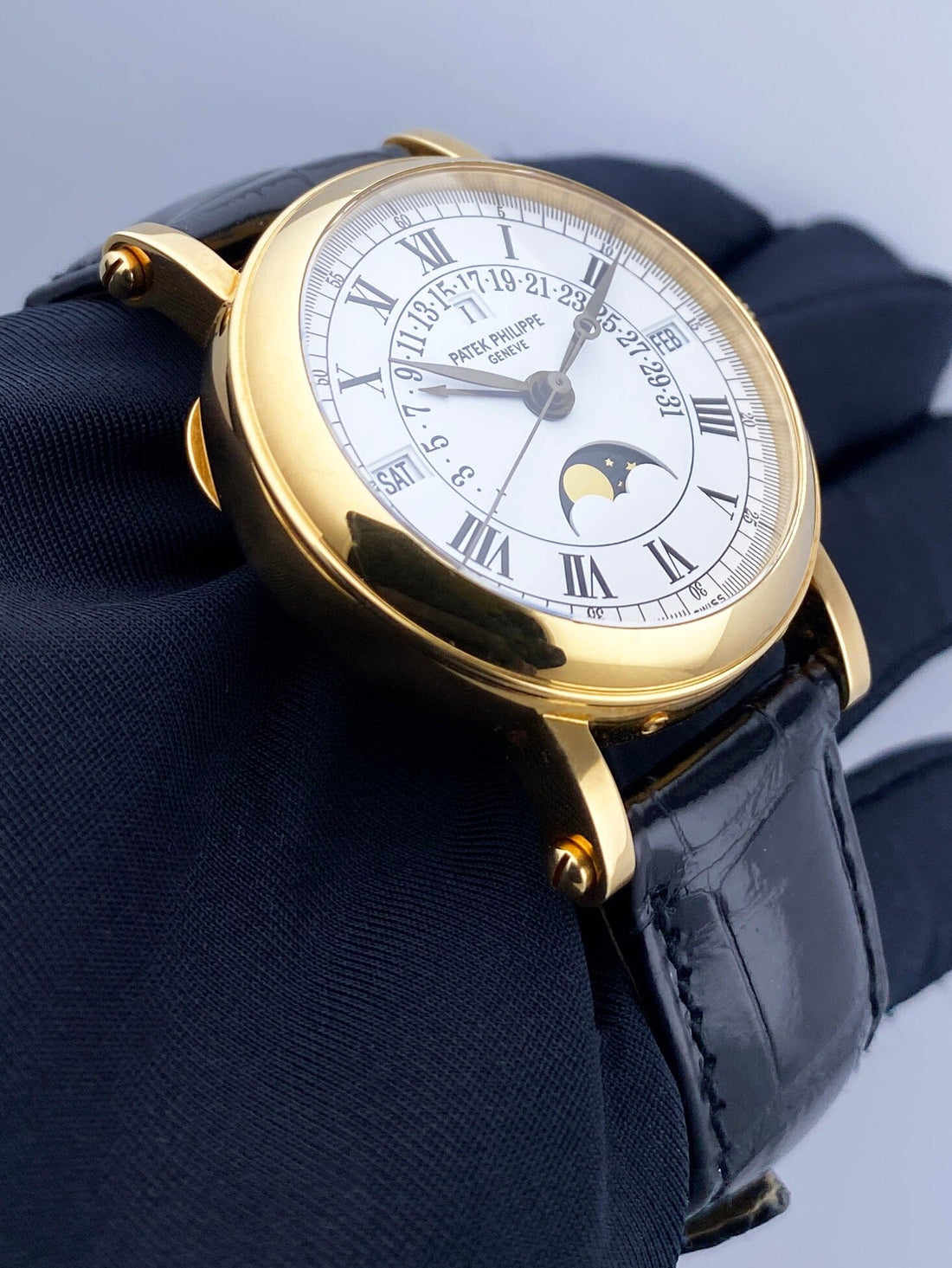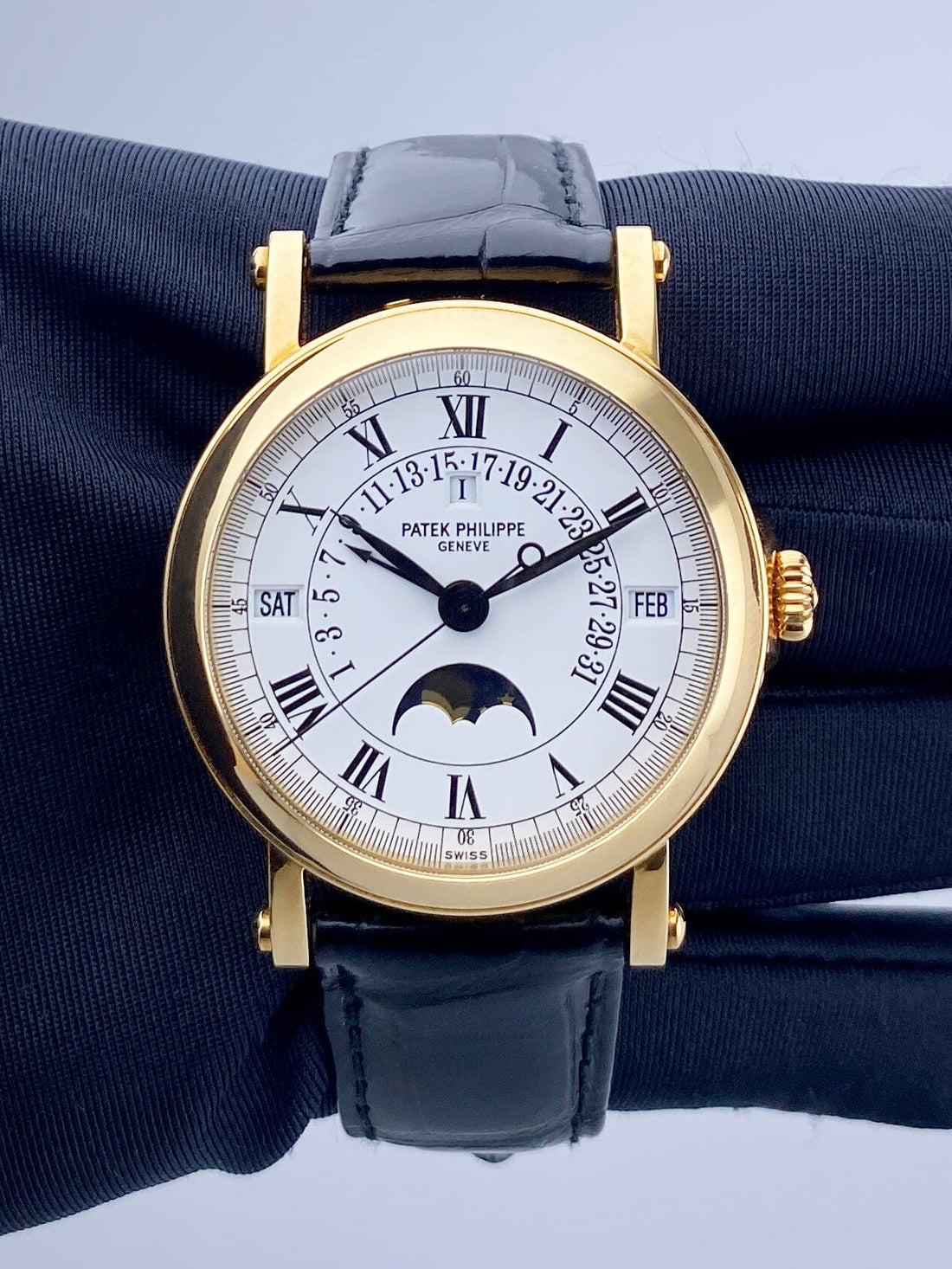 Patek Philippe Perpetual Calendar 5059J Mens Watch. 36mm 18K yellow gold case. 18K yellow gold bezel. White dial with black hands and Roman numeral hour markers. Perpetual calendar displays with a moon phase indicator. Black leather strap with 18K yellow gold deployment buckle. Will fit up to a 7-inch wrist. Sapphire crystal. 18K yellow gold boasting a hinged case back. Automatic self-winding movement.