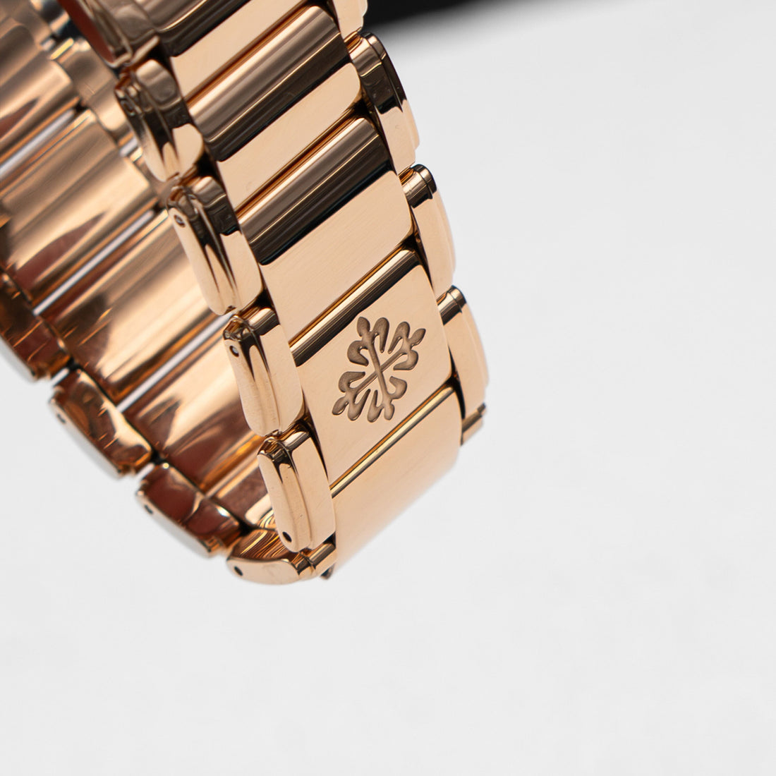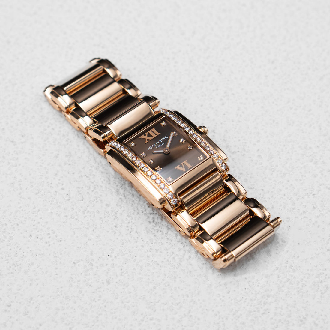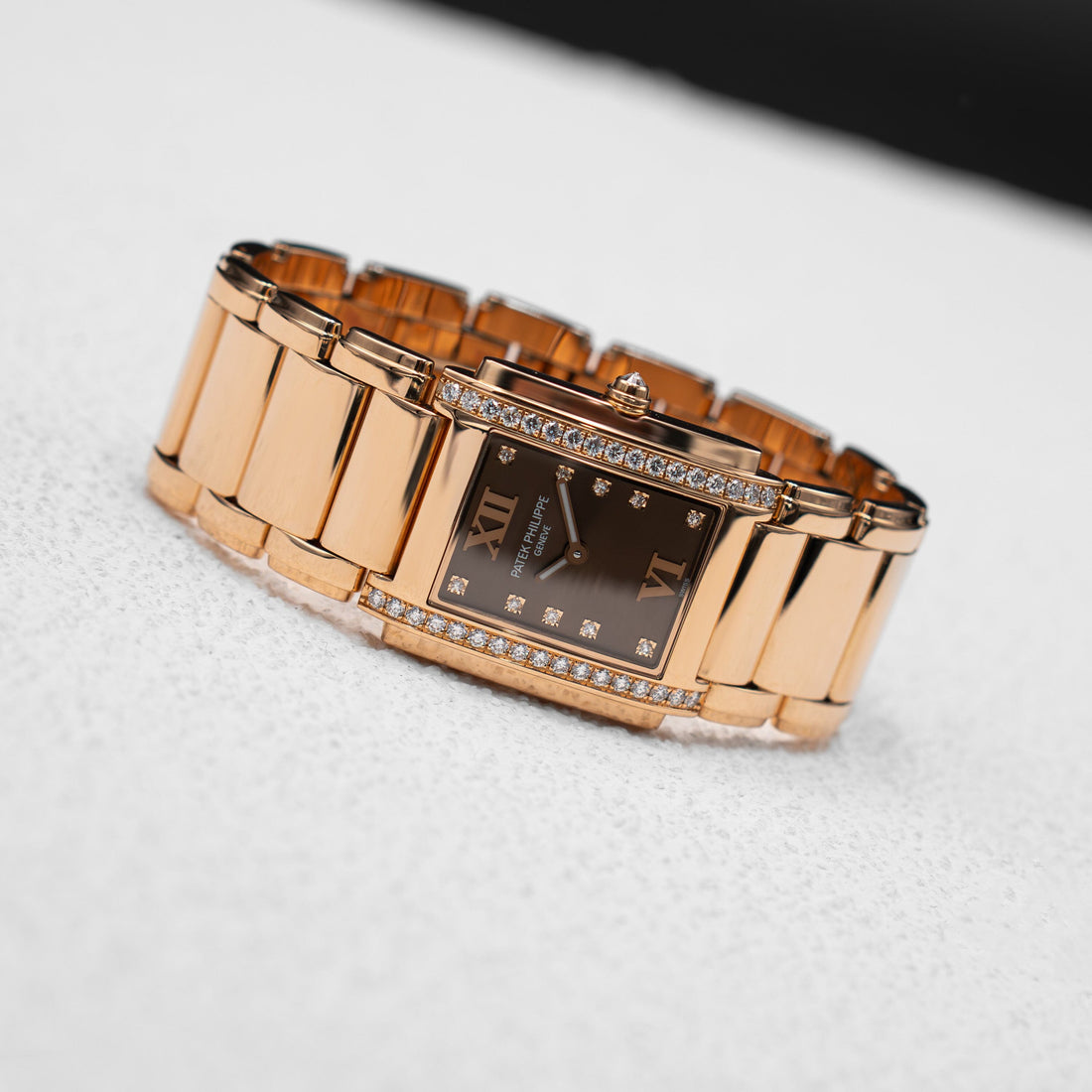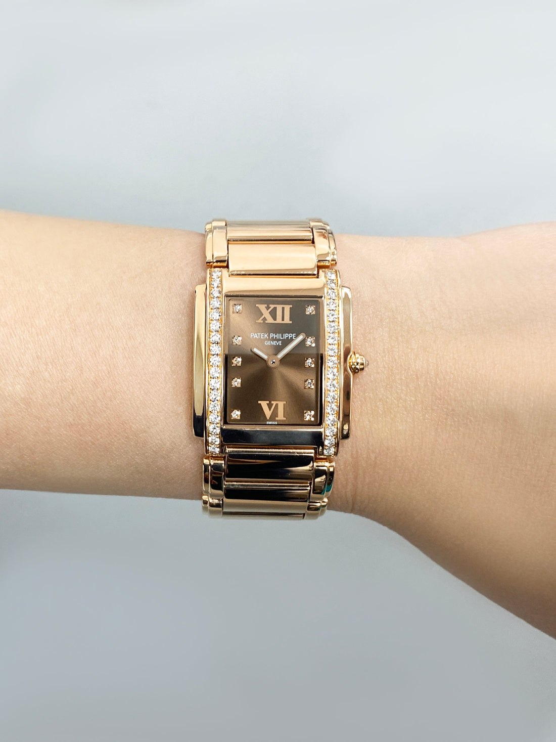 Patek Philippe Twenty-4 4910/11 Ladies Watch. 25mm 18K rose gold case. 18K rose gold bezel with original factory diamond. "Chocolate Dream", brown dial with luminous hands and Roman numeral & factory diamond set hour markers. 18K rose gold bracelet with hidden butterfly clasp. Will fit up to a 6-inch wrist. Sapphire crystal. 18K rose gold case back. Quartz: Battery powered movement.