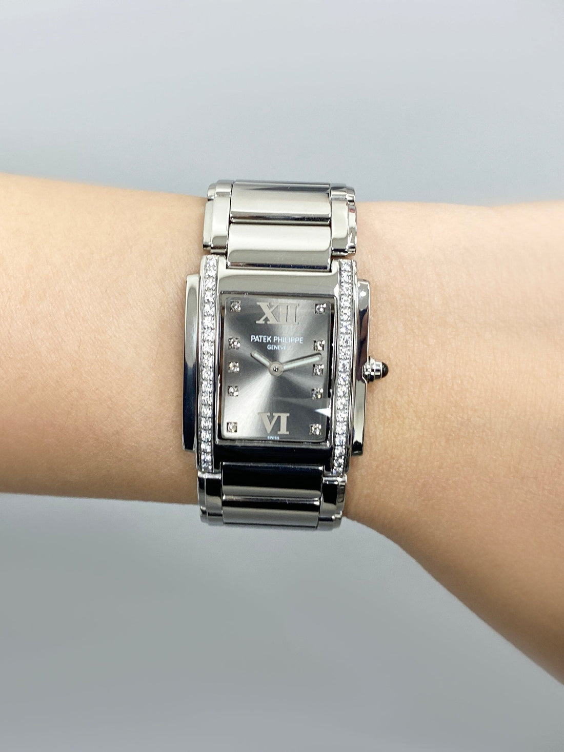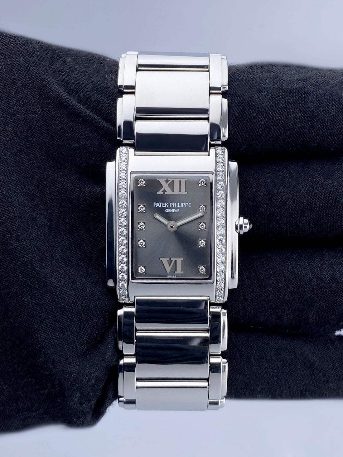 Patek Philippe Twenty-4 4910/10A-010 Ladies Watch. 25mm stainless steel case. Stainless steel with original factory diamond set bezel. Gray dial with steel hands and Roman numeral & original factory diamond set hour markers. Stainless steel bracelet with a hidden butterfly clasp. Will fit up to a 6-inch wrist. Sapphire crystal. Stainless steel case back. Quartz: Battery powered movement.