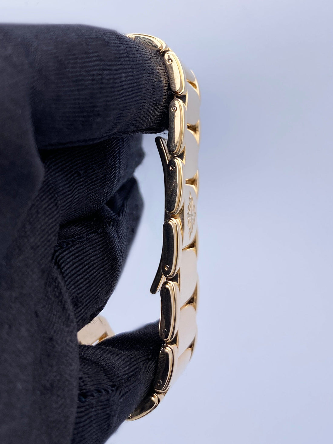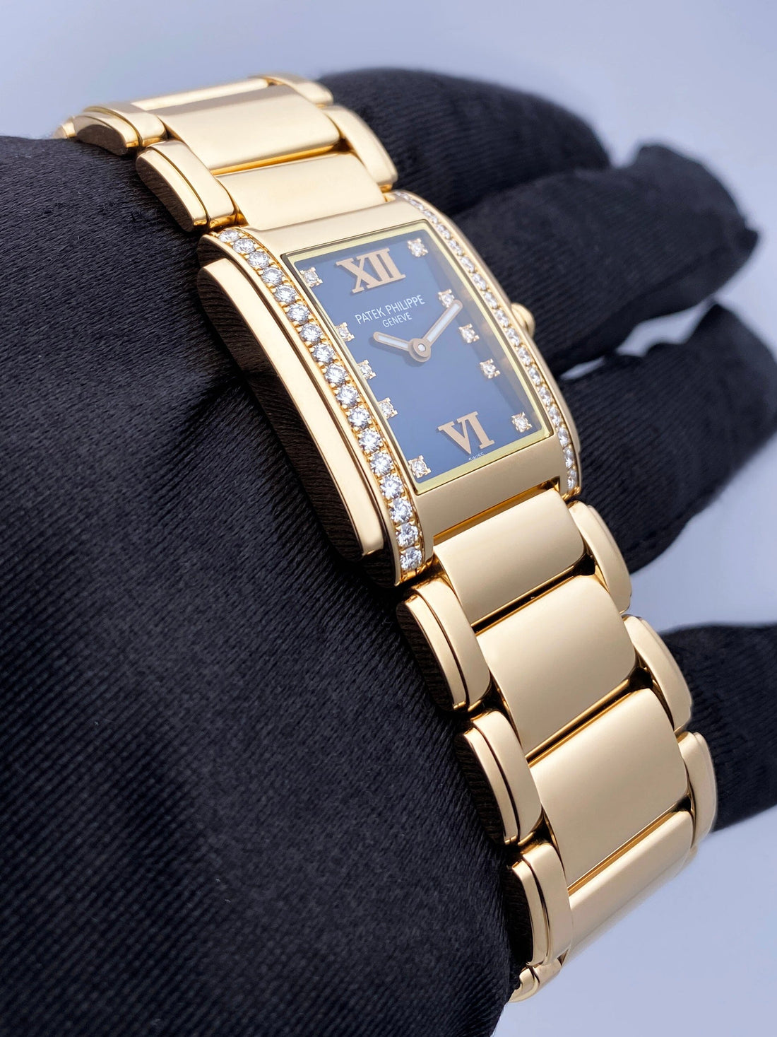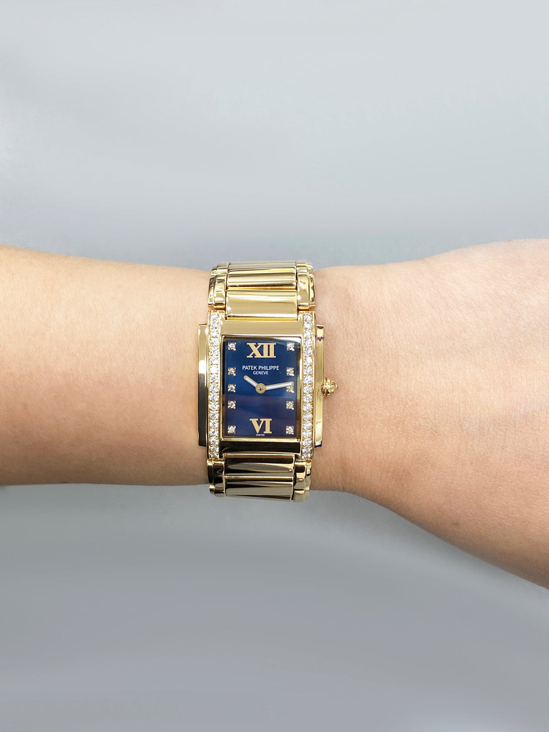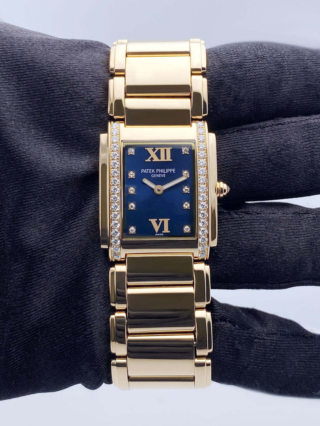 Patek Philippe Twenty-4 4910R Ladies Watch. 25mm 18K rose gold case. 18K rose gold with original factory diamond set bezel. Blue dial with luminous hands and Roman numeral & factory diamond set hour markers. 18K rose gold bracelet with hidden butterfly clasp. Will fit up to a 6.25-inch wrist. Sapphire crystal. 18K rose gold case back. Quartz: Battery powered movement.