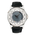 Patek Philippe World Time 5110P-001 Mens Watch. 37mm platinum case. Platinum smooth bezel. World Time dial with silver-tone hands and index hour marker. World Time dial: the inner face is Guilloche silver. The settable disc in silver and black. making both the nocturnal and diurnal hours. The outer dial show reference city represents one of the 24 principal time zones. Black leather strap with platinum deployment buckle. Will fit up to 7-Inch wrist. Sapphire crystal. Transparent sapphire crystal case back. Automatic self-winding movement.