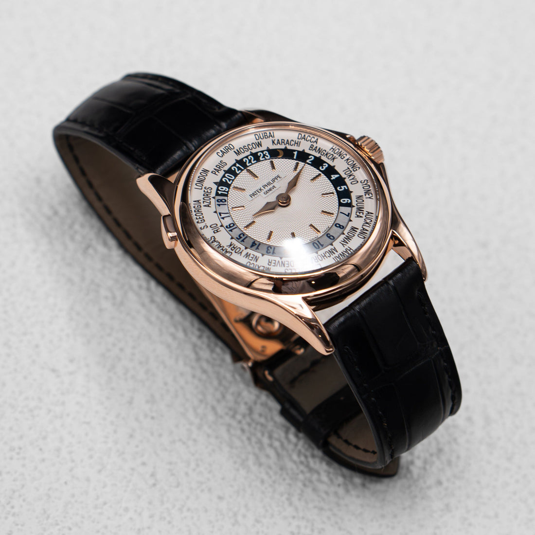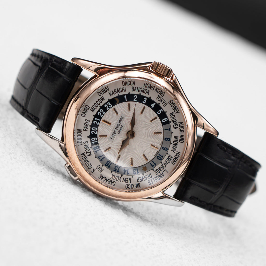 Patek Philippe World Time 5110R-001 Mens Watch. 37mm 18K rose gold case. 18K rose gold smooth bezel. World Time dial with rose gold hands and index hour marker. World Time dial: the inner face is Guilloche silver. The settable disc in silver and black. making both the nocturnal and diurnal hours. The outer dial show reference city represents one of the 24 principal time zones. Black leather strap with 18K rose gold deployment buckle. Will fit up to 7-Inch wrist. Sapphire crystal. Transparent sapphire crystal case back. Automatic self-winding movement. This watch comes with original Box and Papers.