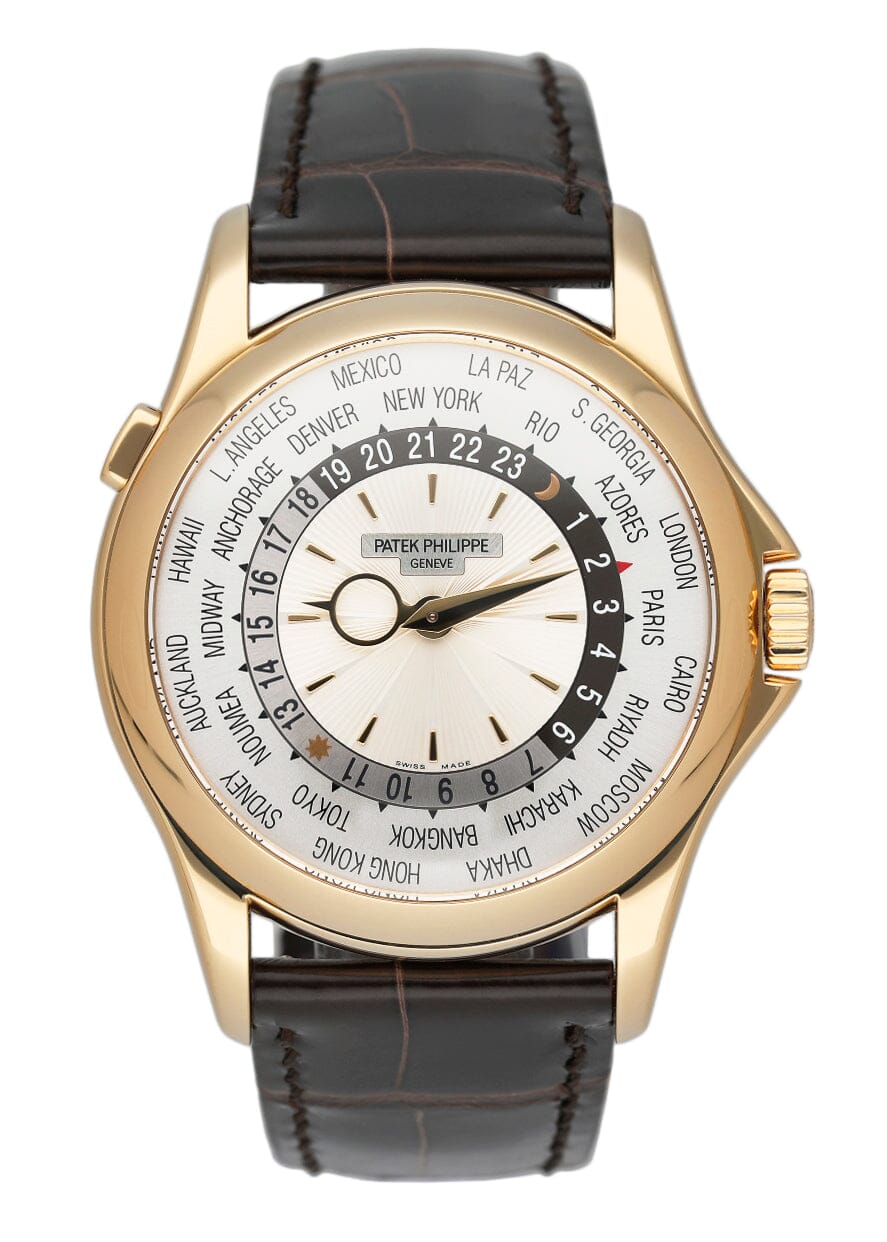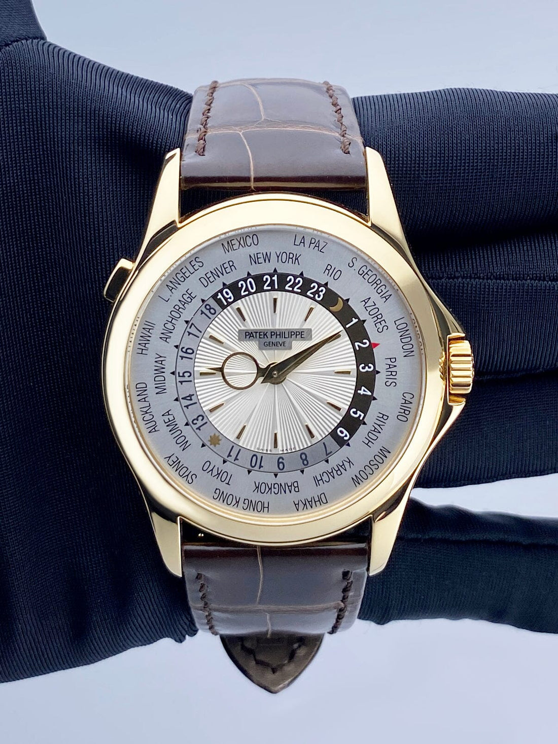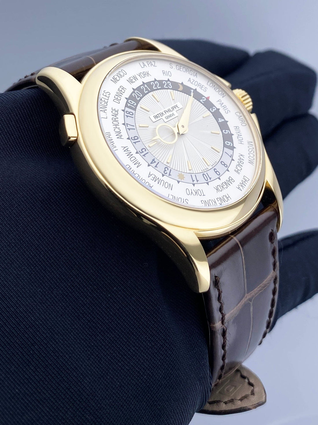 Patek Philippe World Time 5130J-001 Mens Watch. 39mm 18K yellow gold case. 18K yellow gold smooth bezel. World Time dial with gold hands and index hour marker. World Time dial: the inner face is Guilloche silver. The settable disc in silver and black making both the nocturnal and diurnal hours. The outer dial show reference city represents one of the 24 principal time zones. Brown leather strap with 18K yellow gold deployment buckle. Will fit up to 7.5-Inch wrist. Sapphire crystal. Transparent sapphire crystal case back. Automatic self-winding movement. This watch comes with original Box and Papers.