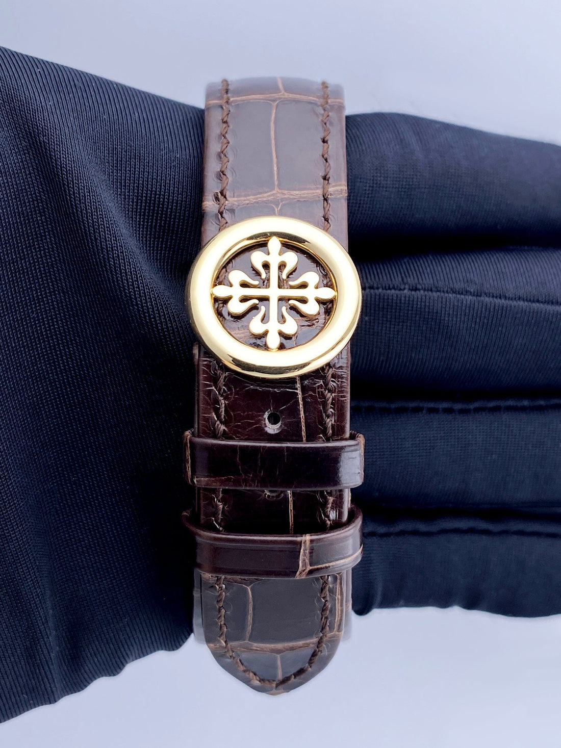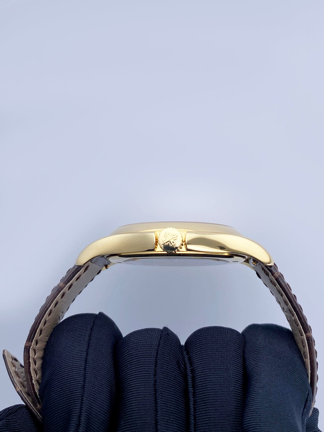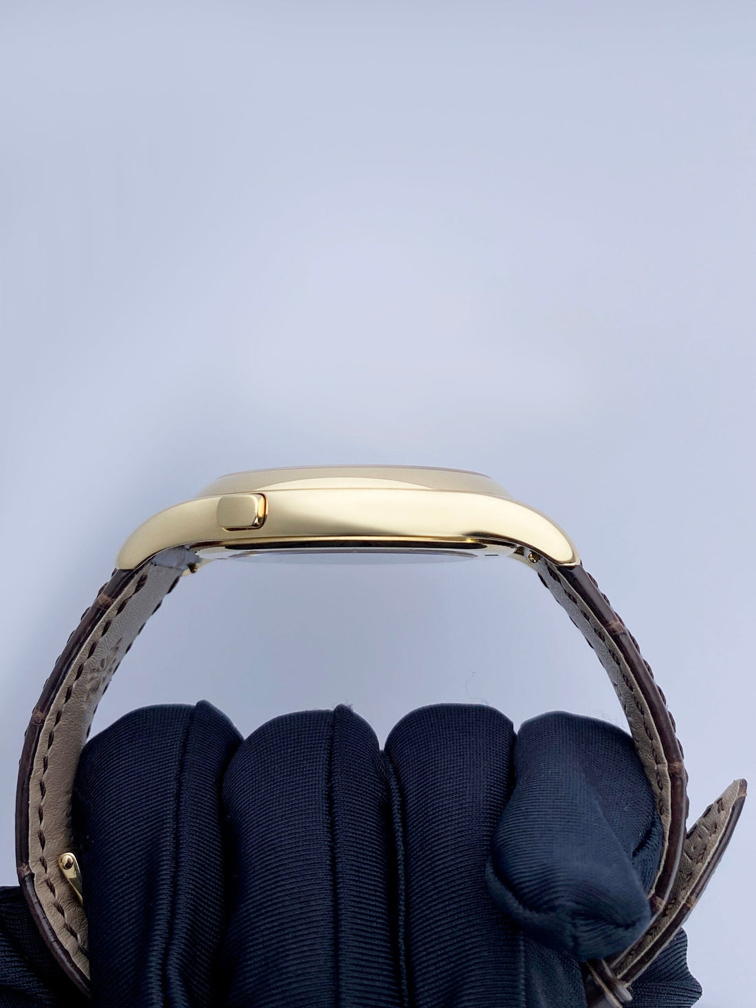 Patek Philippe World Time 5130J-001 Mens Watch. 39mm 18K yellow gold case. 18K yellow gold smooth bezel. World Time dial with gold hands and index hour marker. World Time dial: the inner face is Guilloche silver. The settable disc in silver and black making both the nocturnal and diurnal hours. The outer dial show reference city represents one of the 24 principal time zones. Brown leather strap with 18K yellow gold deployment buckle. Will fit up to 7.5-Inch wrist. Sapphire crystal. Transparent sapphire crystal case back. Automatic self-winding movement. This watch comes with original Box and Papers.