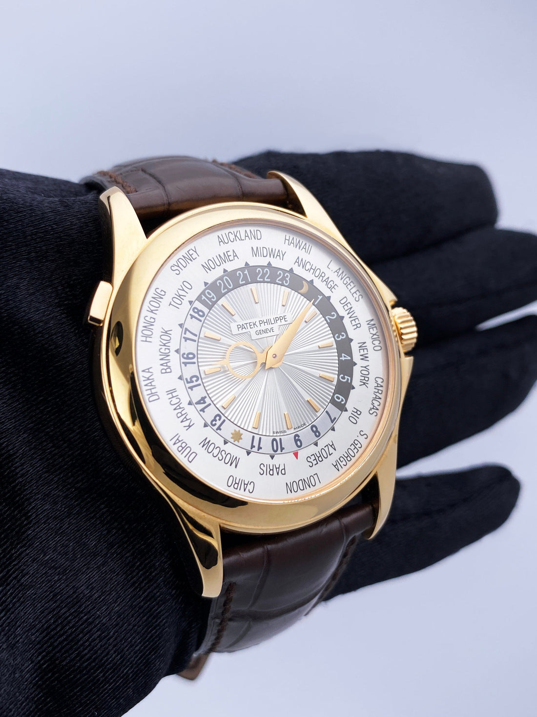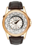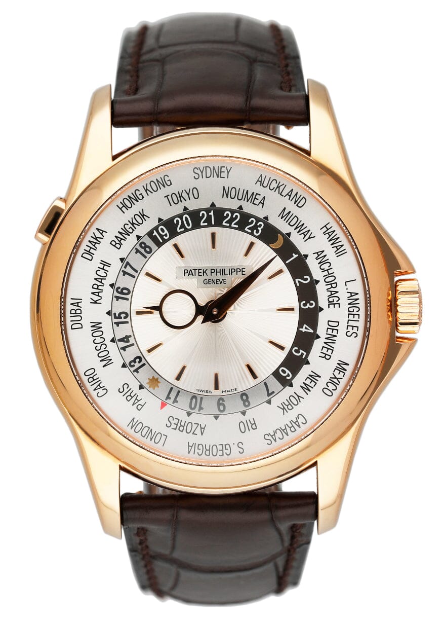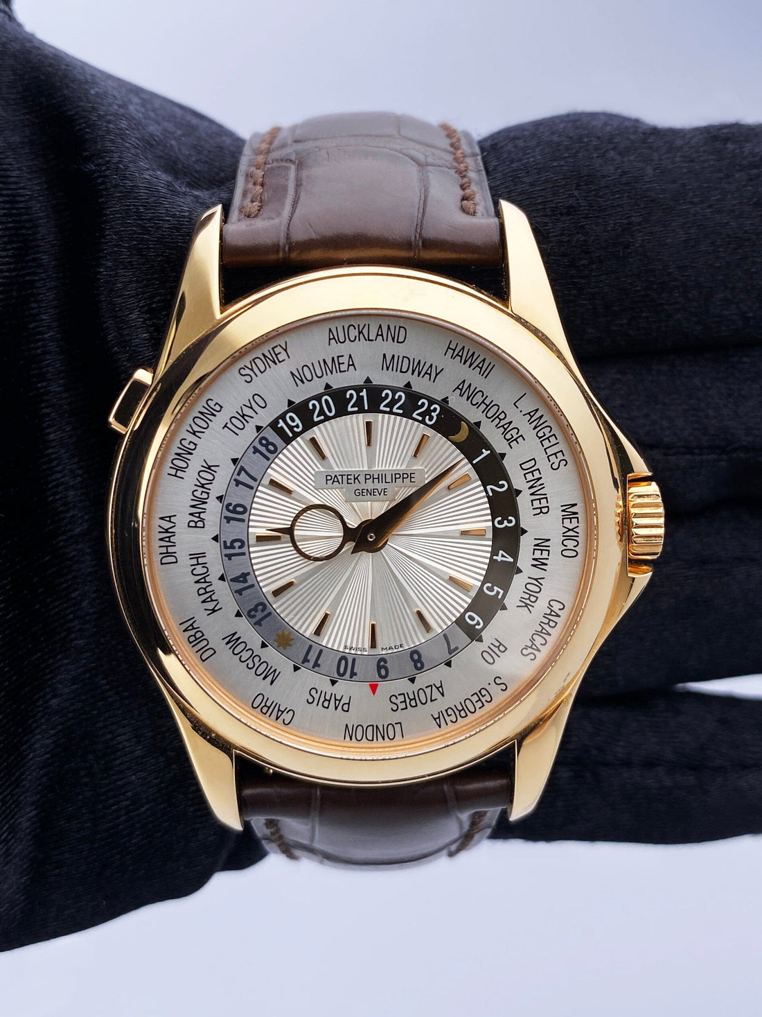 Patek Philippe World Time 5130R-001 Mens Watch. 39mm 18K rose gold case. 18K rose gold smooth bezel. World Time dial with rose gold hands and index hour marker. World Time dial: the inner face is Guilloche silver. The settable disc in silver and black making both the nocturnal and diurnal hours. The outer dial show reference city represents one of the 24 principal time zones. Black leather strap with 18K rose gold deployment buckle. Will fit up to 7-Inch wrist. Sapphire crystal. Transparent sapphire crystal case back. Automatic self-winding movement. This watch comes with original Box and Papers.