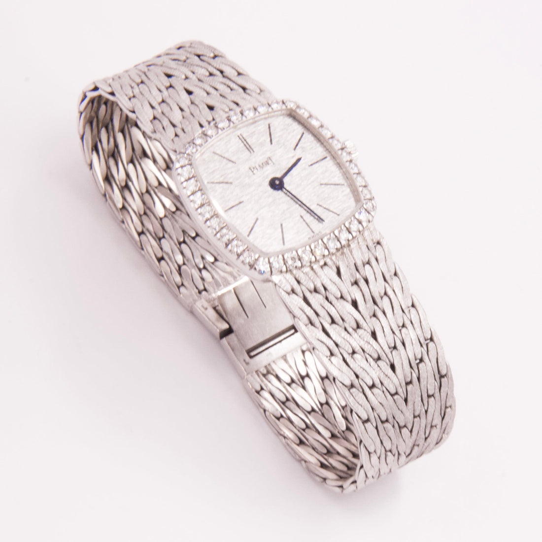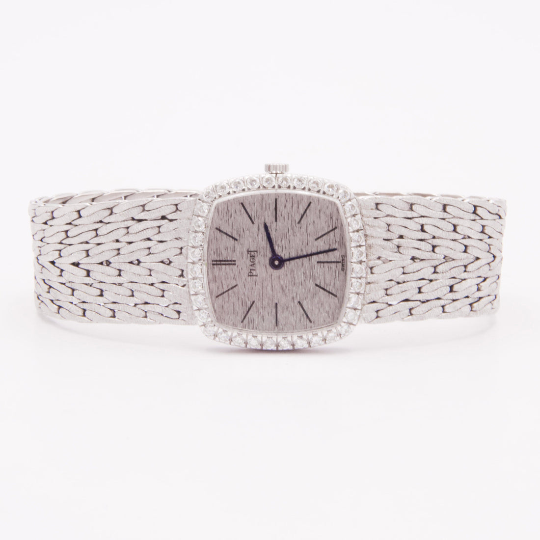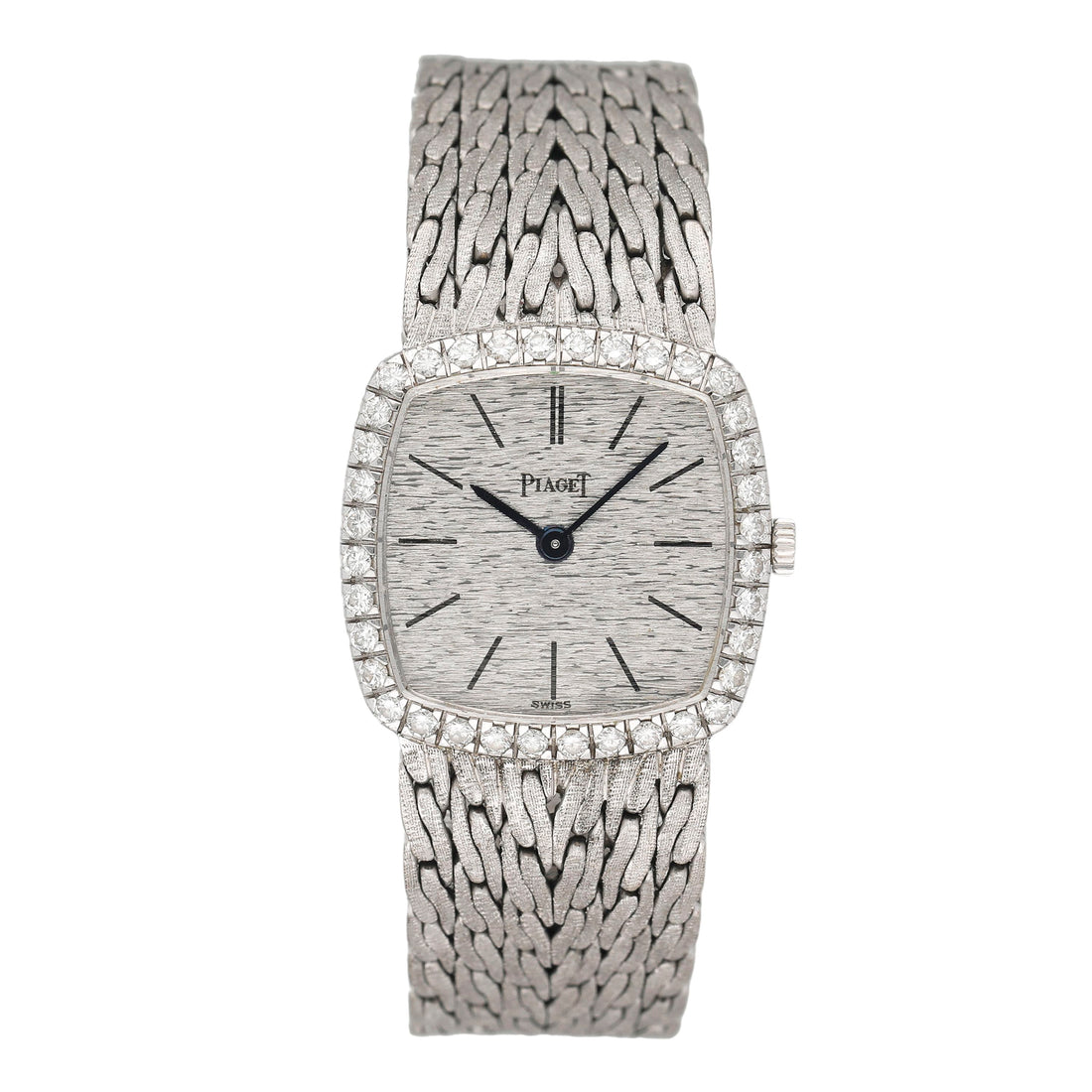 Piaget 9236 E 47 Ladies Watch. 23mm 18K white gold case. 18K white gold bezel with original factory diamond set. Textured silver dial with blue hands and index hours marker. 18K white gold mesh bracelet with 18K white gold jewelry clasp. Will fit up to 6-Inch wrist. Sapphire crystal. 18K white gold back case. Mechanical hand-winding movement.