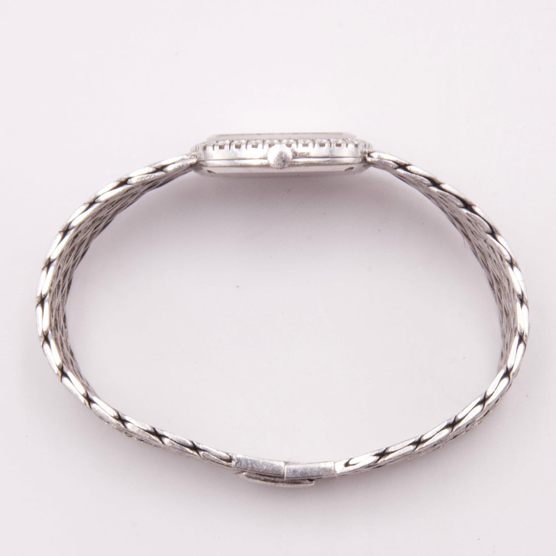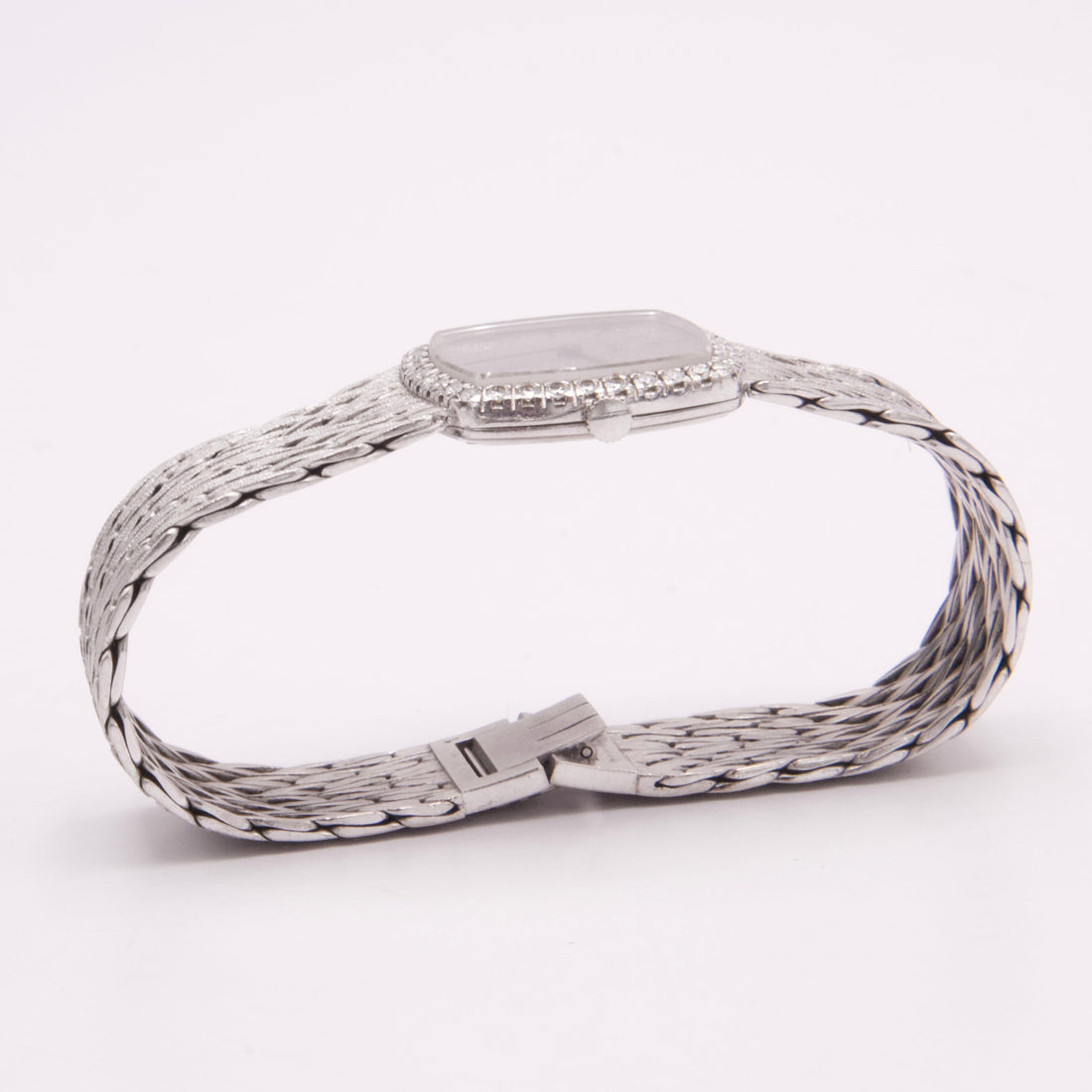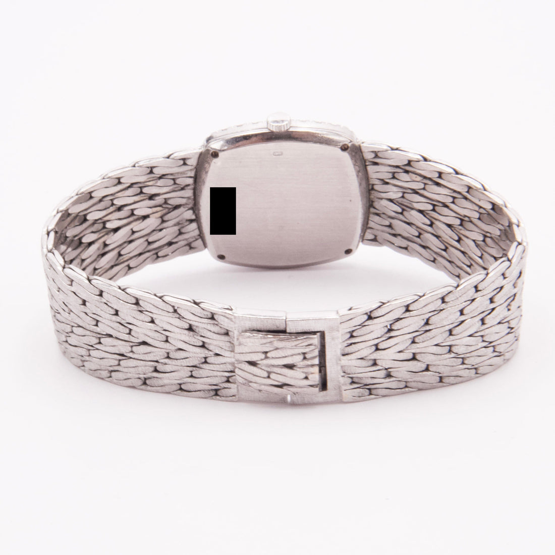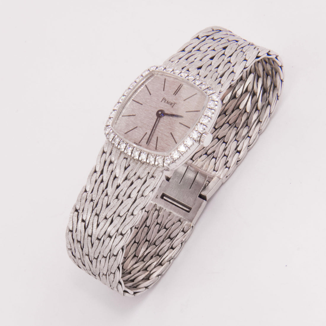Piaget 9236 E 47 Ladies Watch. 23mm 18K white gold case. 18K white gold bezel with original factory diamond set. Textured silver dial with blue hands and index hours marker. 18K white gold mesh bracelet with 18K white gold jewelry clasp. Will fit up to 6-Inch wrist. Sapphire crystal. 18K white gold back case. Mechanical hand-winding movement.