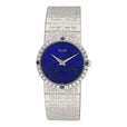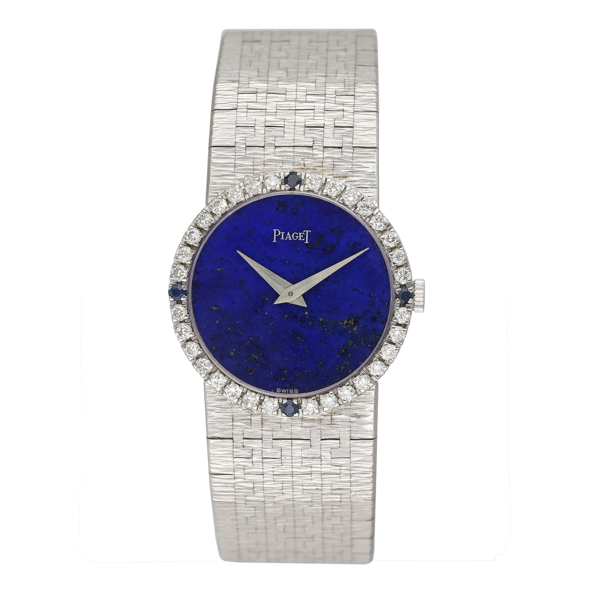 Piaget 9706 A6 Ladies Watch. 24mm 18K white gold case. 18K white gold bezel with original factory diamond set. Lapis dial with sliver-tone hands. 18K white gold mesh bracelet with 18K white gold jewelry clasp. Will fit up to 5.75-Inch wrist. Sapphire crystal. 18K white gold back case. Mechanical hand-winding movement.