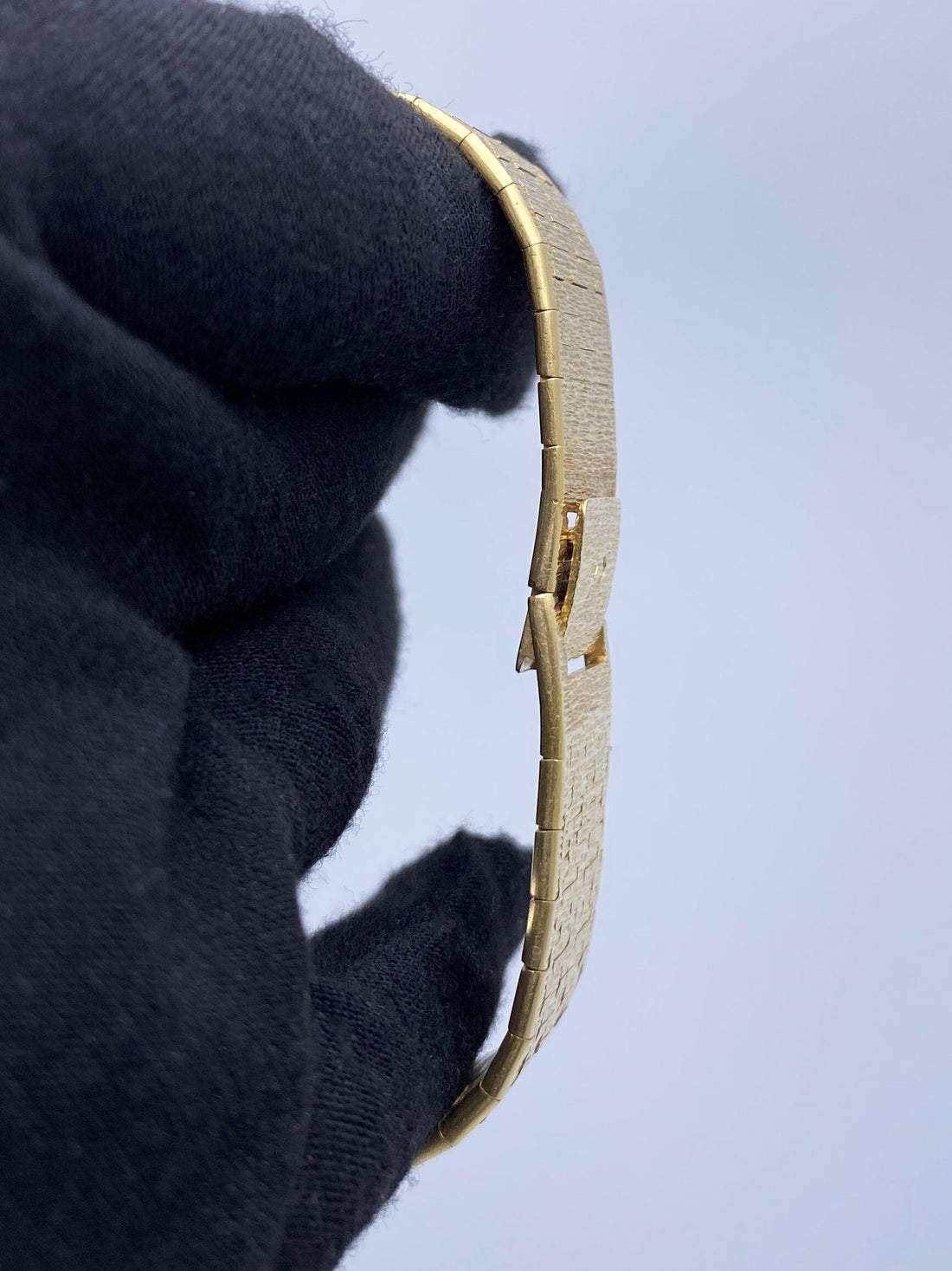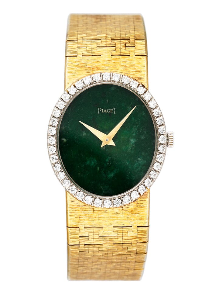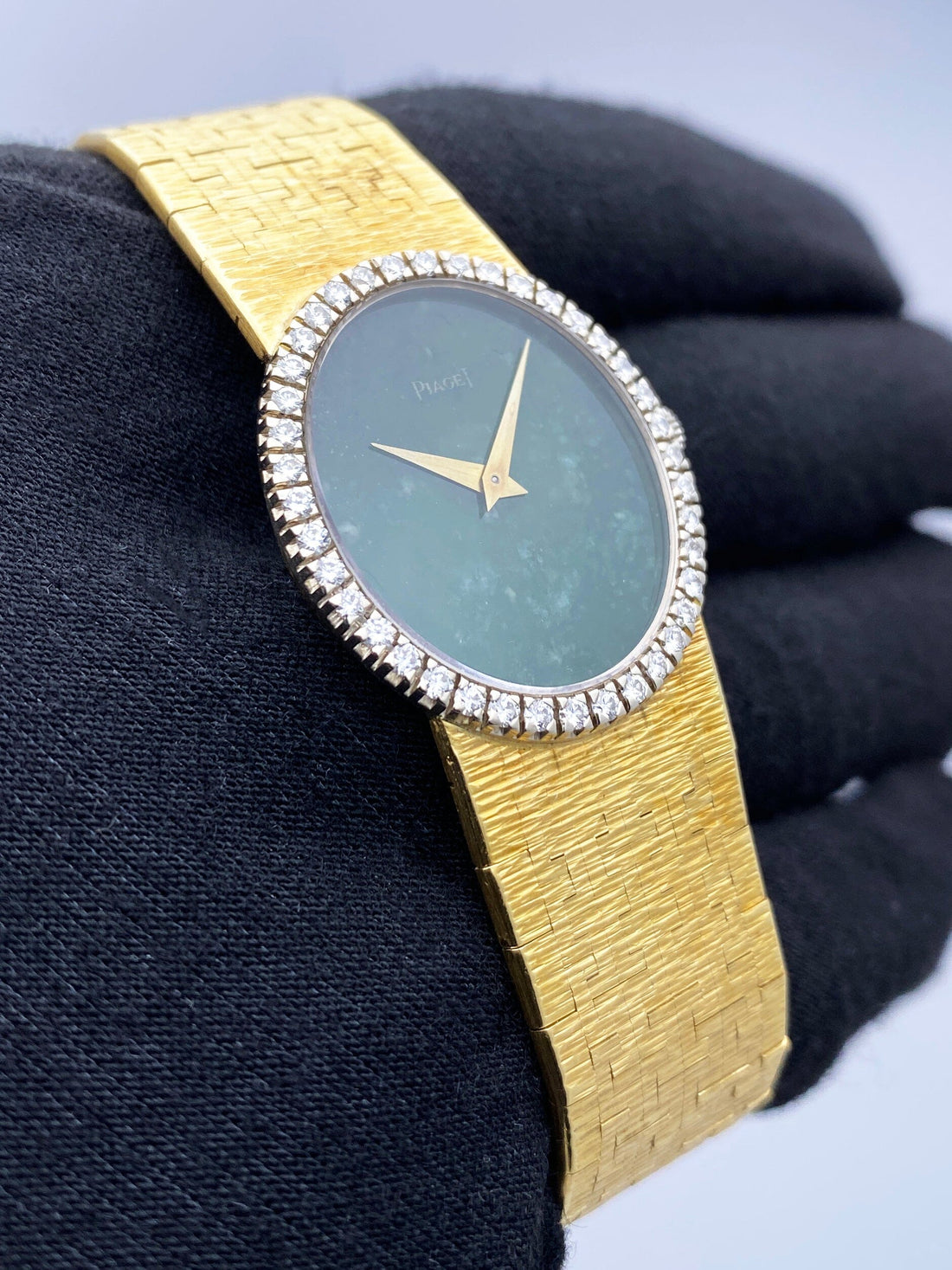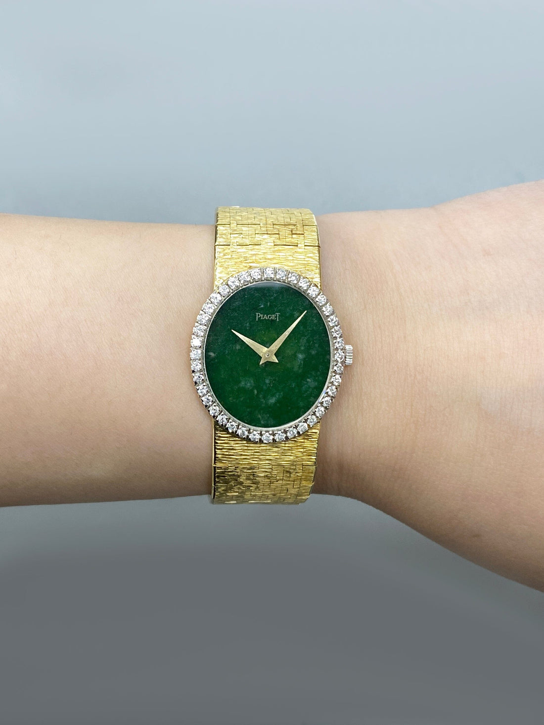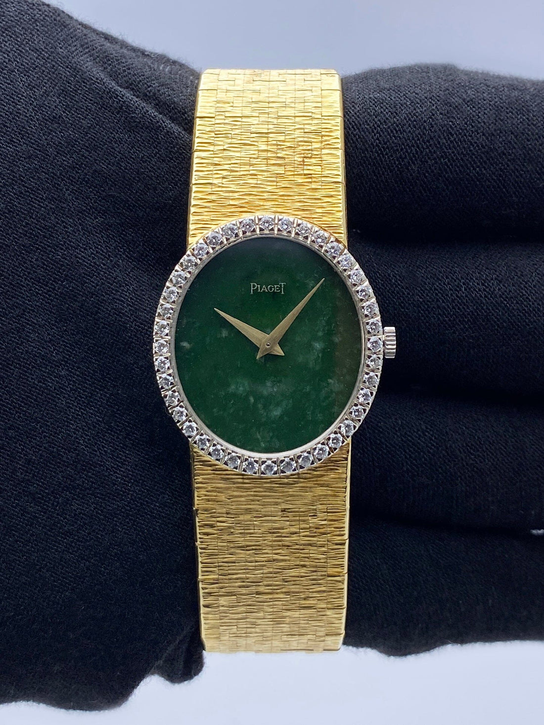 Piaget 9826A6 Ladies Watch. 24mm 18K yellow gold case. 18K white gold bezel with factory diamond sets. Green Nephrite dial with gold hands. 18K yellow gold mesh bracelet with 18K yellow gold jewelry clasp. Will fit up to 6-Inch wrist. Sapphire crystal. 18K yellow gold back case. Mechanical hand-winding movement.