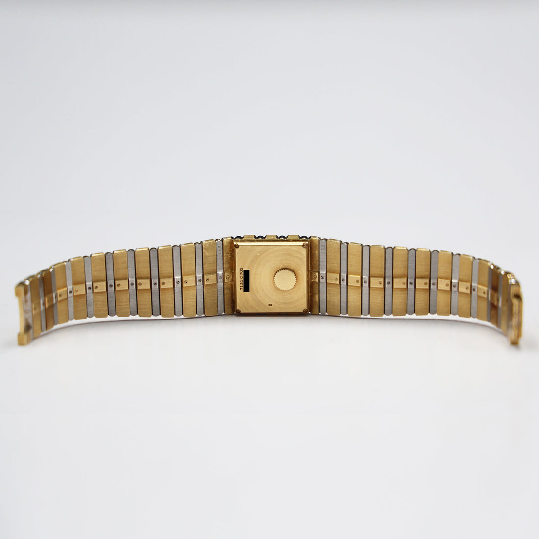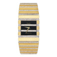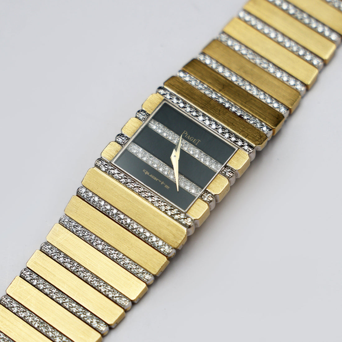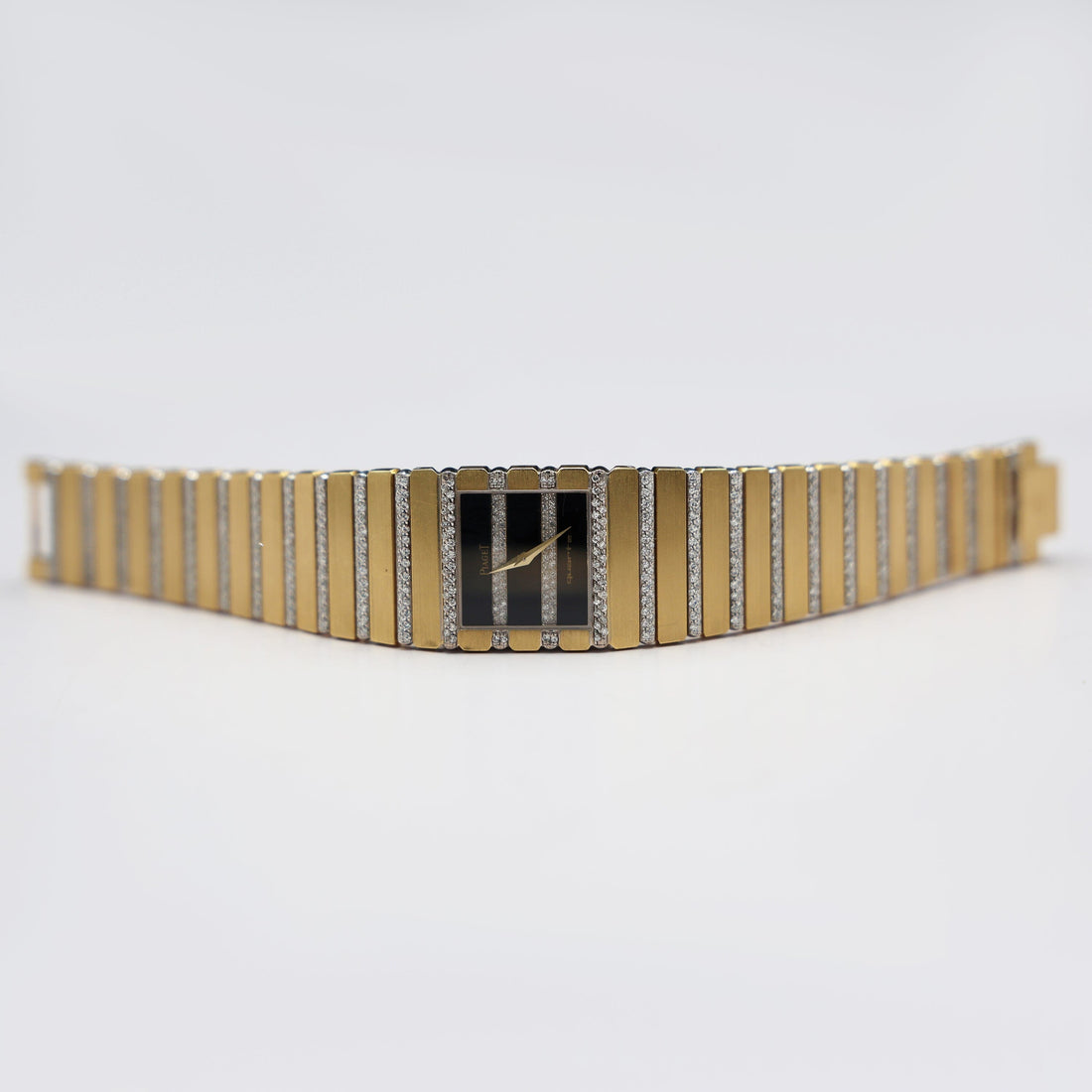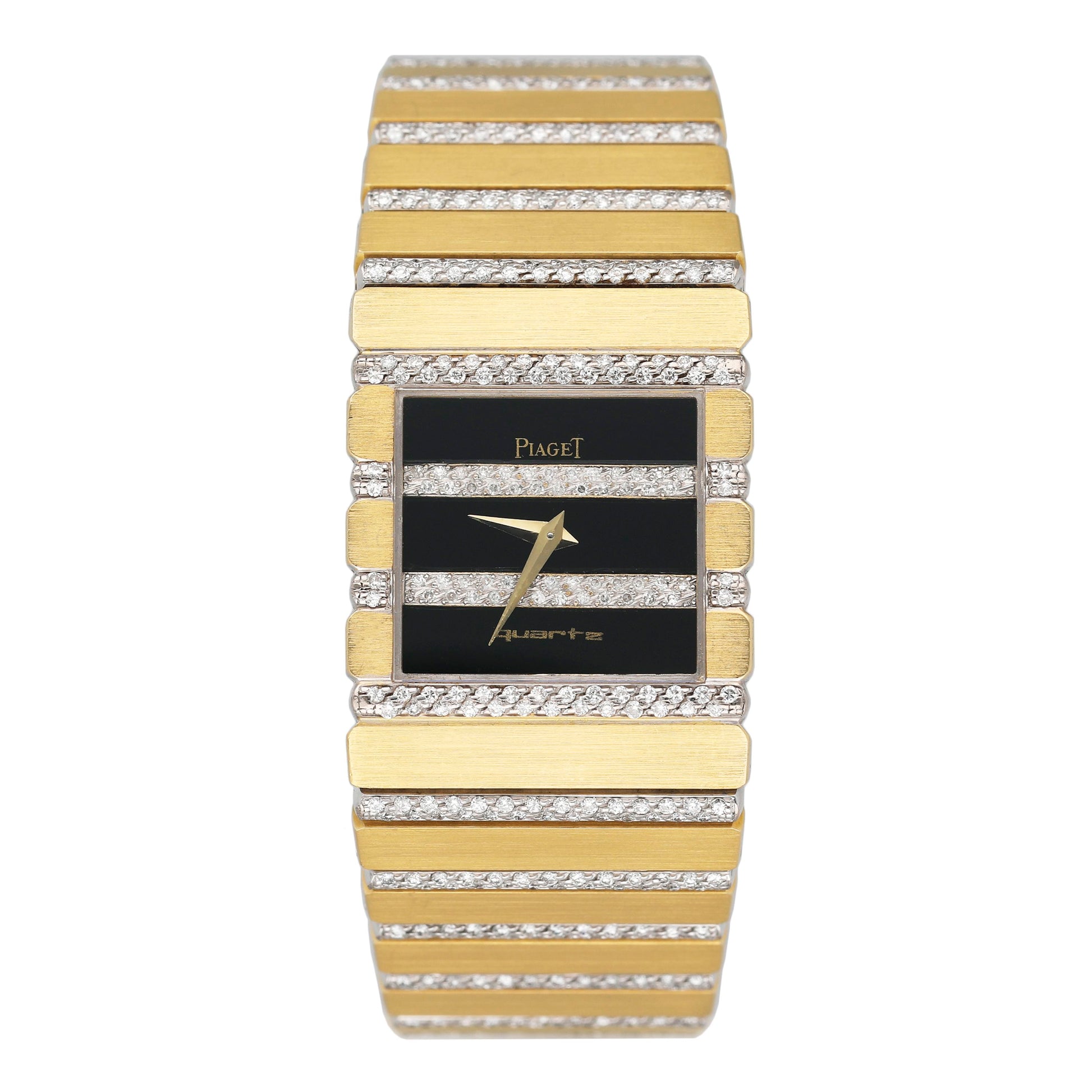 Piaget Polo 7131 C705 Ladies Watch. 25.00mm 18k yellow gold & diamonds case. 18k yellow gold & factory set diamond bezel. Black dial and index hour markers. bracelet with 18k yellow gold jewelry clasp. Will fit up to 6.00-inch wrist. Sapphire crystal. 18k yellow gold case back. Quartz movement.