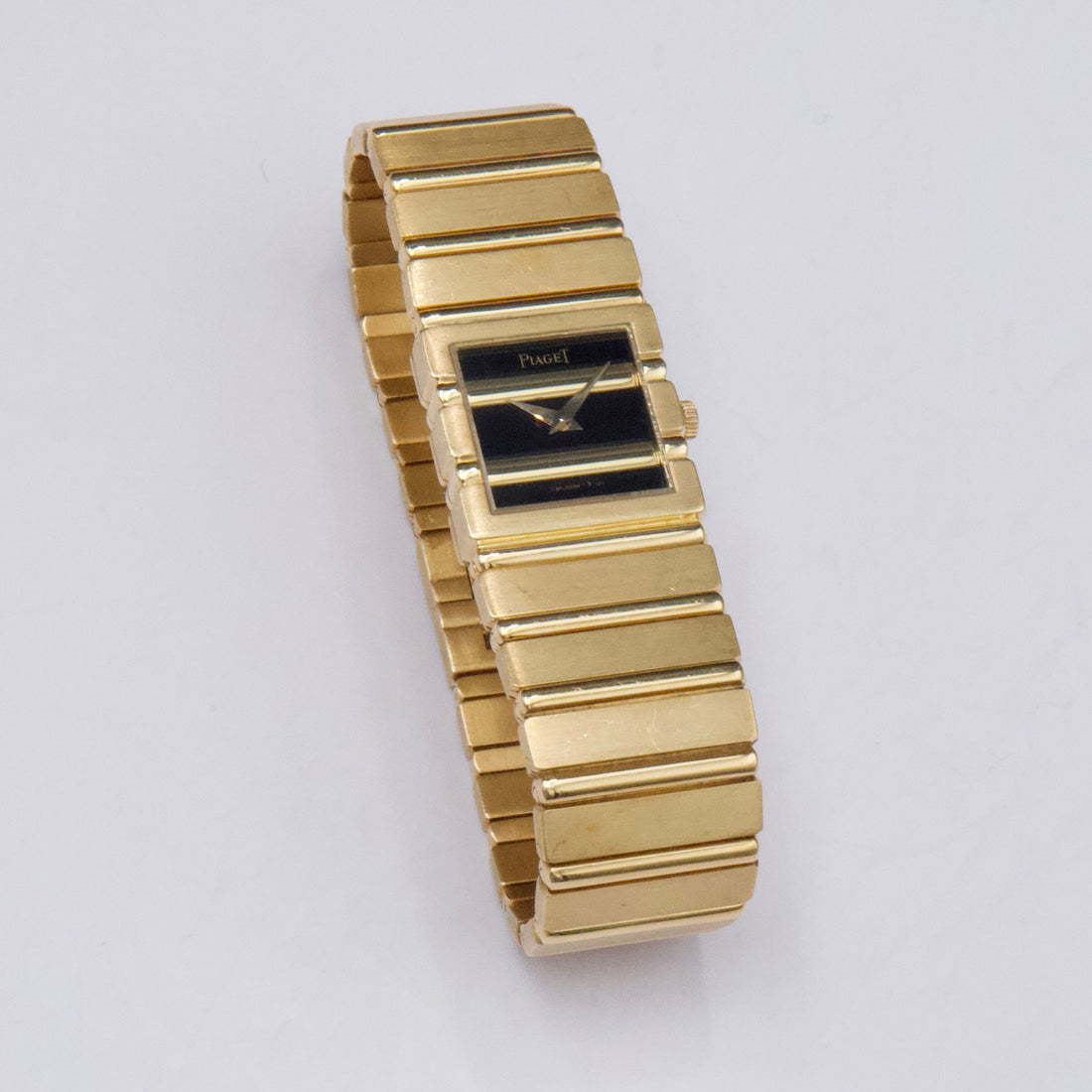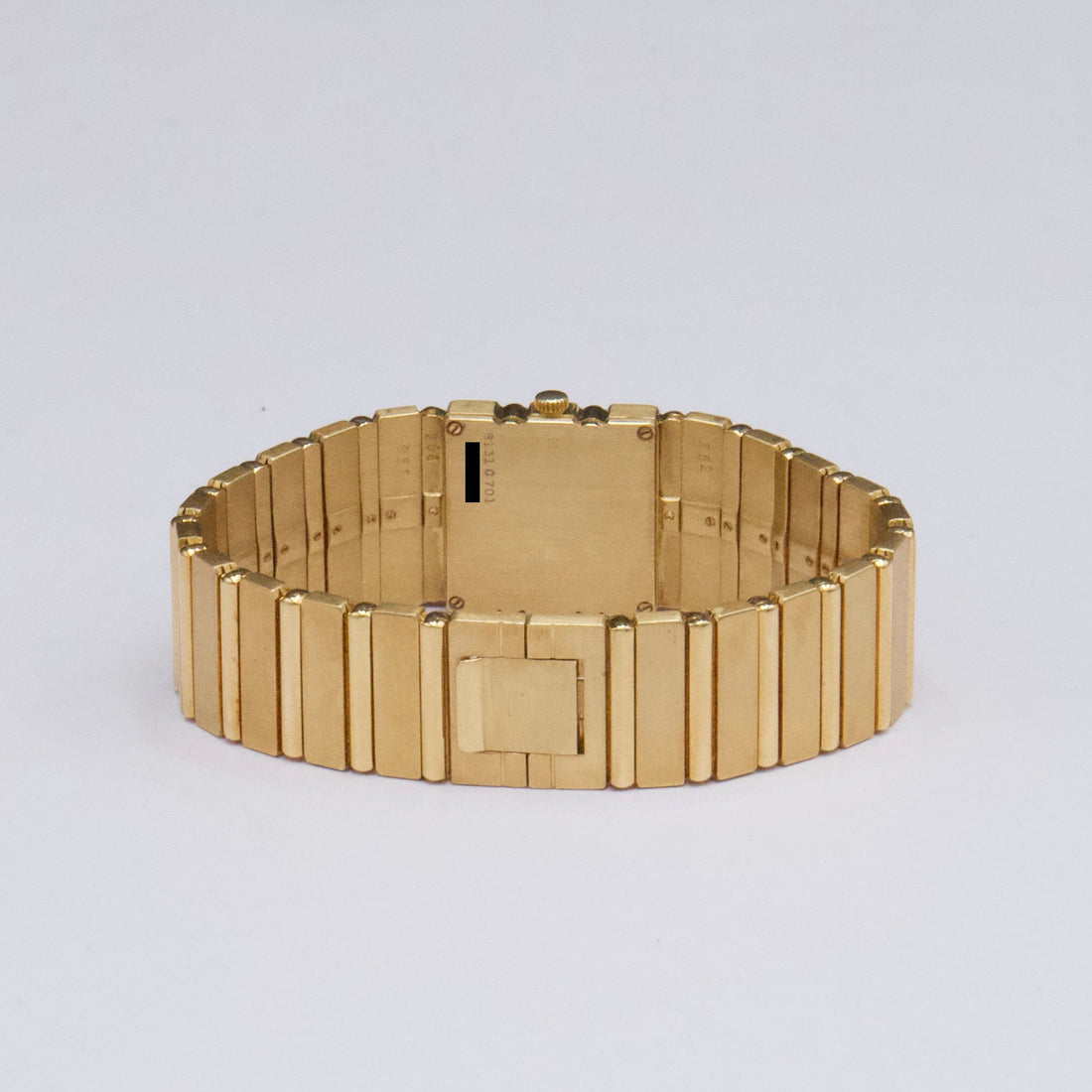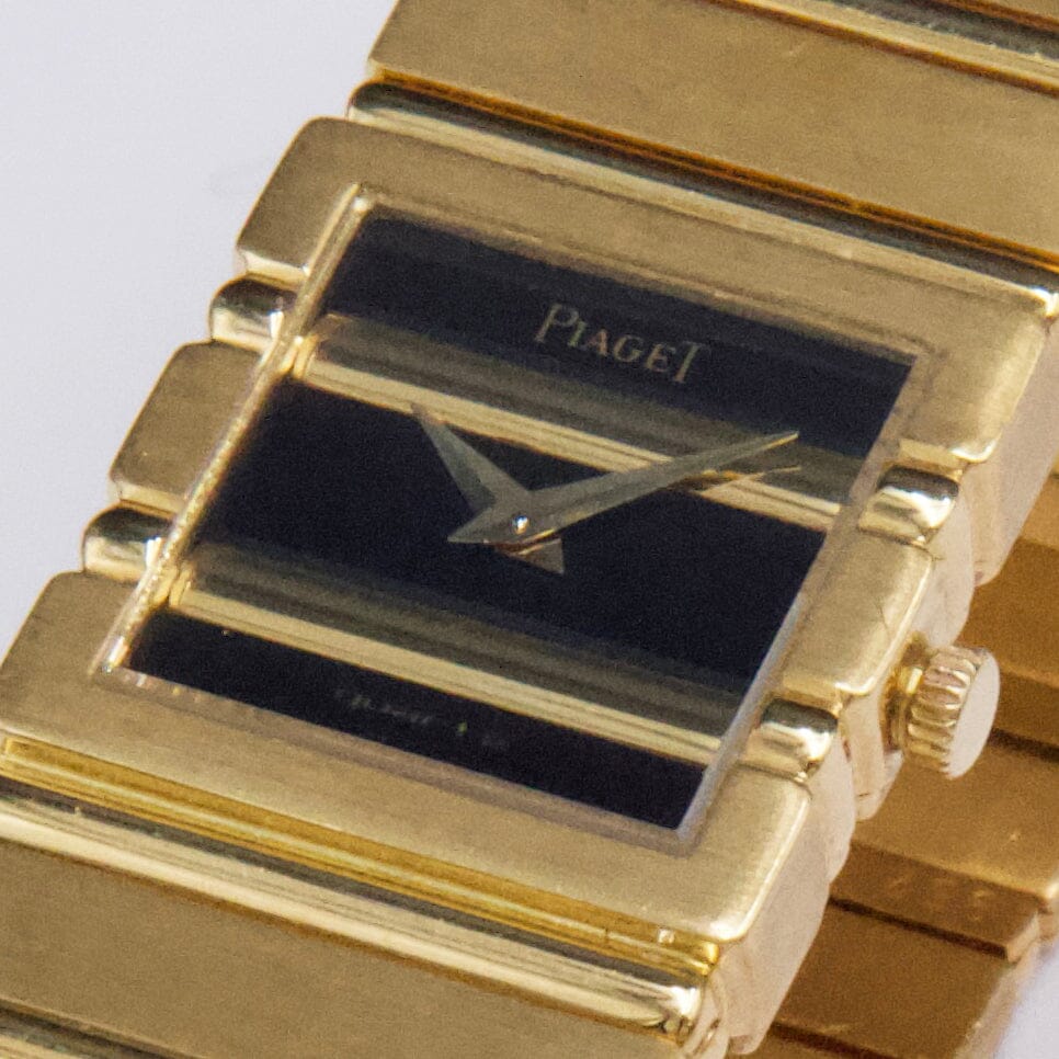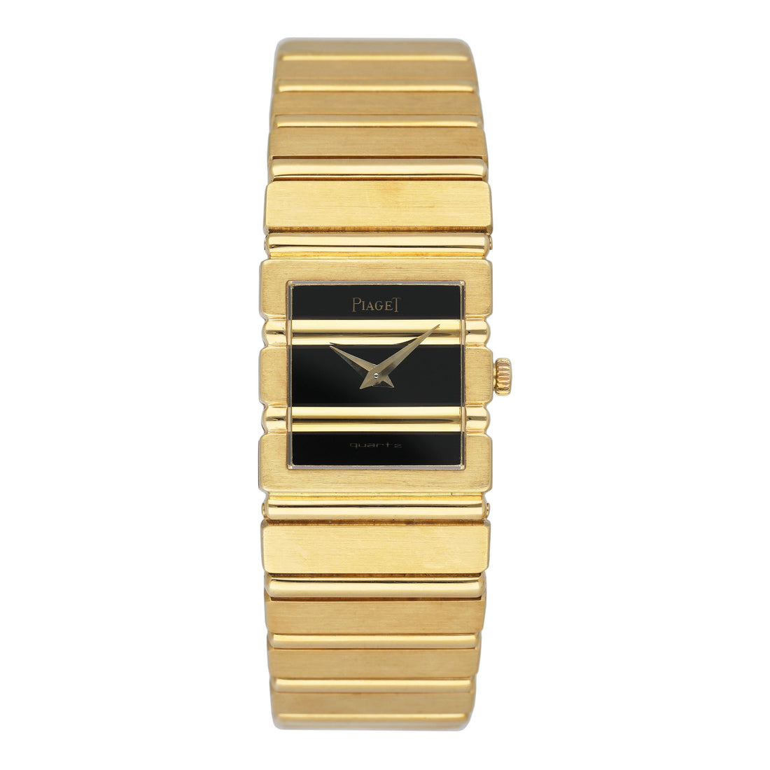 Piaget Polo 8131 C701 Ladies Watch. 20mm 18K yellow gold case with 18K yellow gold bezel. Black dial with gold hands and dot hour marker. Minute marker on the outer dial. 18K yellow gold bracelet with jewelry clasp. Will fit up to a 6.5-Inch wrist. Sapphire crystal. 18K yellow gold case back. Quartz: Battery powered movement.