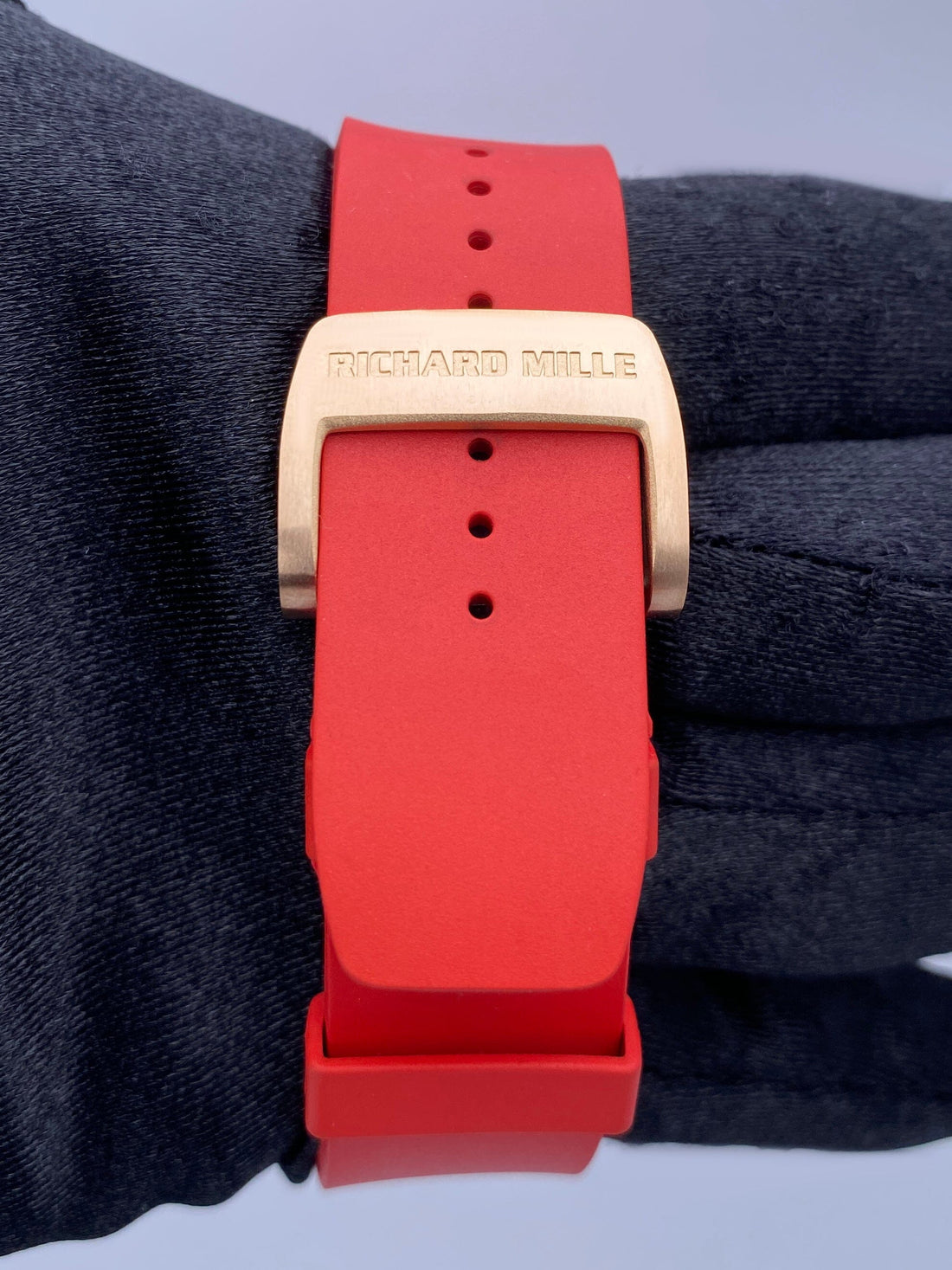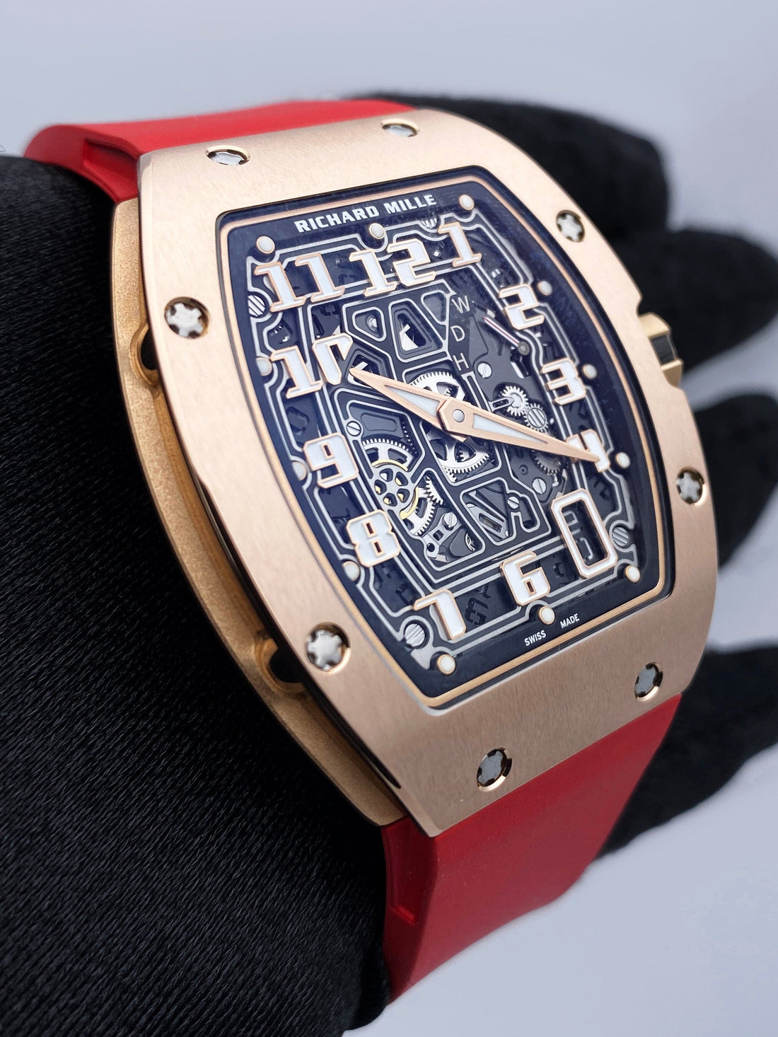 Richard Mille Extra Flat RM 67-01 RG Mens Watch. 39mm 18K rose gold case with 18K rose gold bezel. Skeleton dial with luminous rose gold hands and Arabic numeral hour marker. Red rubber strap with 18K rose gold deployment buckle. Will fit up to 7-inch wrist. Sapphire crystal. Skeleton case back with sapphire crystal. Automatic self-winding movement. This watch comes with the original Box and Papers.