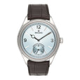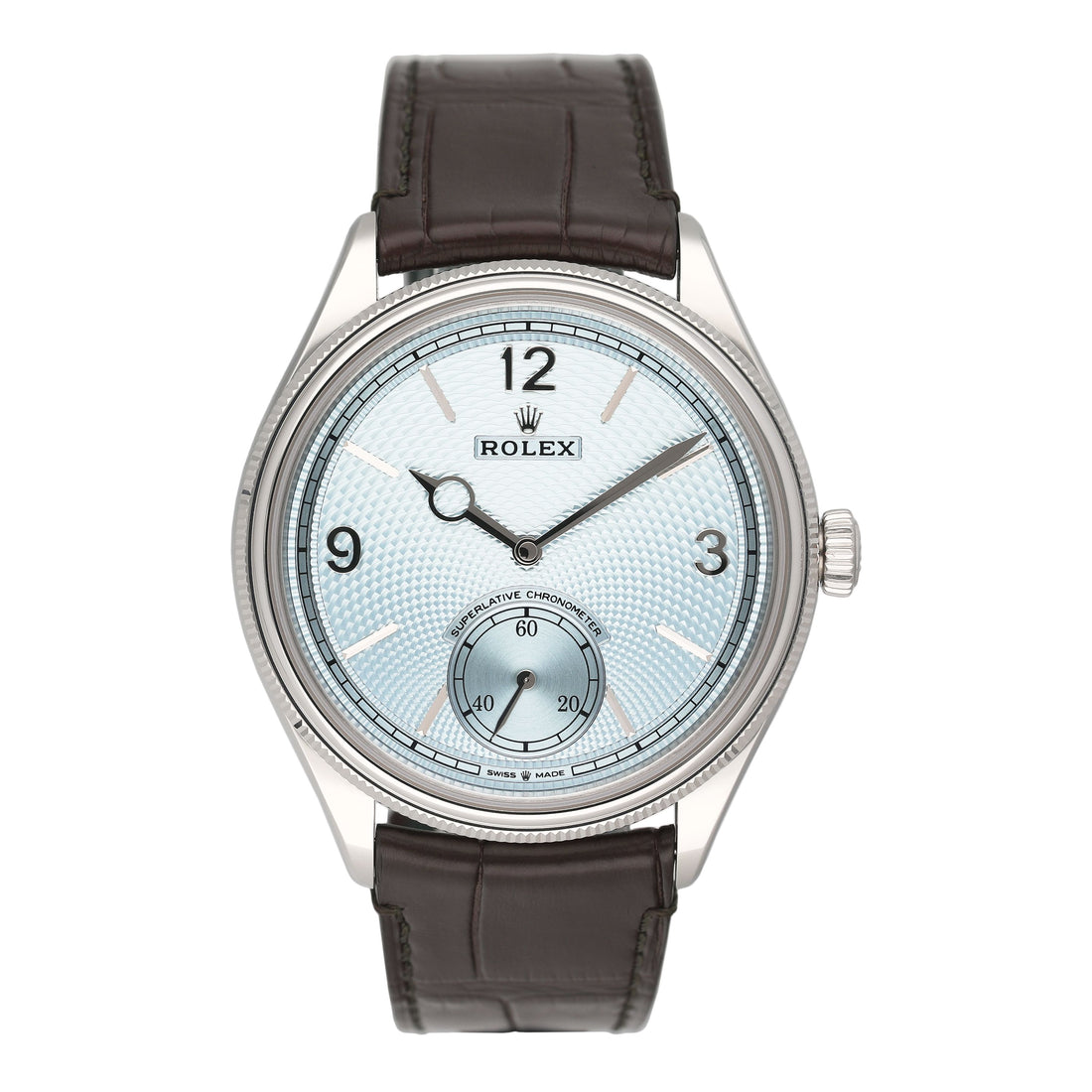 Rolex 1908 Ice Blue Dial Platinum Mens Watch. 39mm Platinum case. Platinum Domed and Fluted bezel. Ice blue guilloché rice-grain motif dial with 18k white gold hands and Arabic numerals and index hour markers. Small seconds counter at 6 o’clock. Minute maker on the outer dial. Brown leather strap with platinum double folding clasp. Will fit up to a 7.5-inch wrist. Sapphire crystal. Transparent sapphire crystal case back. Automatic self-winding movement. This watch comes with the original Box and Papers.
