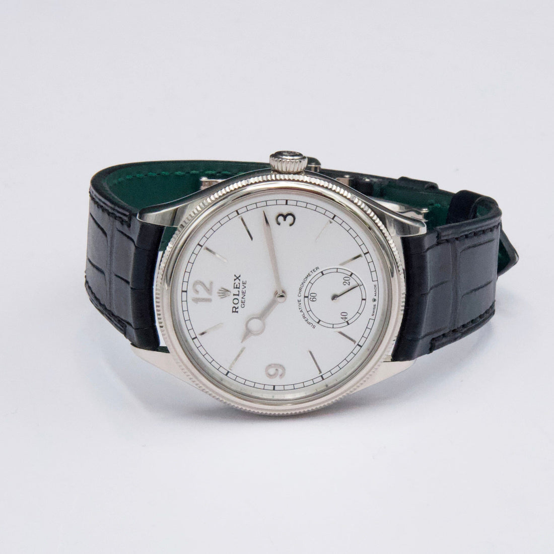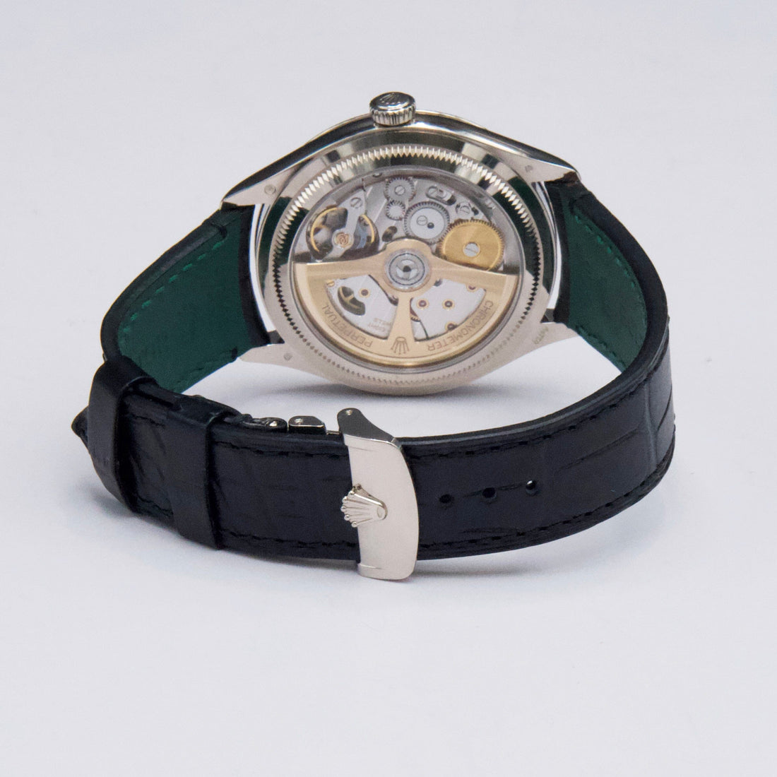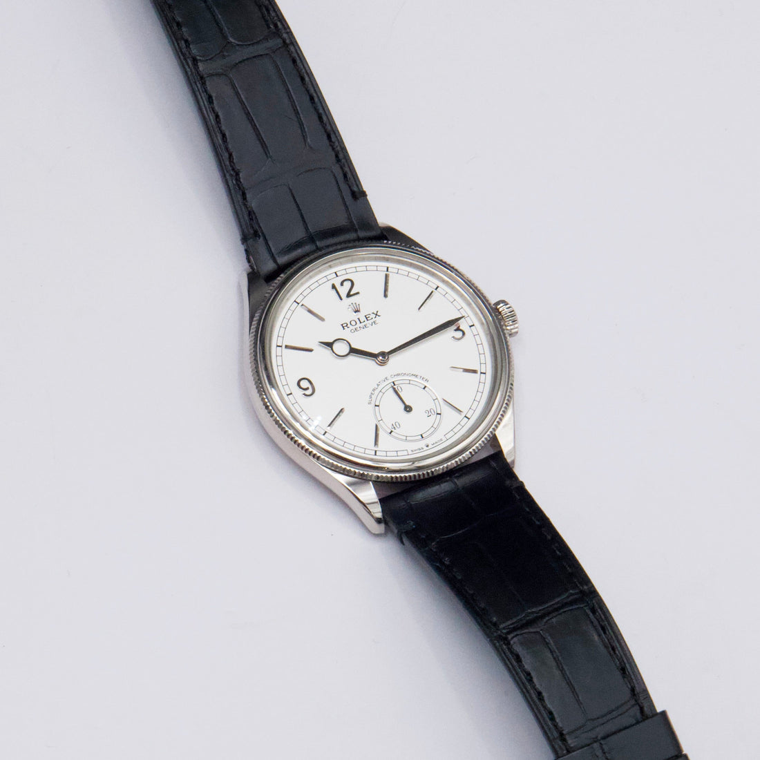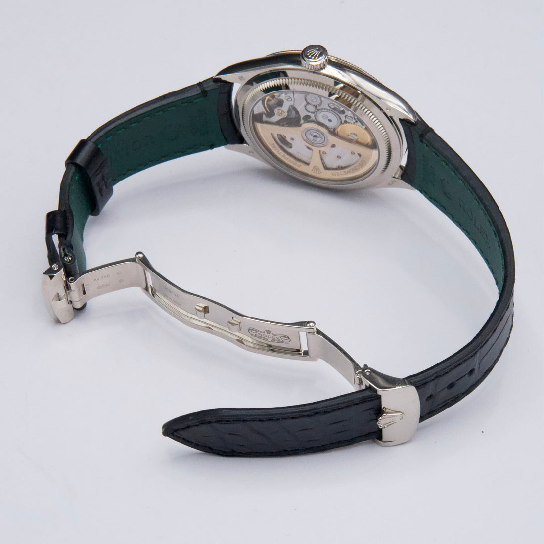 Rolex 1908 Mens Watch. 39mm 18K white gold case. 18K white gold Domed and Fluted bezel. Intense white dial with 18K white gold hands and Arabic numerals and index hour markers. Small seconds counter at 6 o’clock. Minute maker on the outer dial. Black leather strap with 18K white gold deployment clasp. Will fit up to a 7.5-inch wrist. Sapphire crystal. Transparent sapphire crystal case back. Automatic self-winding movement. This watch comes with the original Box and Papers.