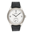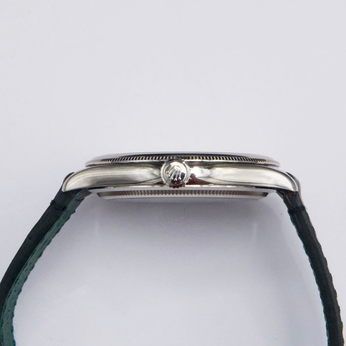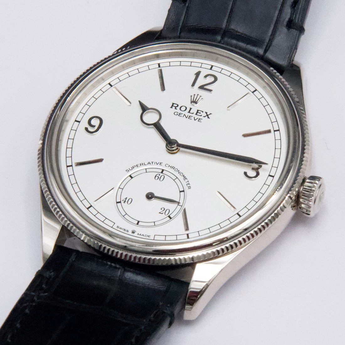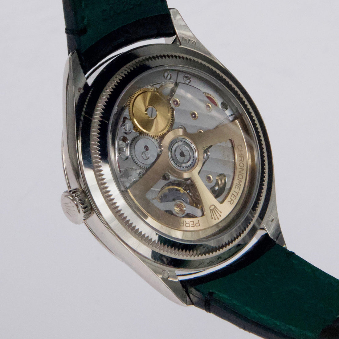 Rolex 1908 Mens Watch. 39mm 18K white gold case. 18K white gold Domed and Fluted bezel. Intense white dial with 18K white gold hands and Arabic numerals and index hour markers. Small seconds counter at 6 o’clock. Minute maker on the outer dial. Black leather strap with 18K white gold deployment clasp. Will fit up to a 7.5-inch wrist. Sapphire crystal. Transparent sapphire crystal case back. Automatic self-winding movement. This watch comes with the original Box and Papers.